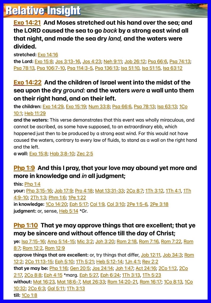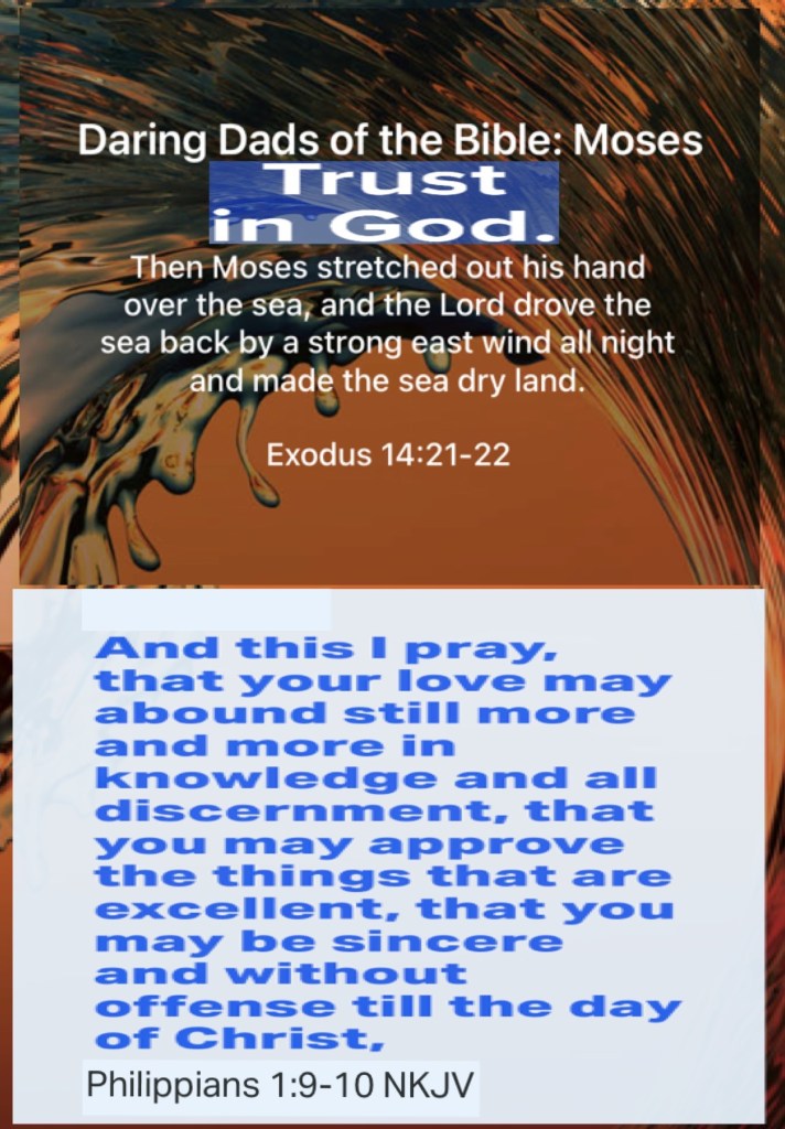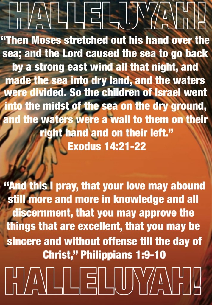 “Then Moses stretched out his hand over the sea; and the Lord caused the sea to go back by a strong east wind all that night, and made the sea into dry land, and the waters were divided. So the children of Israel went into the midst of the sea on the dry ground, and the waters were a wall to them on their right hand and on their left.”Exodus 14:21-22 “And this I pray, that your love may abound still more and more in knowledge and all discernment, that you may approve the things that are excellent, that you may be sincere and without offense till the day of Christ,” Philippians 1:9-10