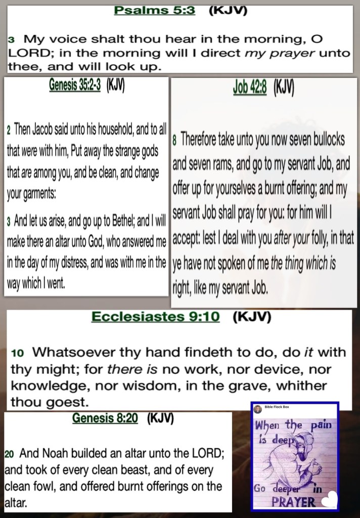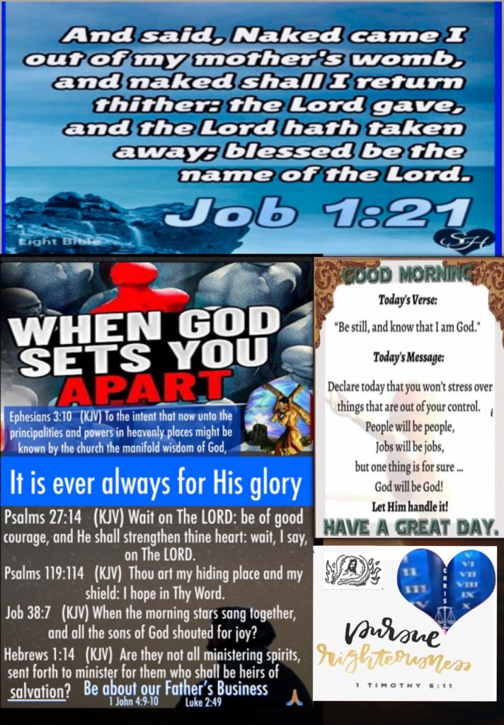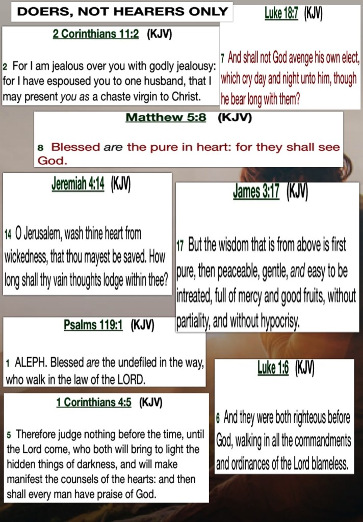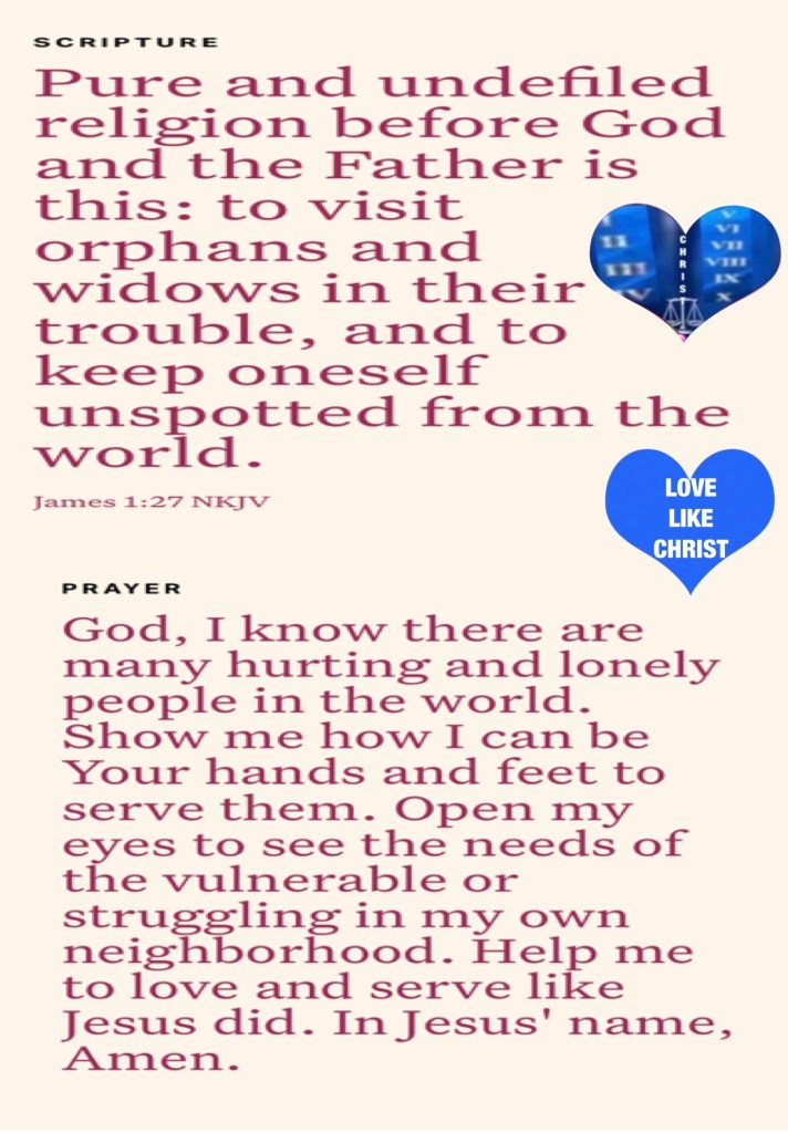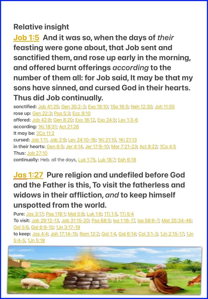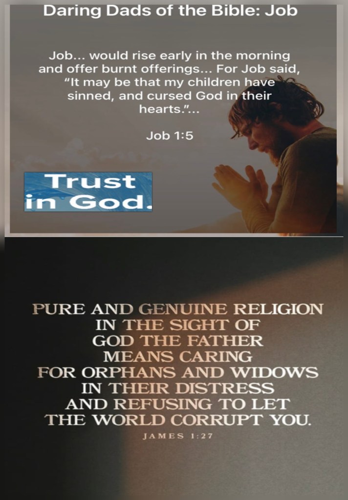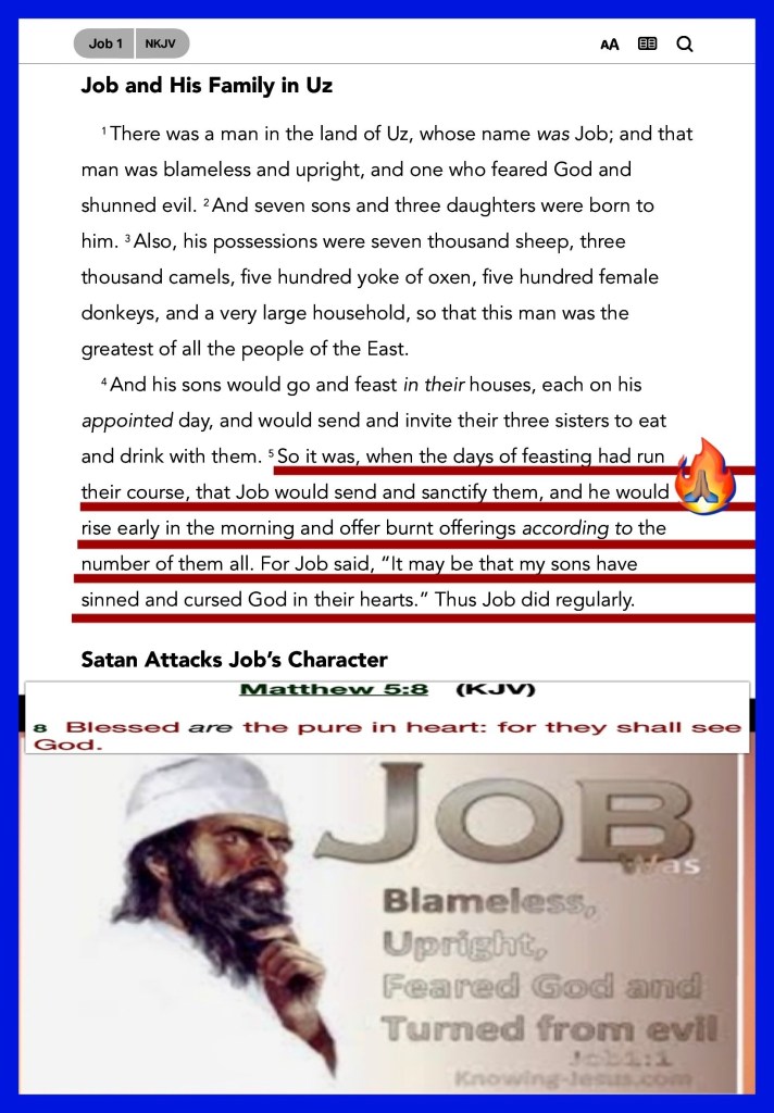 “So it was, when the days of feasting had run their course, that Job would send and sanctify them, and he would rise early in the morning and offer burnt offerings according to the number of them all. For Job said, “It may be that my sons have sinned and cursed God in their hearts.” Thus Job did regularly.” Job 1:5 “Pure and undefiled religion before God and the Father is this: to visit orphans and widows in their trouble, and to keep oneself unspotted from the world.” James 1:27