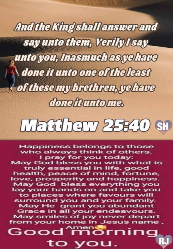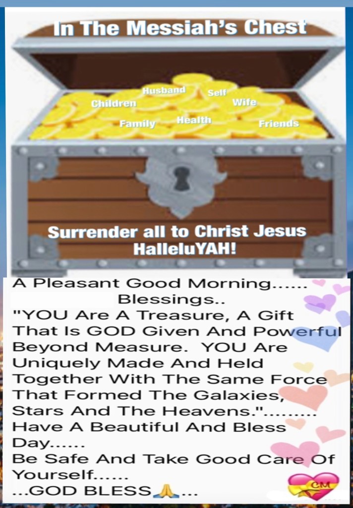 Happy New week: BeLoved Blanketed Filled with The Fruits of The Love of YAH, walk in It, live in It and Return It in Acts of Love: Worship: Faith to our Loving Worthy Heavenly FATHER, Glorify YAH by Sharing Your Good Treasure with those whom The RUACH HA’QUODESH : The HOLY SPIRIT Of YAH has impressed you to do so and Be a Blessing, take care GOD BLESS. HalleluYAH!