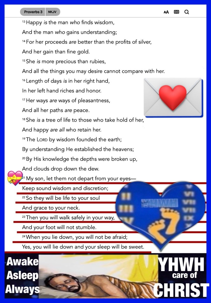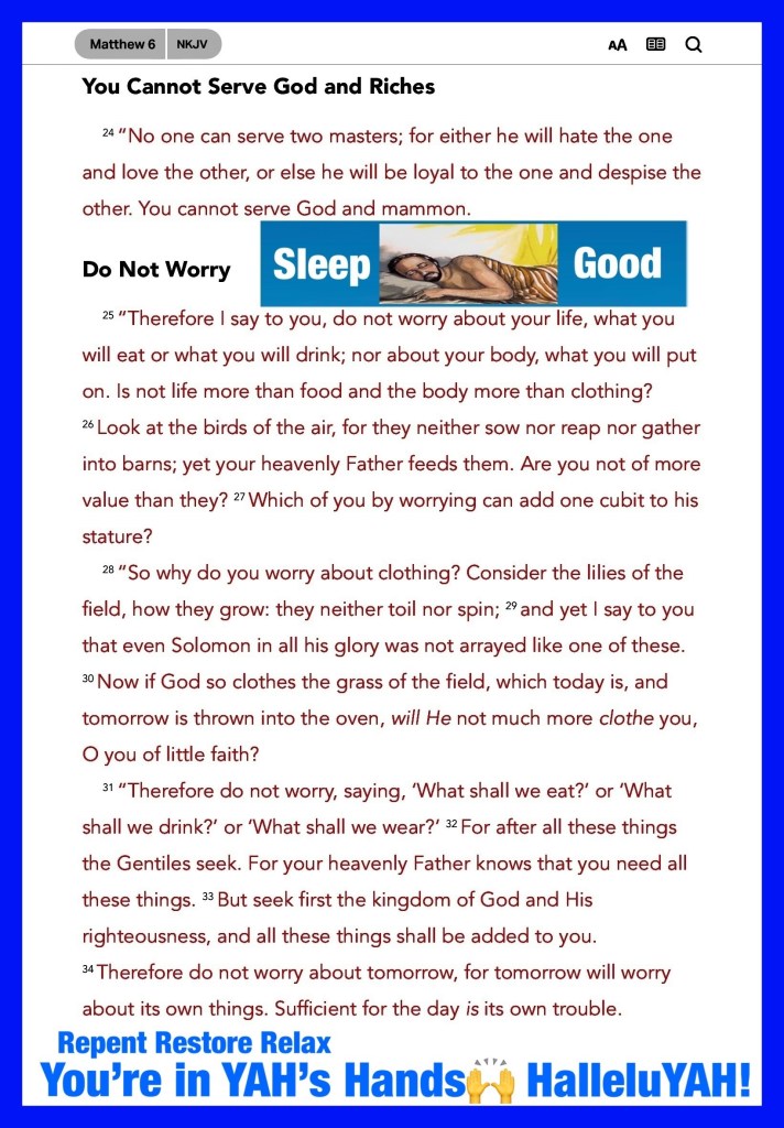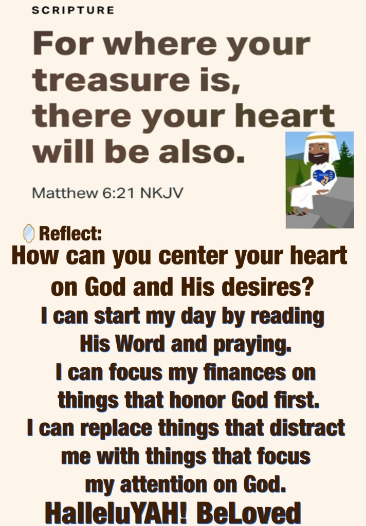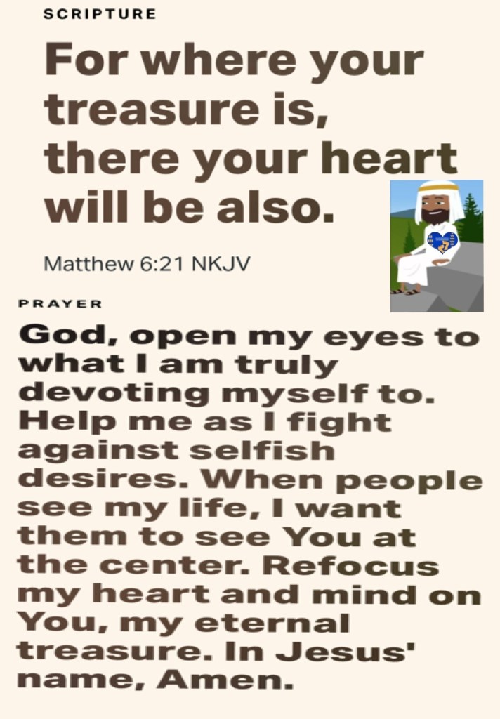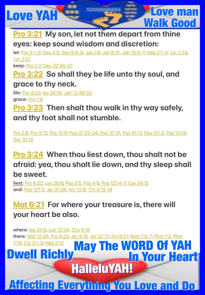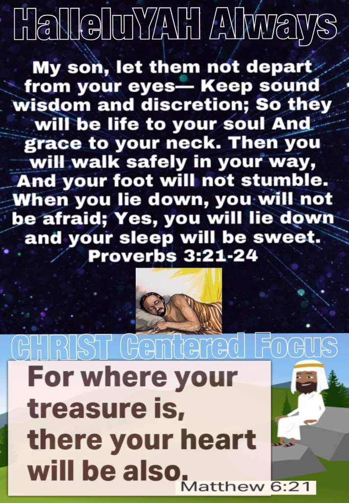 “My son, let them not depart from your eyes— Keep sound wisdom and discretion; So they will be life to your soul And grace to your neck. Then you will walk safely in your way, And your foot will not stumble. When you lie down, you will not be afraid; Yes, you will lie down and your sleep will be sweet.” Proverbs 3:21-24 “For where your treasure is, there your heart will be also.” Matthew 6:21