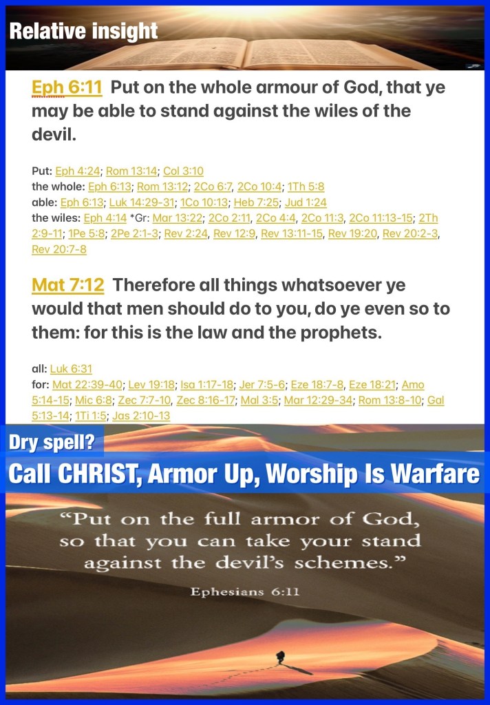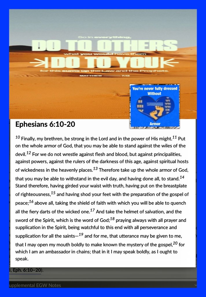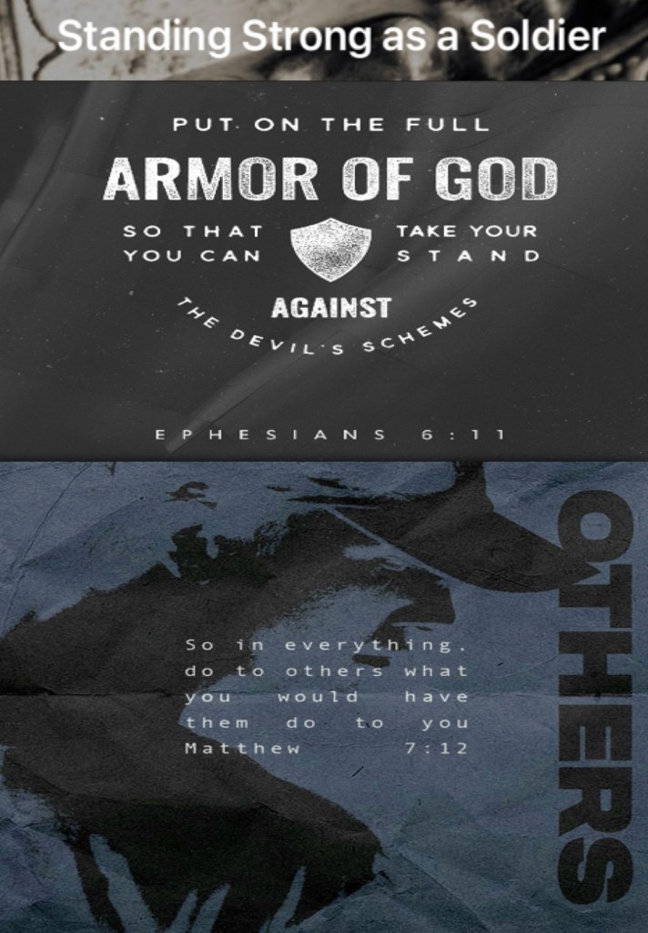 “Put on the whole armor of God, that you may be able to stand against the wiles of the devil.” Ephesians 6:11 “Therefore, whatever you want men to do to you, do also to them, for this is the Law and the Prophets.” Matthew 7:12