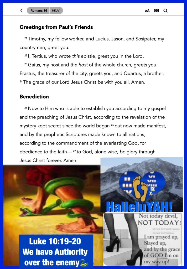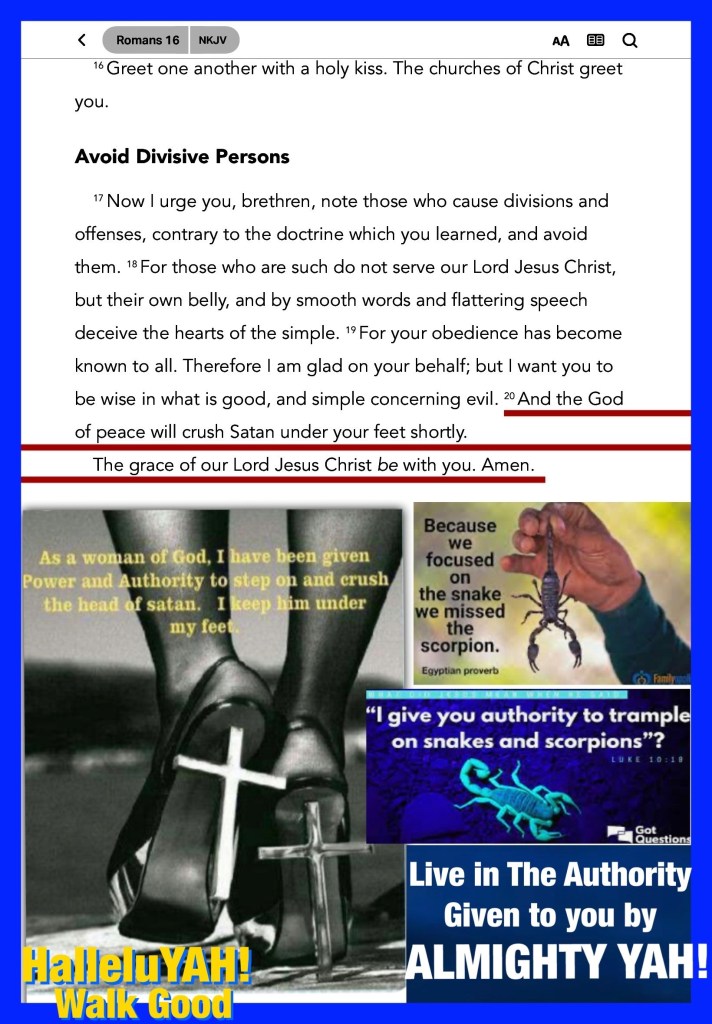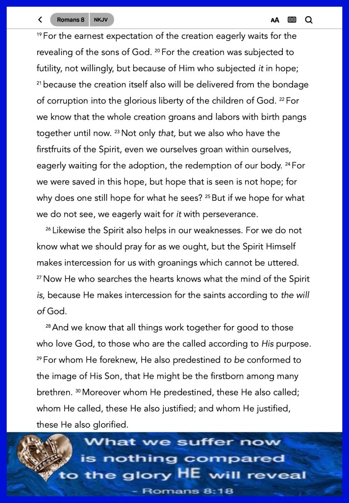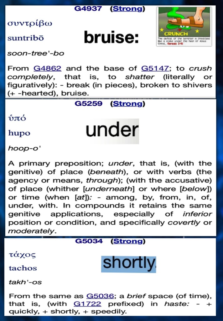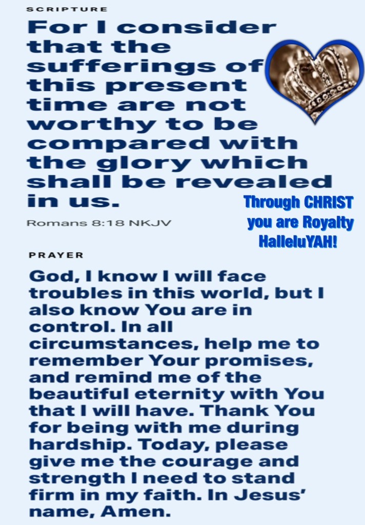 “And the God of peace will crush Satan under your feet shortly. The grace of our Lord Jesus Christ be with you. Amen.” Romans 16:20 “For I consider that the sufferings of this present time are not worthy to be compared with the glory which shall be revealed in us.” Romans 8:18