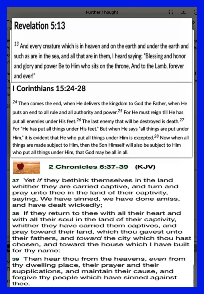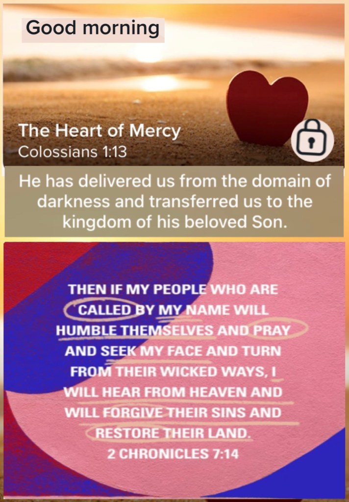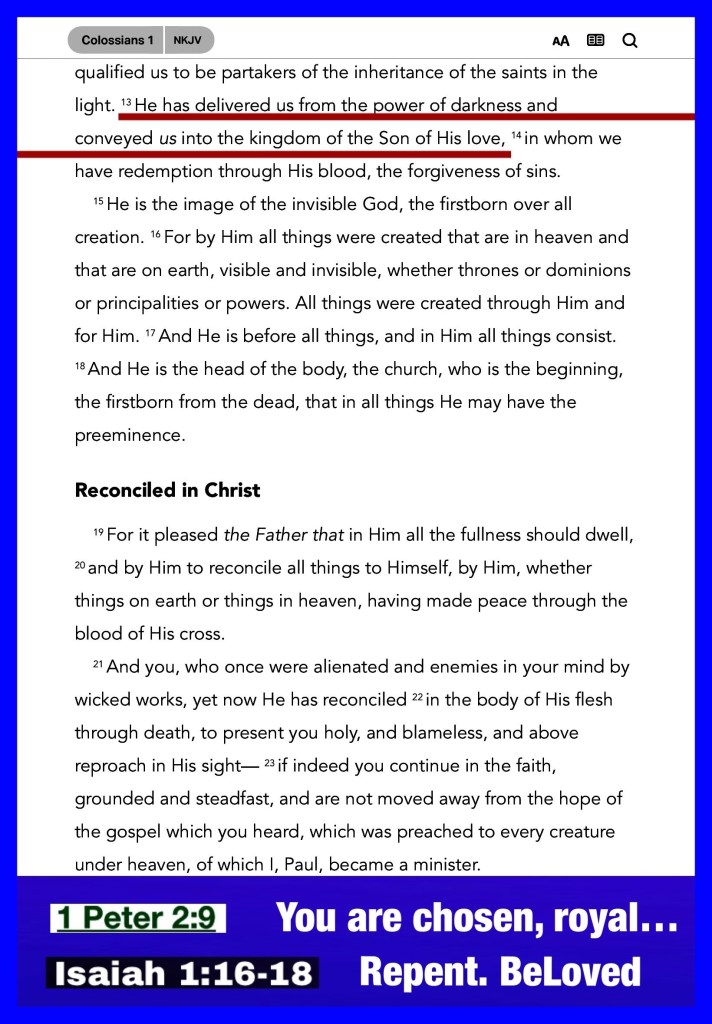 “He has delivered us from the power of darkness and conveyed us into the kingdom of the Son of His love,” Colossians 1:13 “if My people who are called by My name will humble themselves, and pray and seek My face, and turn from their wicked ways, then I will hear from heaven, and will forgive their sin and heal their land.” II Chronicles 7:14