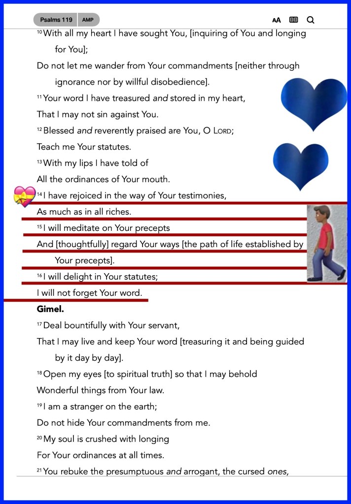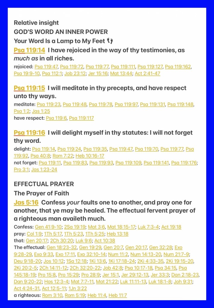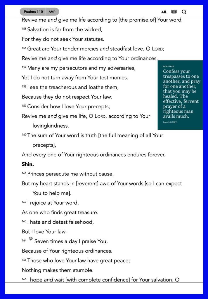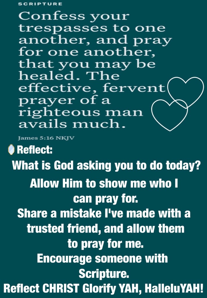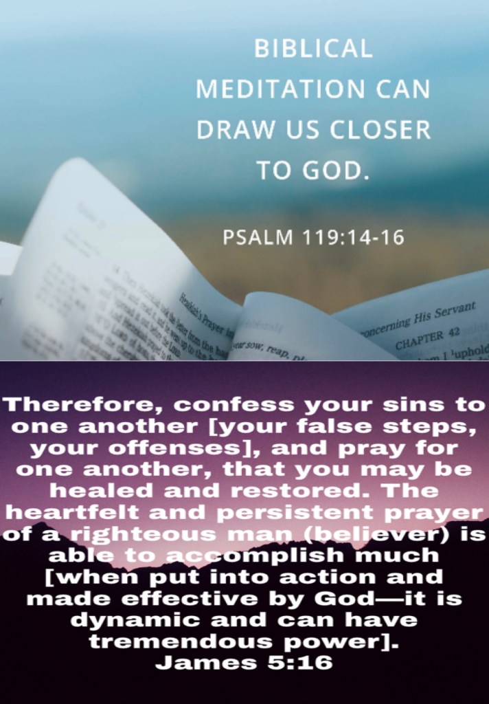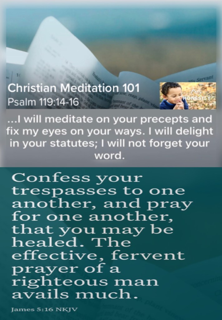 “I have rejoiced in the way of Your testimonies, As much as in all riches. I will meditate on Your precepts, And contemplate Your ways. I will delight myself in Your statutes; I will not forget Your word.” Psalms 119:14-16 “Confess your trespasses to one another, and pray for one another, that you may be healed. The effective, fervent prayer of a righteous man avails much.” James 5:16