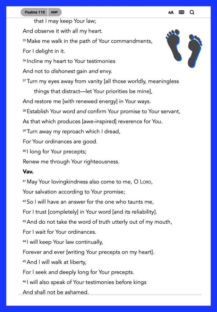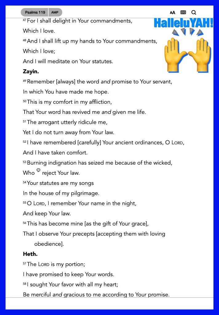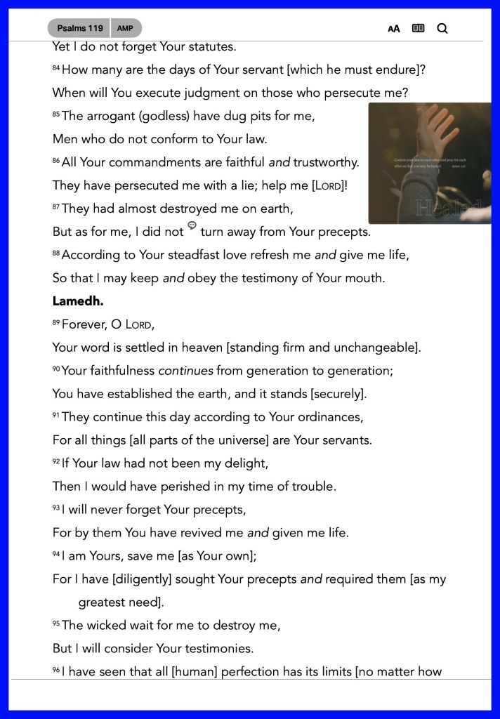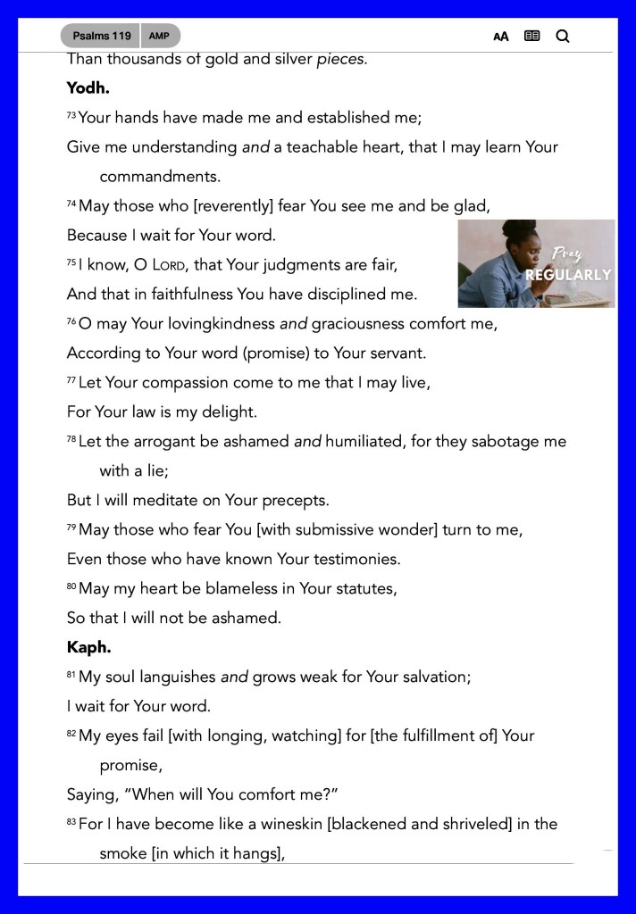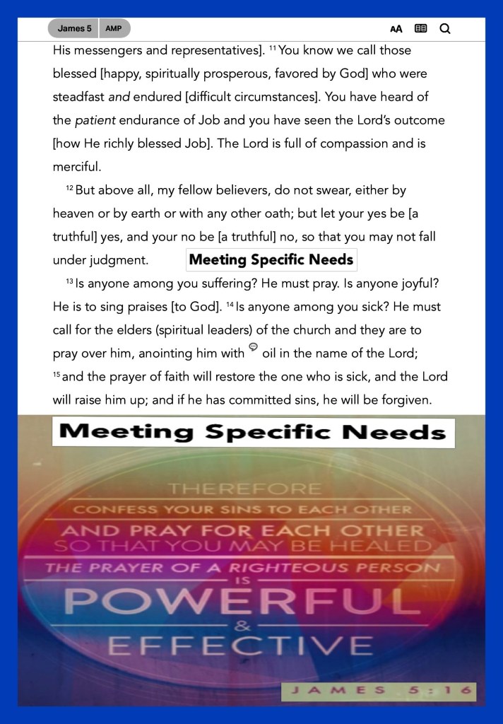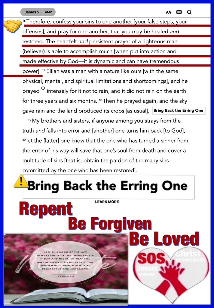 “I have rejoiced in the way of Your testimonies, As much as in all riches. I will meditate on Your precepts, And contemplate Your ways. I will delight myself in Your statutes; I will not forget Your word.” Psalms 119:14-16 “Confess your trespasses to one another, and pray for one another, that you may be healed. The effective, fervent prayer of a righteous man avails much.” James 5:16