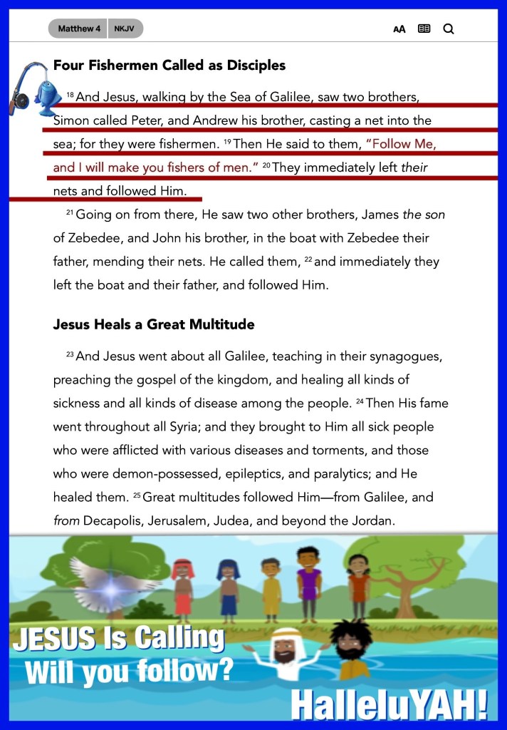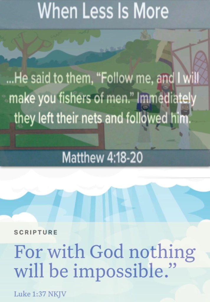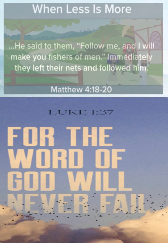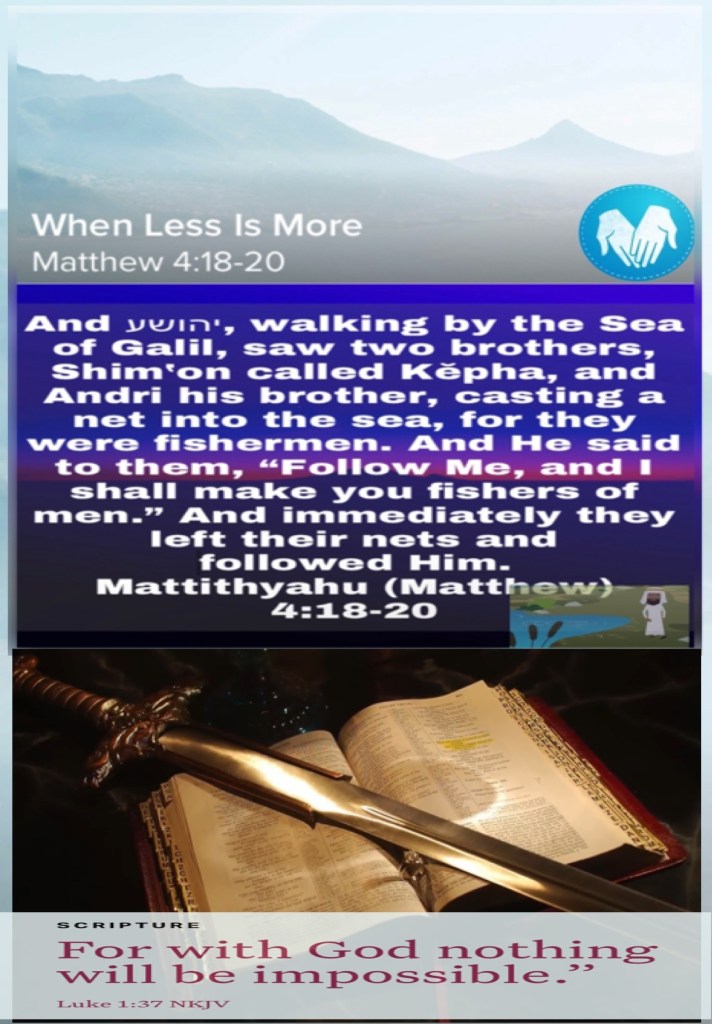 “And Jesus, walking by the Sea of Galilee, saw two brothers, Simon called Peter, and Andrew his brother, casting a net into the sea; for they were fishermen. Then He said to them, “Follow Me, and I will make you fishers of men.” They immediately left their nets and followed Him.” Matthew 4:18-20 “For with God nothing will be impossible.”” Luke 1:37