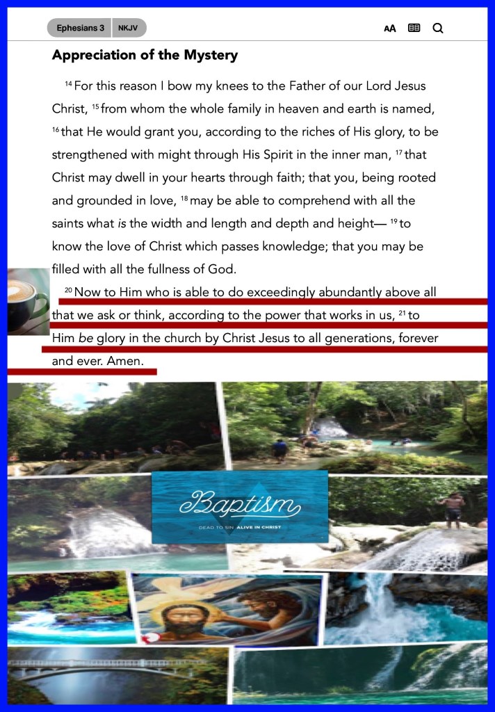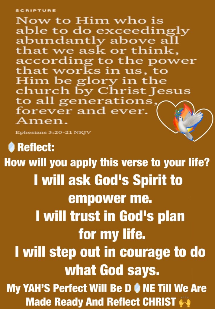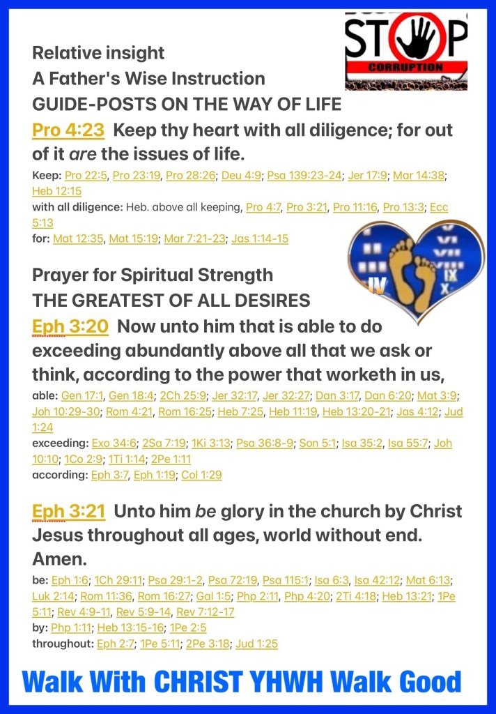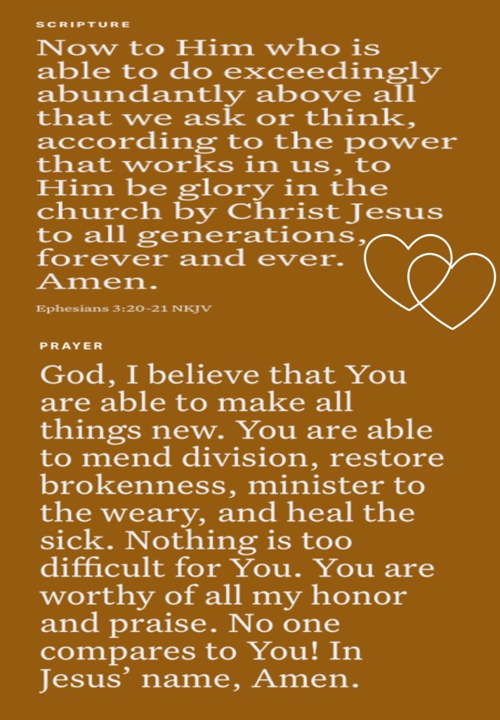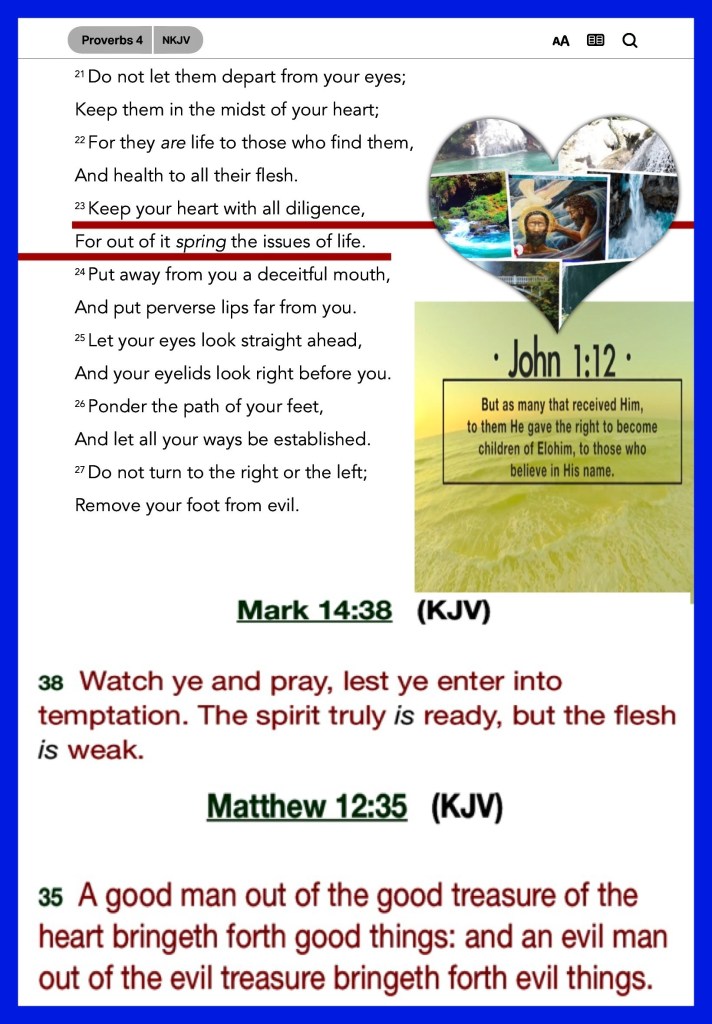 “Keep your heart with all diligence, For out of it spring the issues of life.” Proverbs 4:23 “Now to Him who is able to do exceedingly abundantly above all that we ask or think, according to the power that works in us, to Him be glory in the church by Christ Jesus to all generations, forever and ever. Amen.” Ephesians 3:20-21