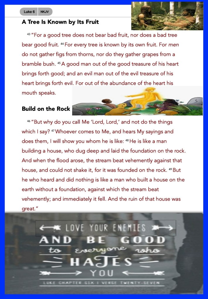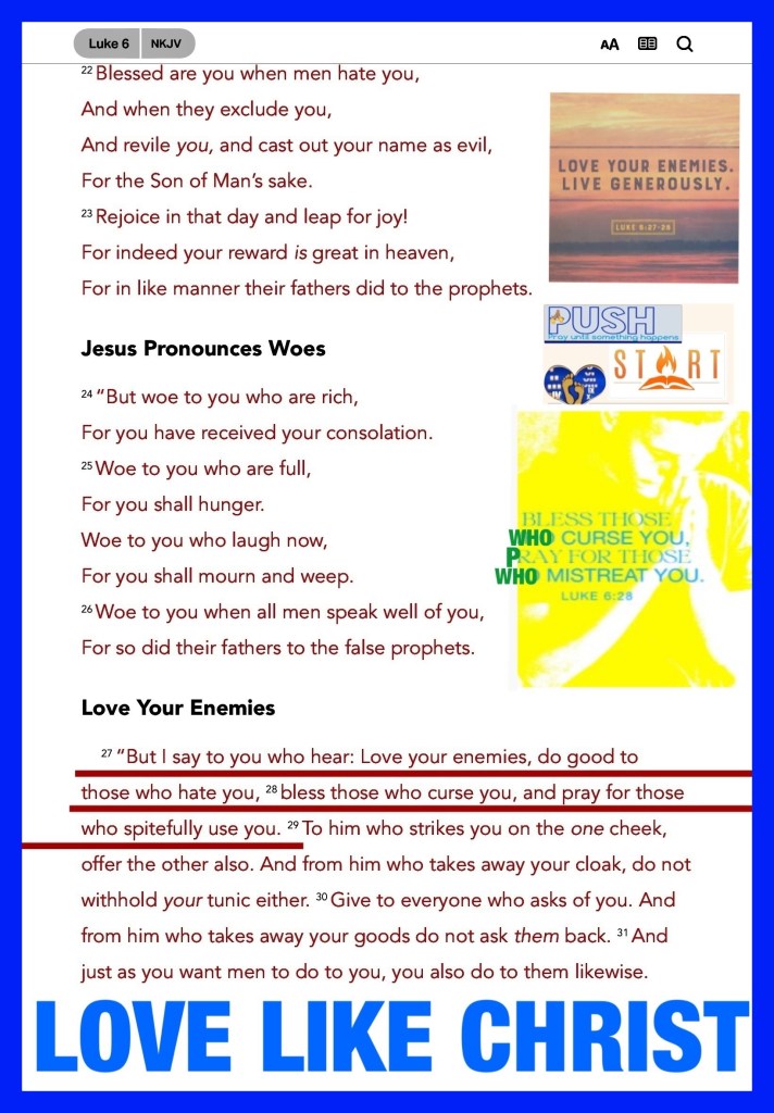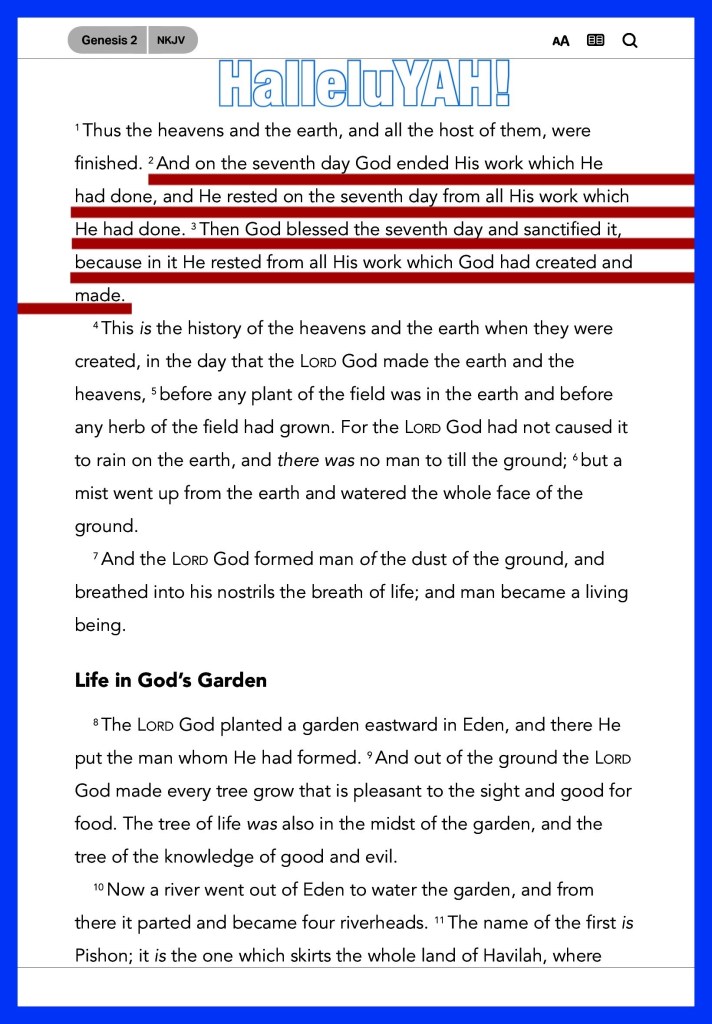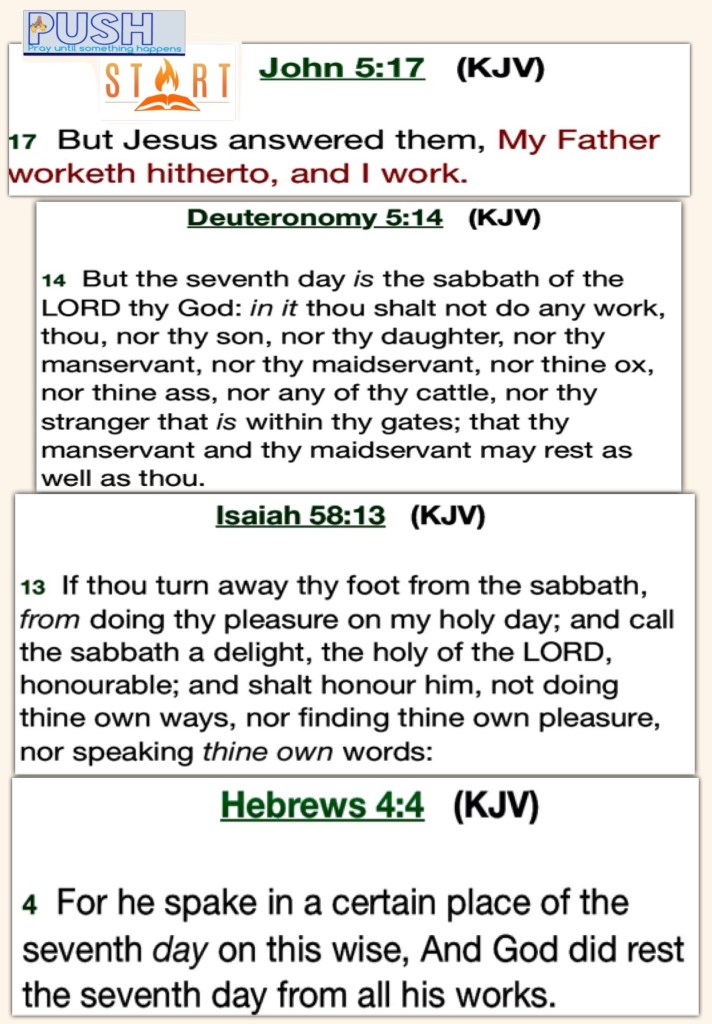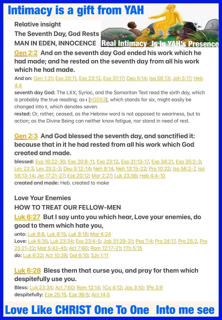 “And on the seventh day God ended His work which He had done, and He rested on the seventh day from all His work which He had done. Then God blessed the seventh day and sanctified it, because in it He rested from all His work which God had created and made.” Genesis 2:2-3 ““But I say to you who hear: Love your enemies, do good to those who hate you, bless those who curse you, and pray for those who spitefully use you.” Luke 6:27-28