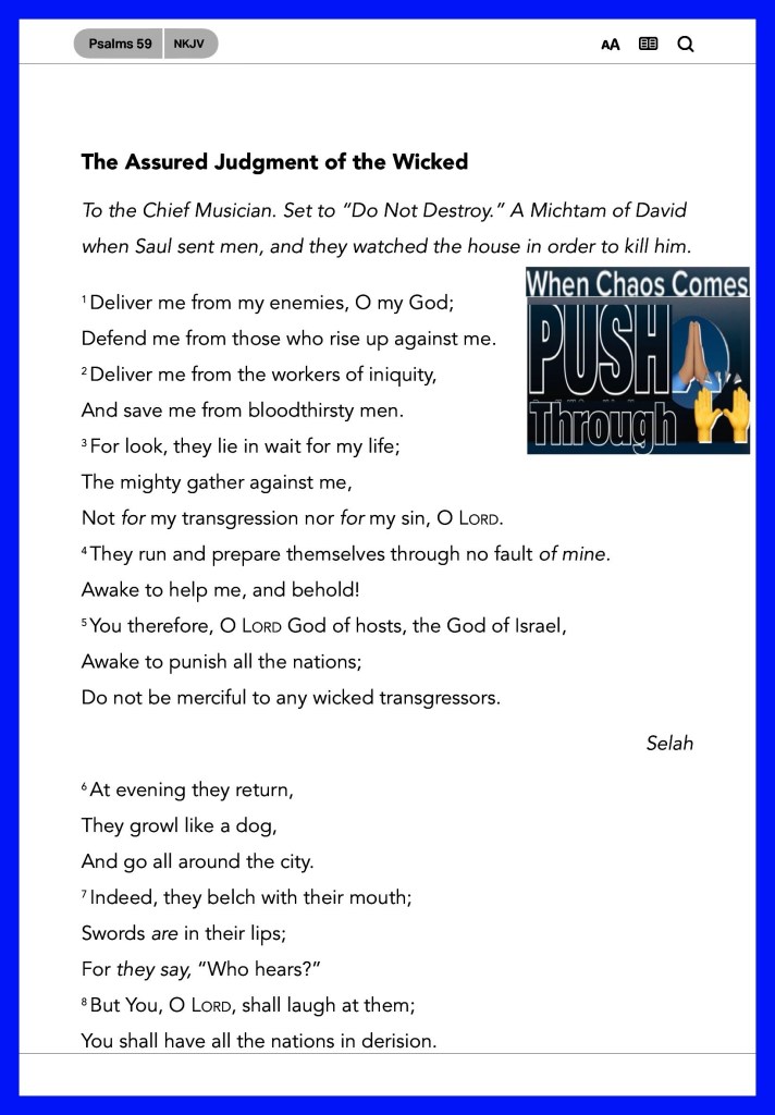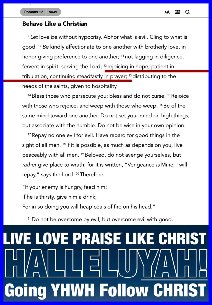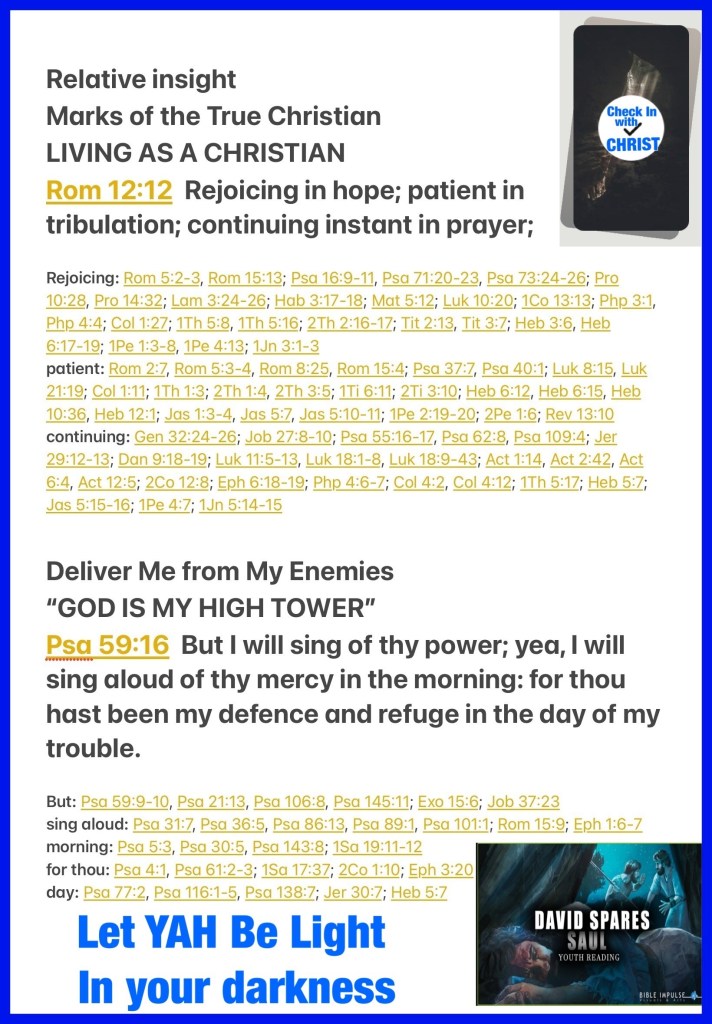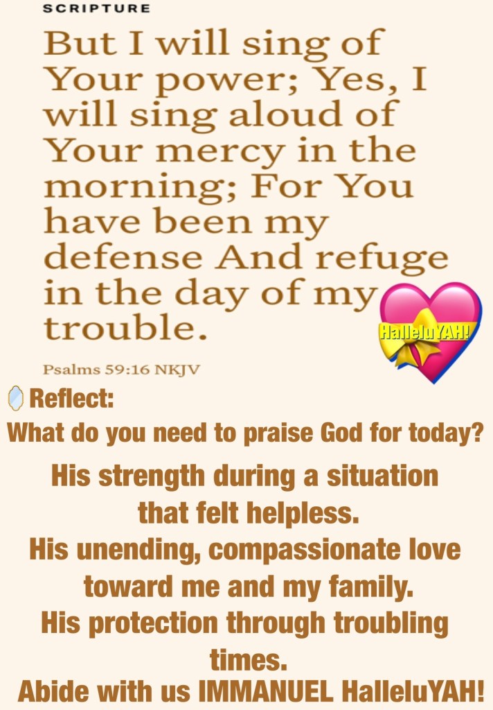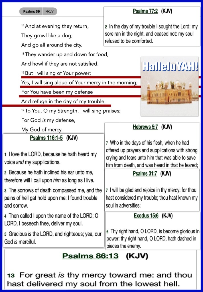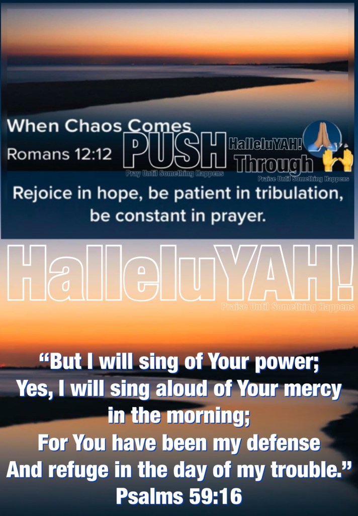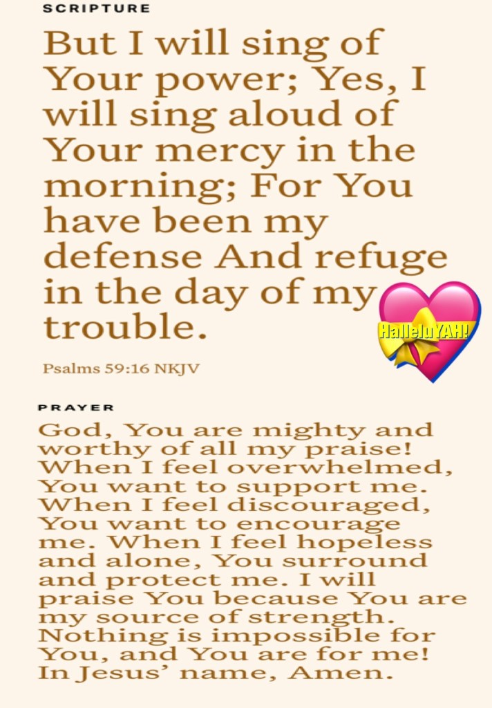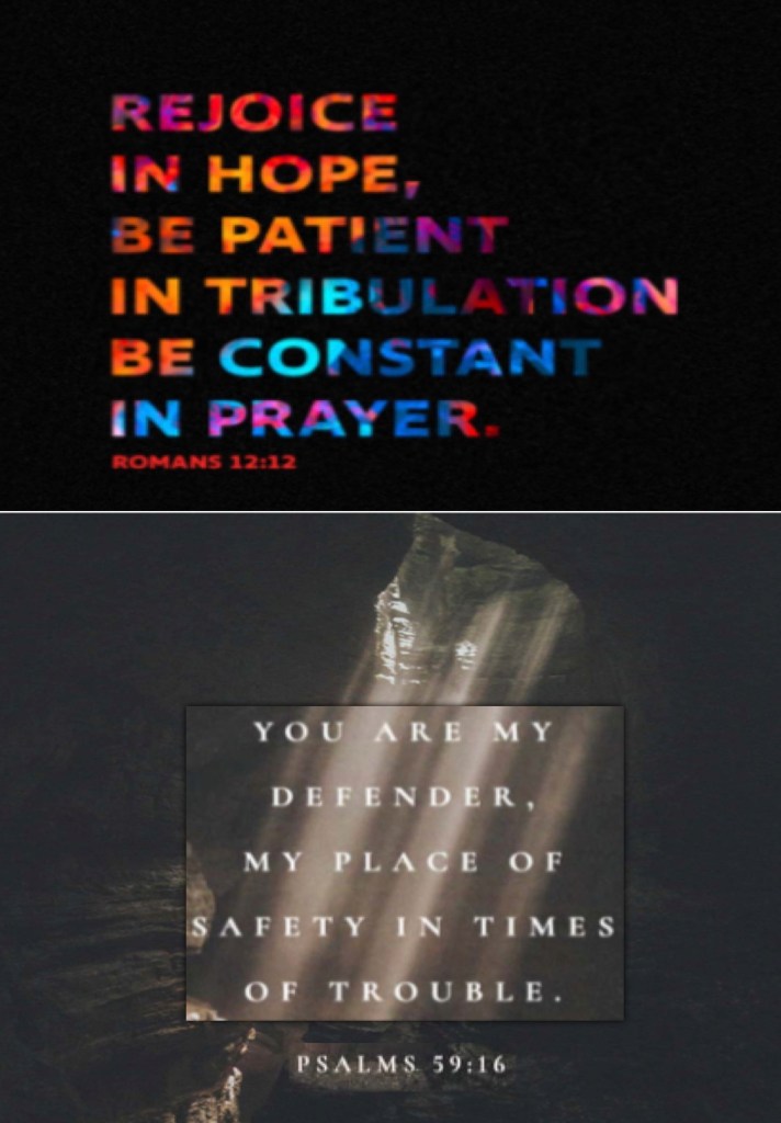“rejoicing in hope, patient in tribulation, continuing steadfastly in prayer;” Romans 12:12 “But I will sing of Your power; Yes, I will sing aloud of Your mercy in the morning; For You have been my defense And refuge in the day of my trouble.” Psalms 59:16