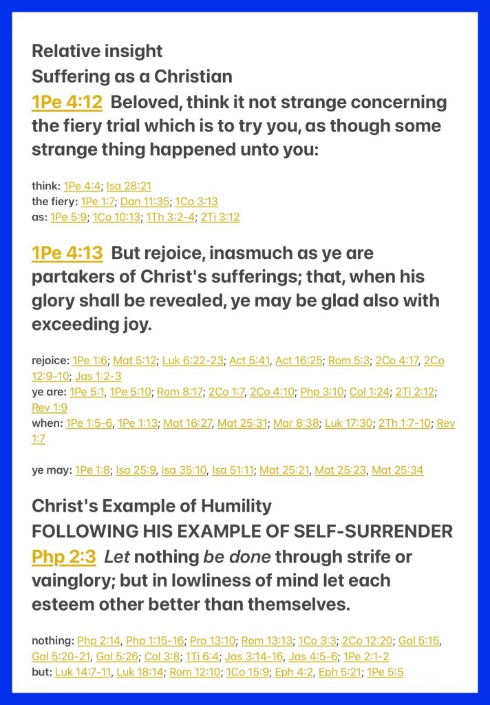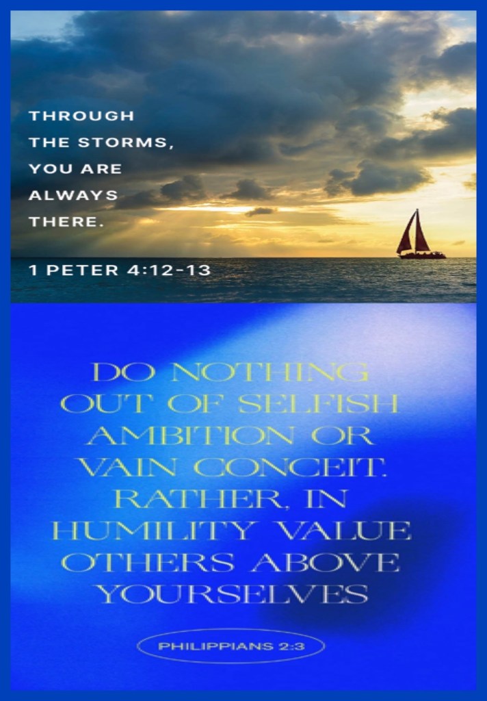 “Beloved, think it not strange concerning the fiery trial which is to try you, as though some strange thing happened unto you: but rejoice, inasmuch as ye are partakers of Christ’s sufferings; that, when his glory shall be revealed, ye may be glad also with exceeding joy.” 1 Peter 4:12-13 “Let nothing be done through strife or vainglory; but in lowliness of mind let each esteem other better than themselves.” Philippians 2:3