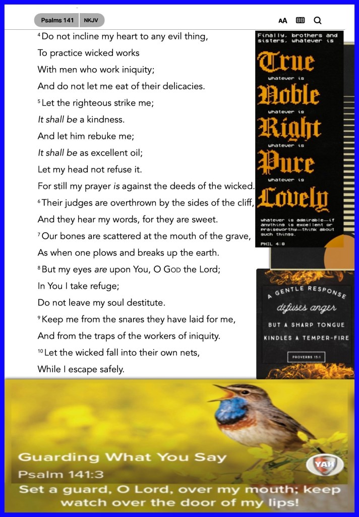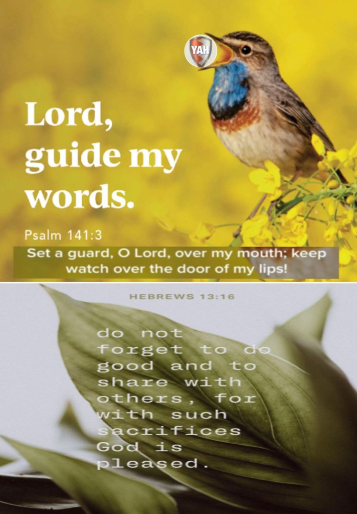“Set a guard, O Lord, over my mouth; Keep watch over the door of my lips.” Psalms 141:3 “But do not forget to do good and to share, for with such sacrifices God is well pleased.” Hebrews 13:16
