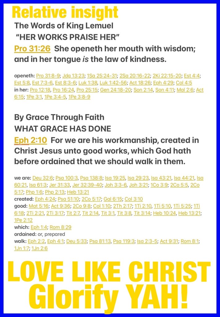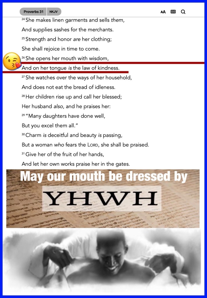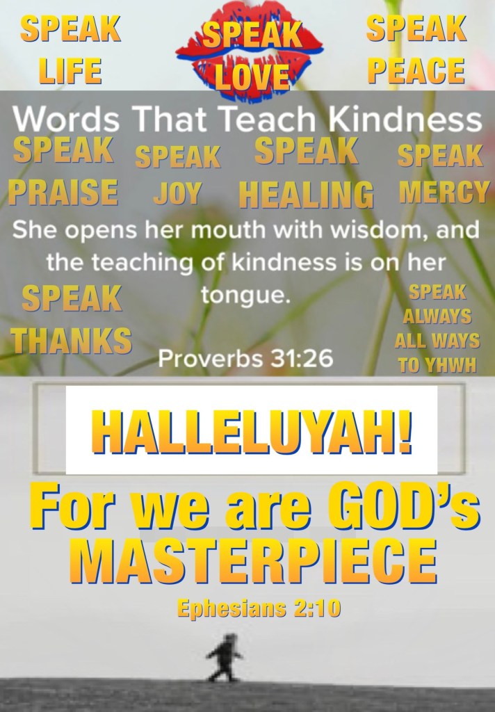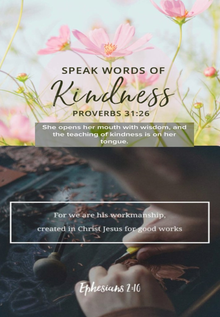 “She opens her mouth with wisdom, And on her tongue is the law of kindness.”Proverbs 31:26 “For we are His workmanship, created in Christ Jesus for good works, which God prepared beforehand that we should walk in them.” Ephesians 2:10