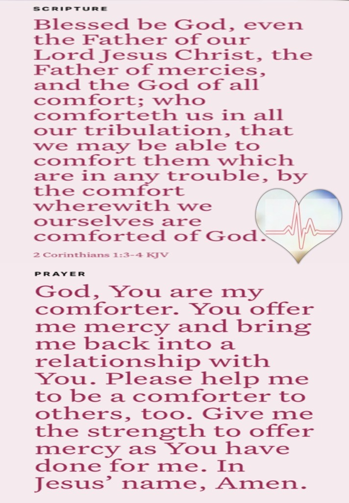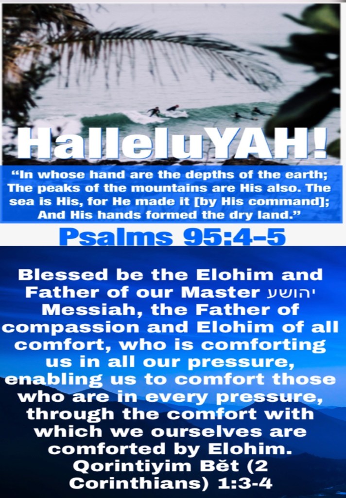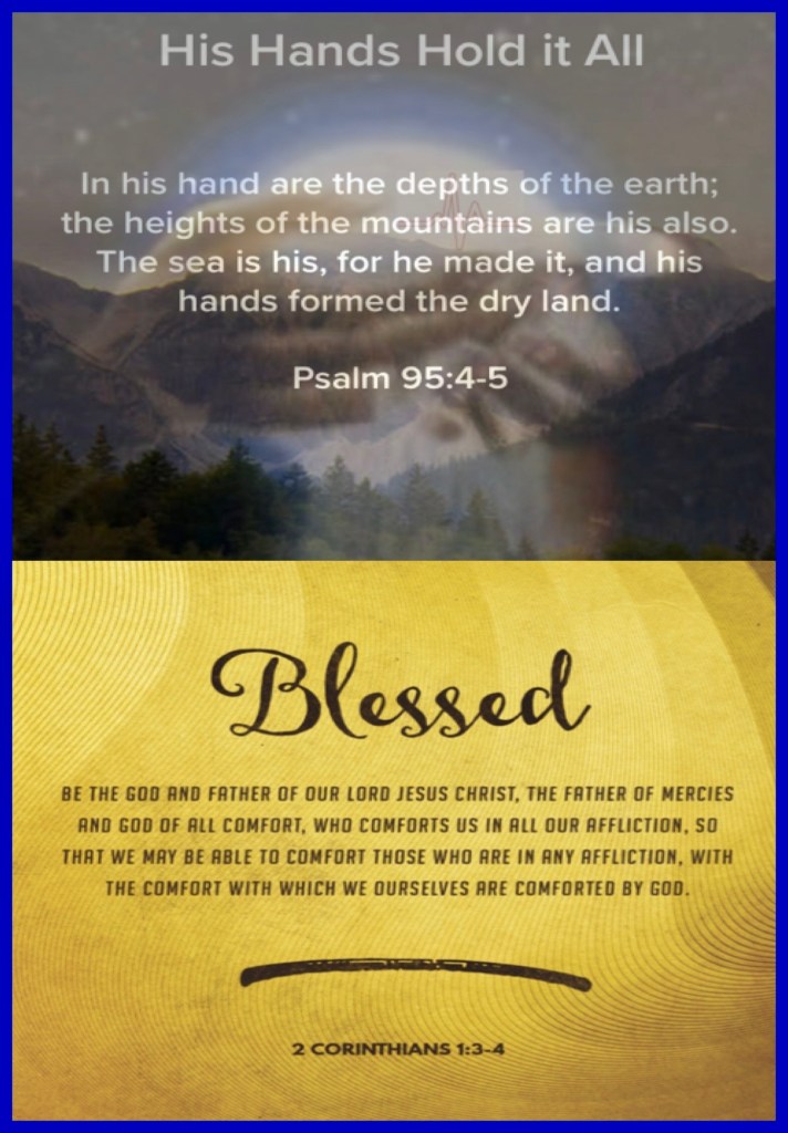 “In His hand are the deep places of the earth; The heights of the hills are His also. The sea is His, for He made it; And His hands formed the dry land.” Psalms 95:4-5 “Blessed be the God and Father of our Lord Jesus Christ, the Father of mercies and God of all comfort, who comforts us in all our tribulation, that we may be able to comfort those who are in any trouble, with the comfort with which we ourselves are comforted by God.” II Corinthians 1:3-4