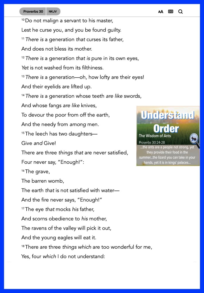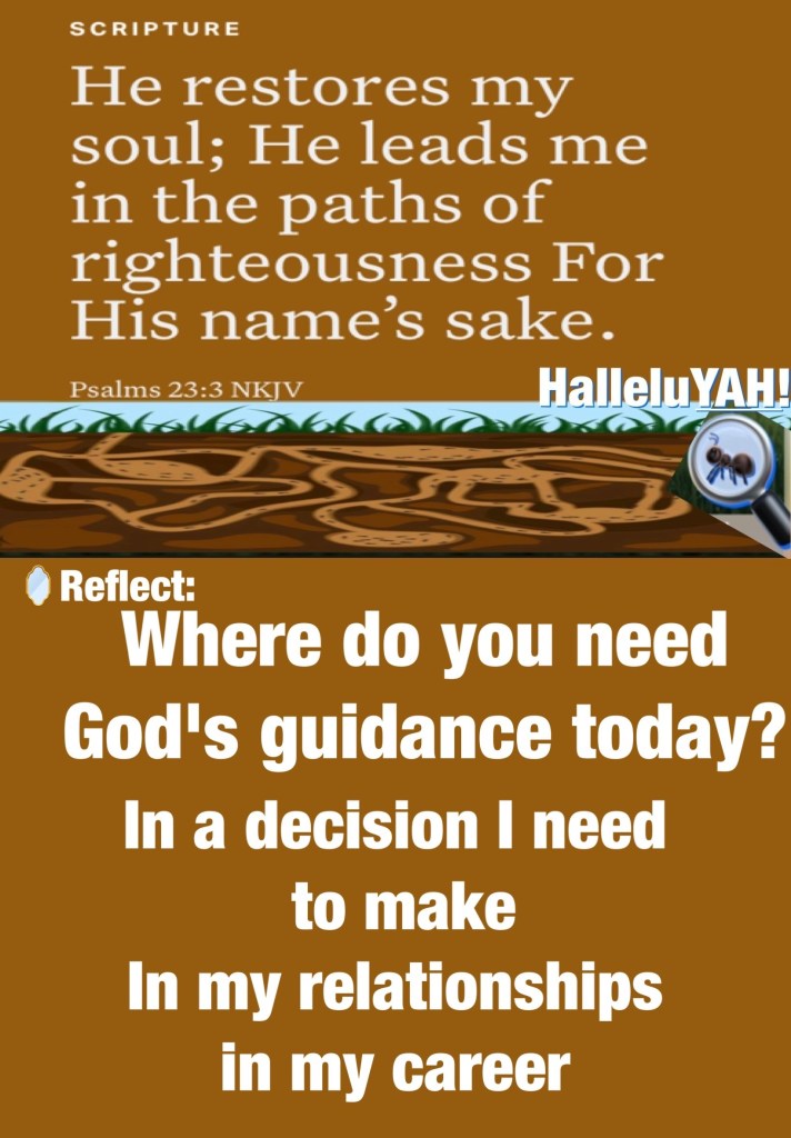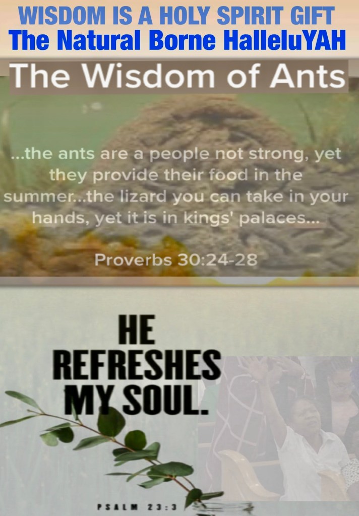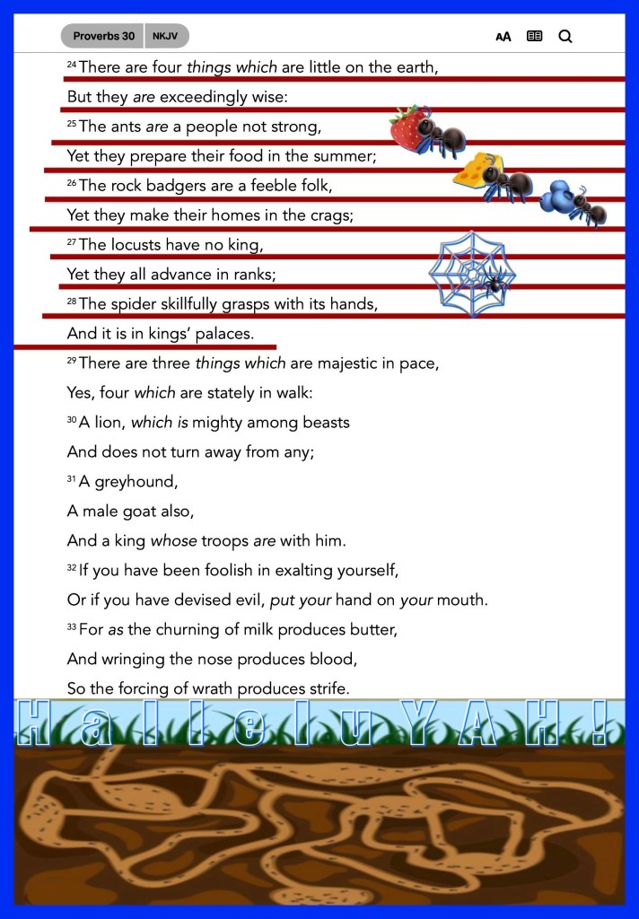 “There are four things which are little on the earth, But they are exceedingly wise: The ants are a people not strong, Yet they prepare their food in the summer; The rock badgers are a feeble folk, Yet they make their homes in the crags; The locusts have no king, Yet they all advance in ranks; The spider skillfully grasps with its hands, And it is in kings’ palaces.” Proverbs 30:24-28 “He restores my soul; He leads me in the paths of righteousness For His name’s sake.” Psalms 23:3