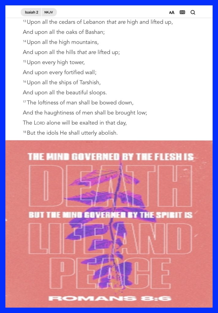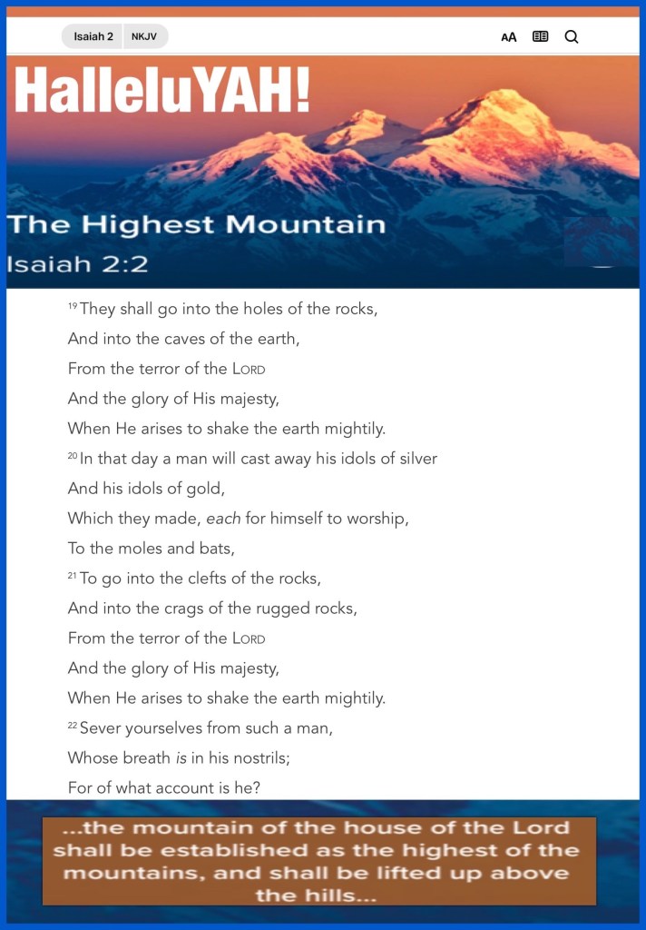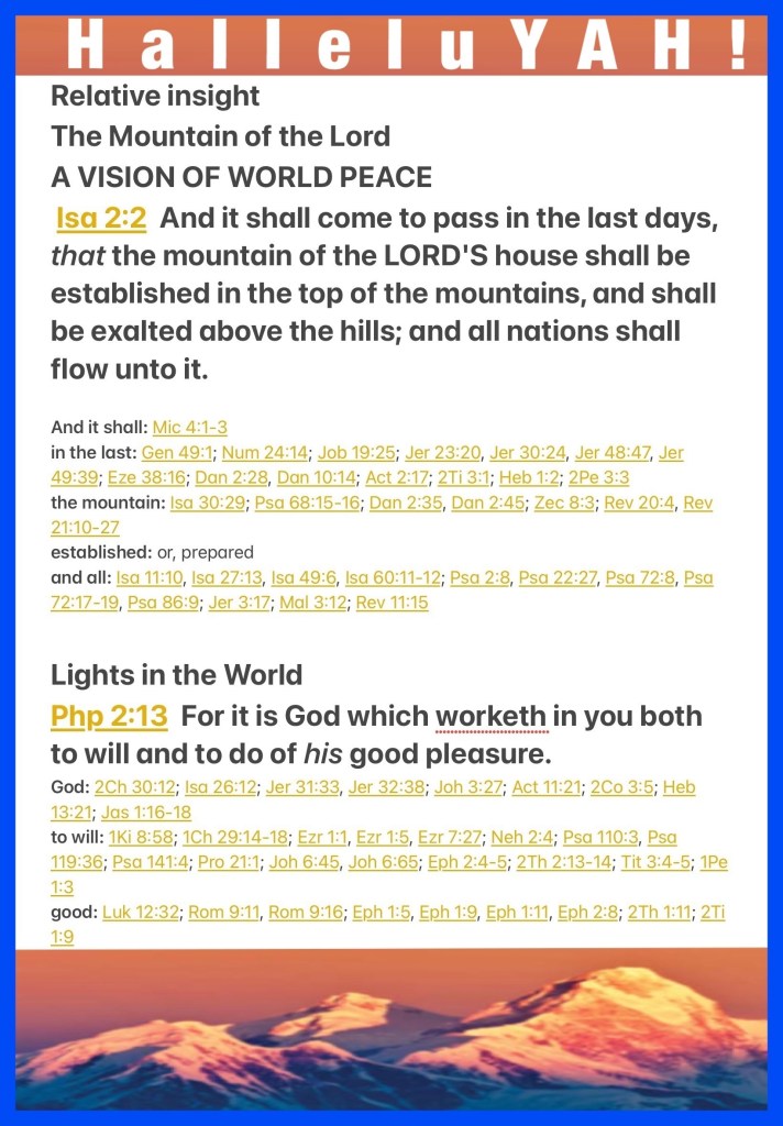 “Now it shall come to pass in the latter days That the mountain of the Lord’s house Shall be established on the top of the mountains, And shall be exalted above the hills; And all nations shall flow to it.” Isaiah 2:2 “for it is God who works in you both to will and to do for His good pleasure.” Philippians 2:13