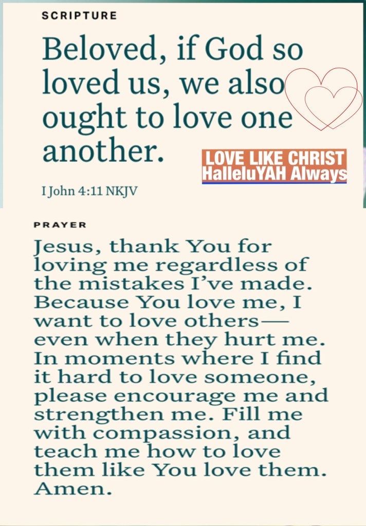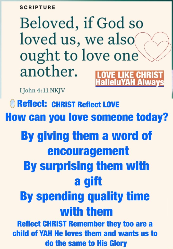 ALMIGHTY FATHER YAH You Created us to LOVE, WORSHIP, HONOR, GLORIFY You with our lives and to Love, Honor and Be Loved by one another: reflecting Your Love in practical ways. Teach us to do so in ways that glorify and bless Your Holy Name. Forgive us where we fall short, deliver us from deception, fill us with Your HOLY SPIRIT Wisdom and Discernment In JESUS CHRIST Name YAHUSHA HA’MASSIACH I pray. Amen