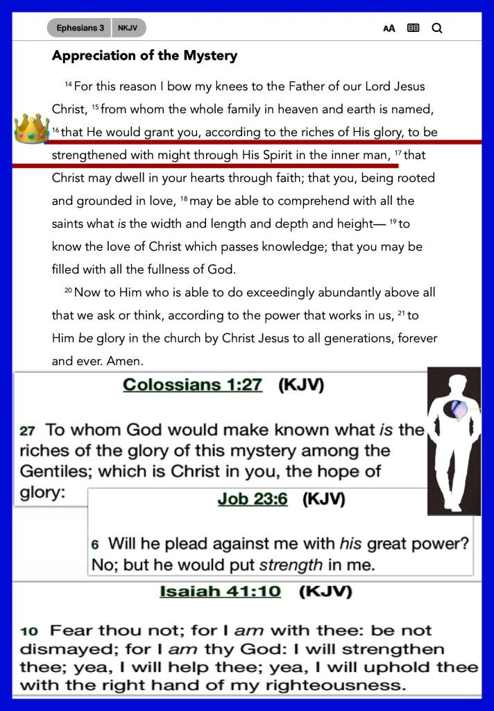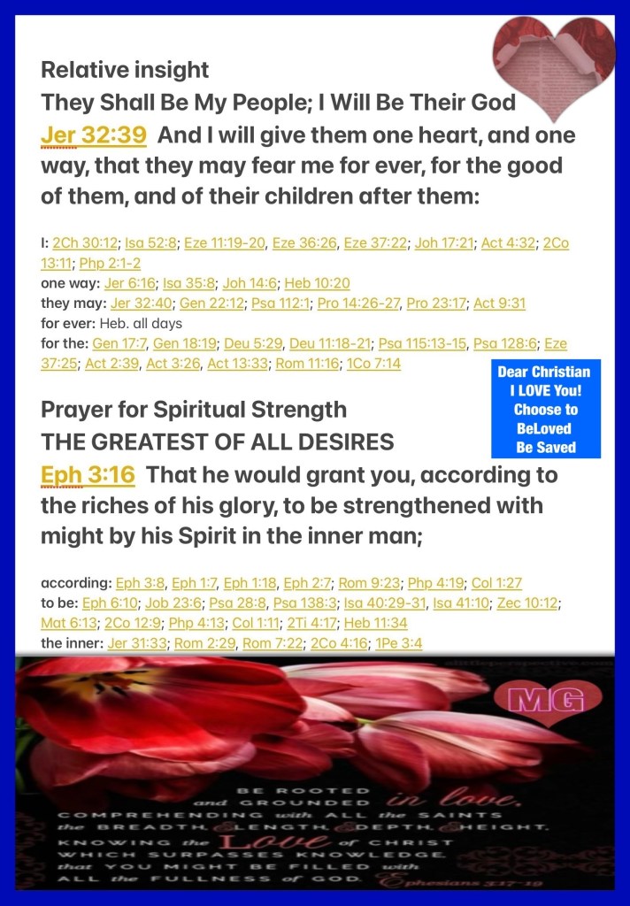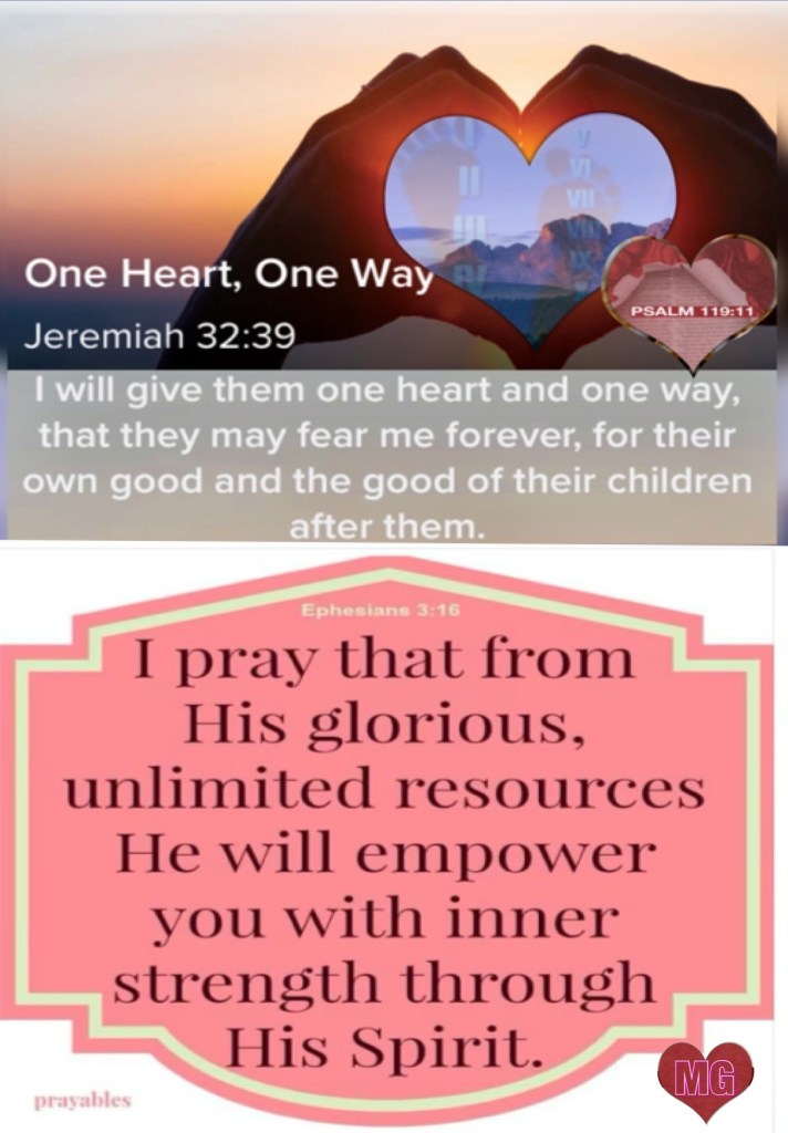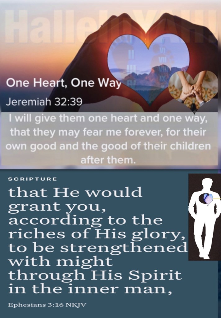 “then I will give them one heart and one way, that they may fear Me forever, for the good of them and their children after them.” Jeremiah 32:39 “that He would grant you, according to the riches of His glory, to be strengthened with might through His Spirit in the inner man,” Ephesians 3:16
