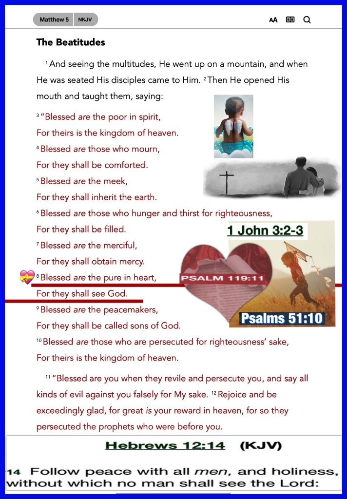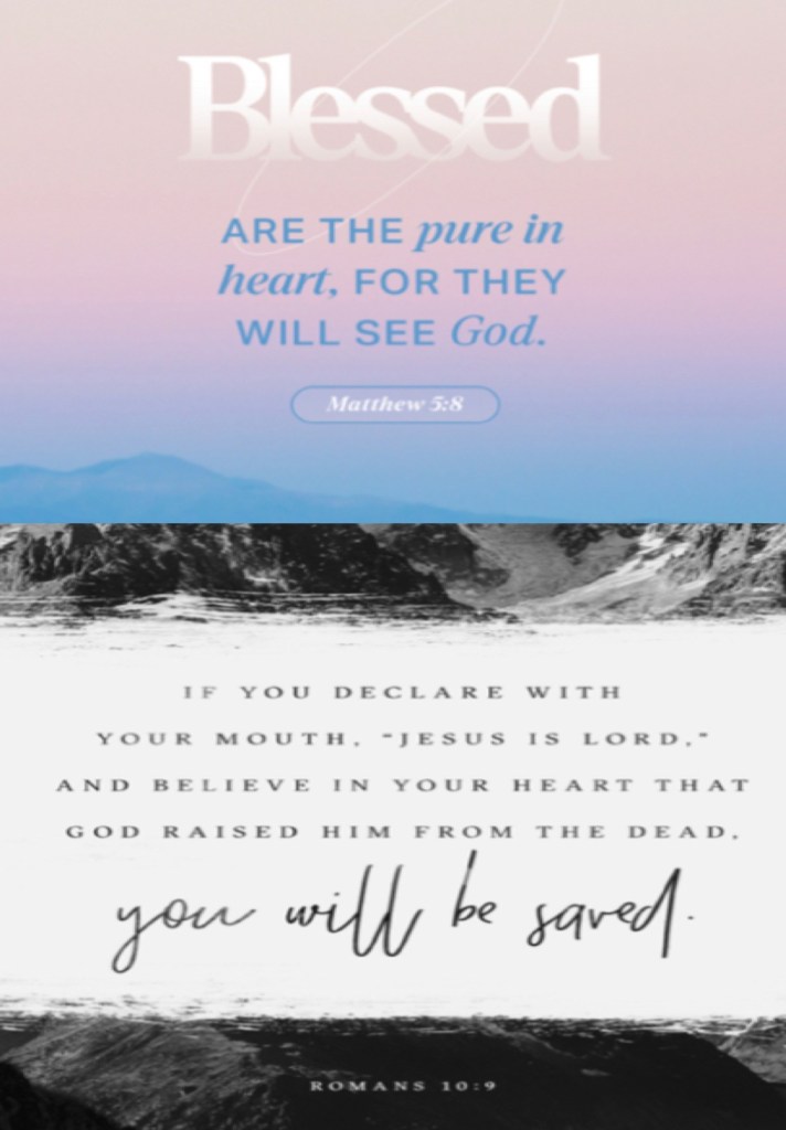 “Blessed are the pure in heart, For they shall see God.” Matthew 5:8 “that if you confess with your mouth the Lord Jesus and believe in your heart that God has raised Him from the dead, you will be saved.” Romans 10:9