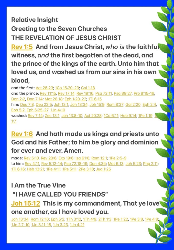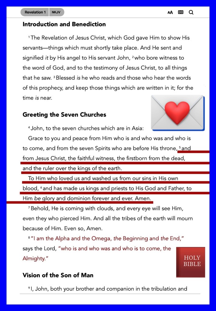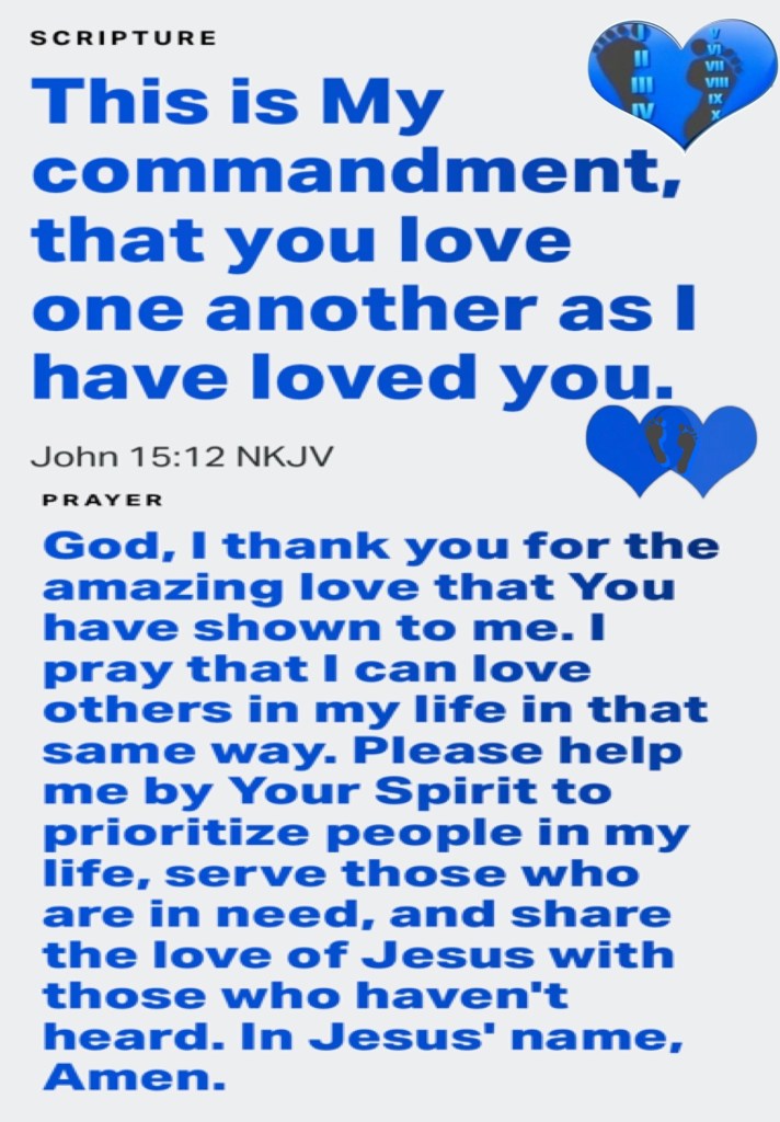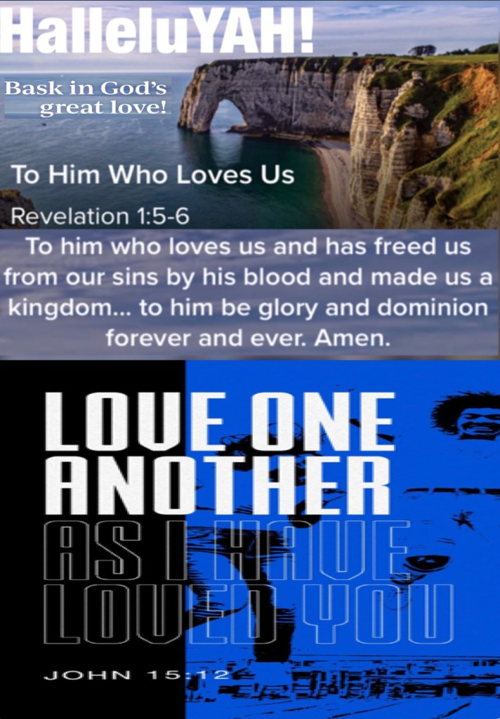 “and from Jesus Christ, the faithful witness, the firstborn from the dead, and the ruler over the kings of the earth. To Him who loved us and washed us from our sins in His own blood, and has made us kings and priests to His God and Father, to Him be glory and dominion forever and ever. Amen.” Revelation 1:5-6 “This is My commandment, that you love one another as I have loved you.” John 15:12