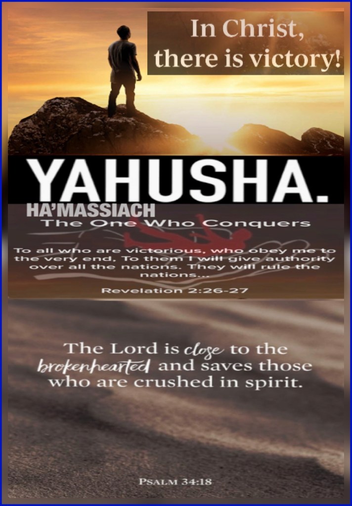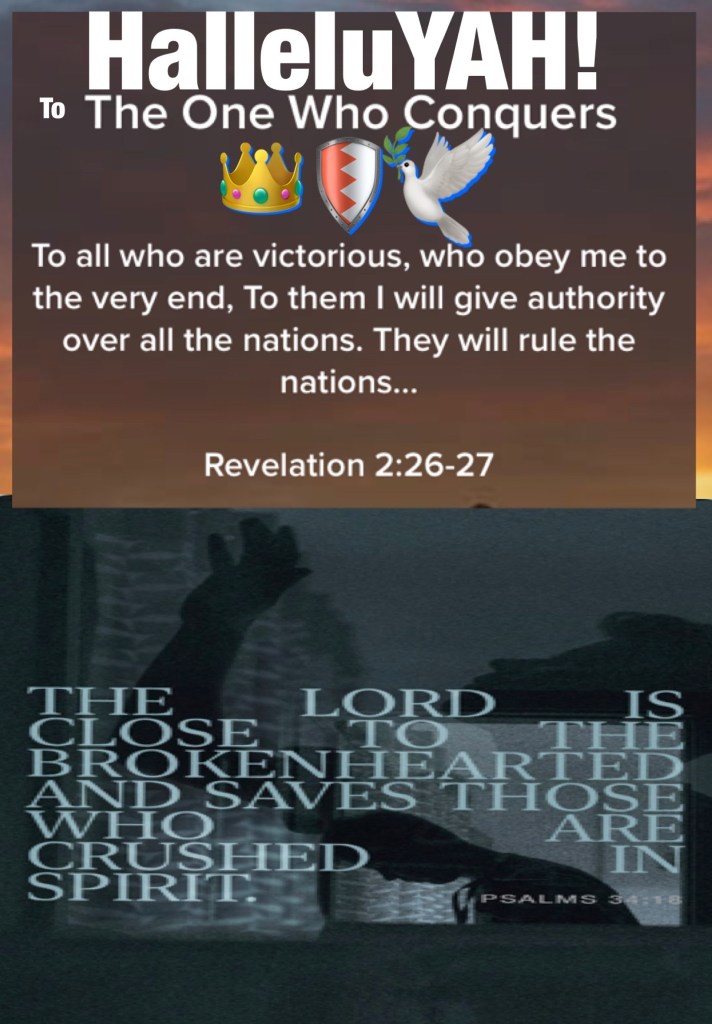 Beloved you may be hurting now but please shout HalleluYAH! and Allow our Heavenly FATHER to speak encouragement to your soul: “And he who overcomes, and keeps My works until the end, to him I will give power over the nations— ‘He shall rule them with a rod of iron; They shall be dashed to pieces like the potter’s vessels’— as I also have received from My Father;” Revelation 2:26-27 “Qoph יהוה is near to the broken-hearted, And saves those whose spirit is crushed.” Tehillim (Psalms) 34:18 TS2009 Revelation 2:11 He that hath an ear, let him hear what the Spirit saith unto the churches; He that overcometh shall not be hurt of the second death. 🛡️Receive It in JESUS Name YAHUSHA HA’MASSIACH. Amen