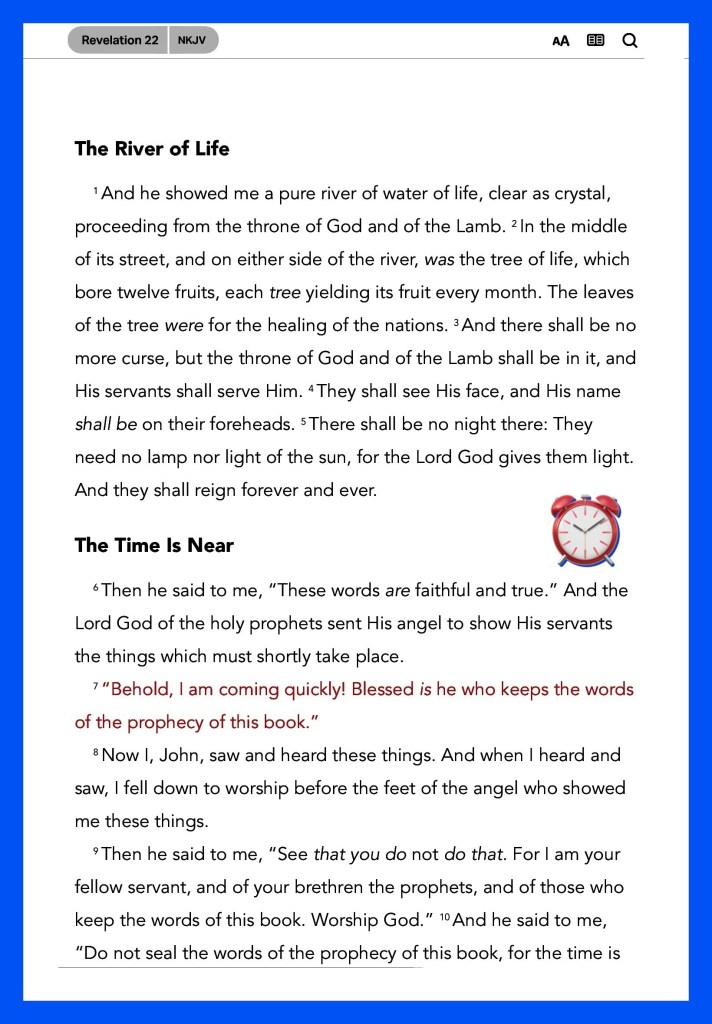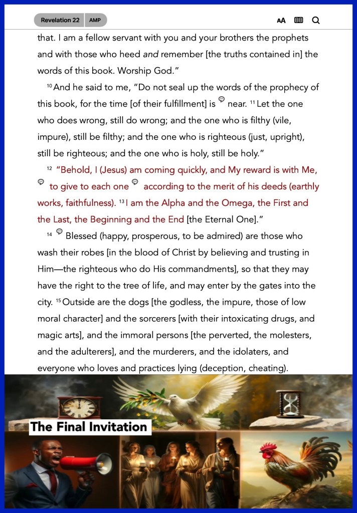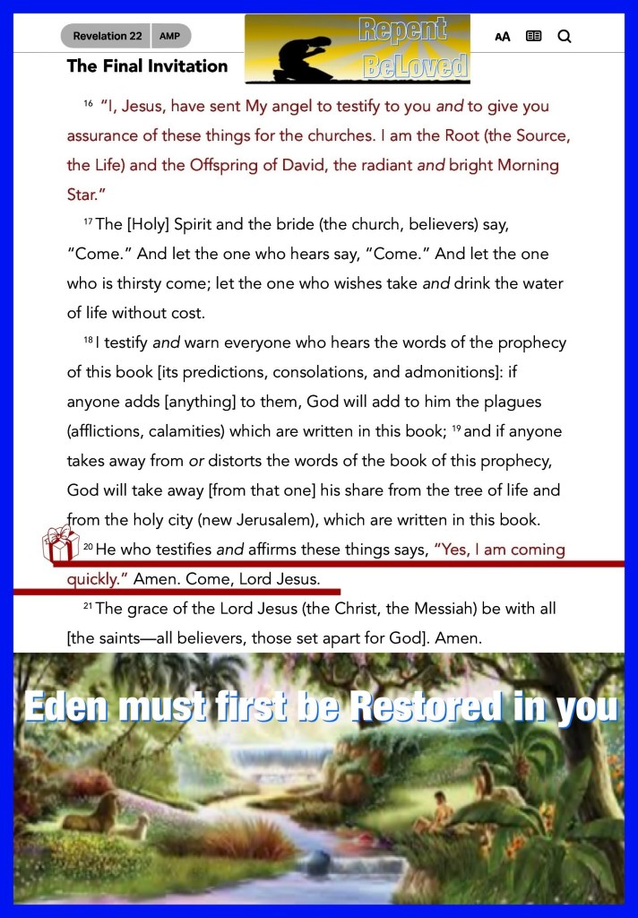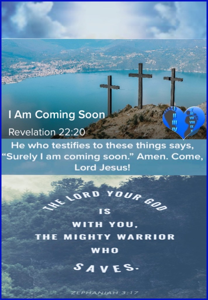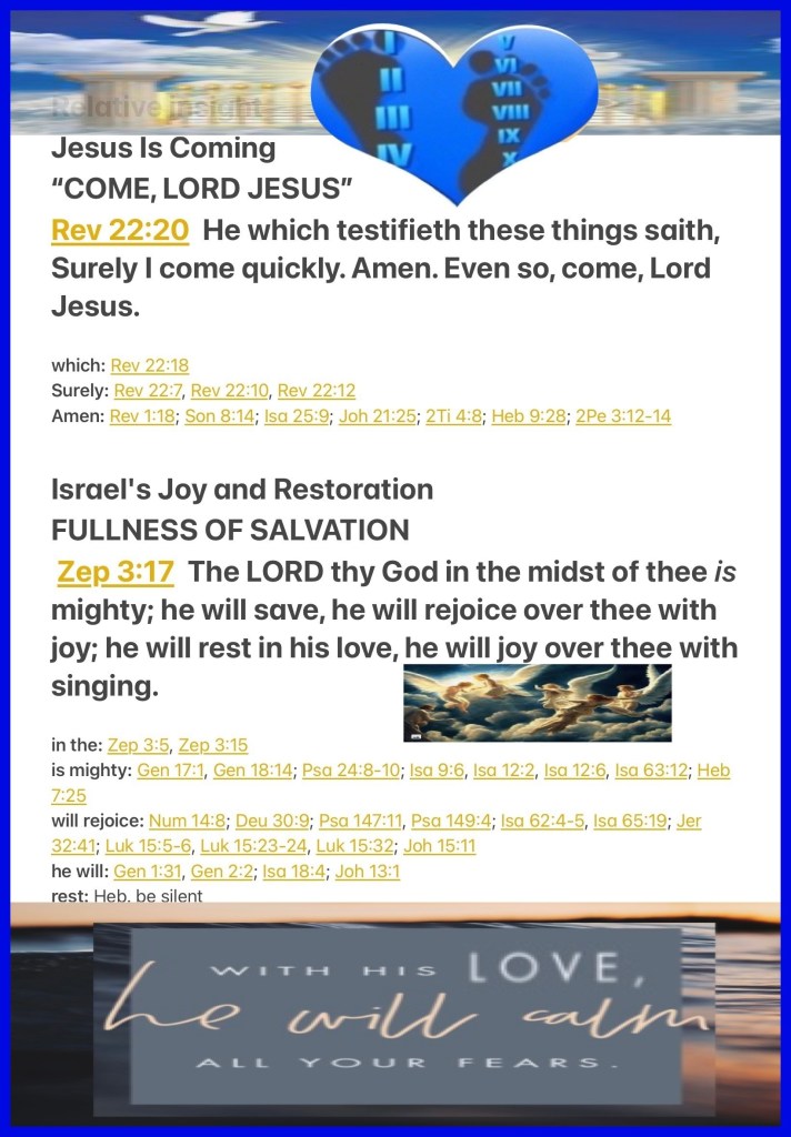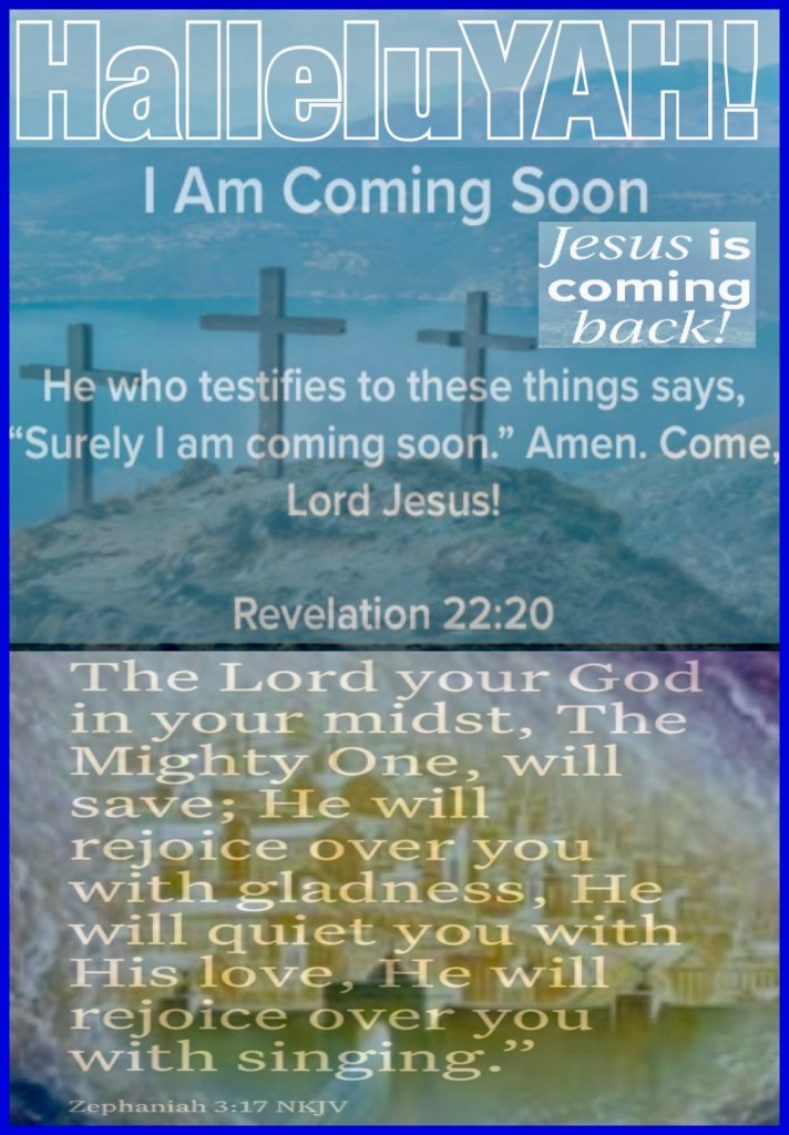 “He who testifies to these things says, “Surely I am coming quickly.” Amen. Even so, come, Lord Jesus!” Revelation 22:20 “The Lord your God in your midst, The Mighty One, will save; He will rejoice over you with gladness, He will quiet you with His love, He will rejoice over you with singing.”” Zephaniah 3:17
