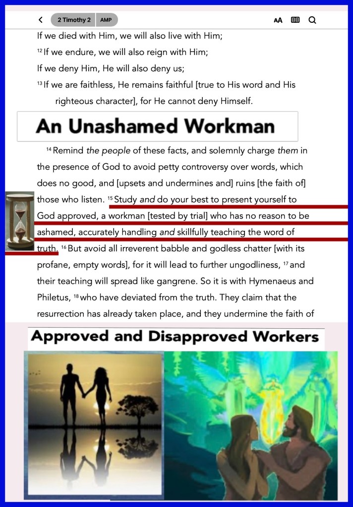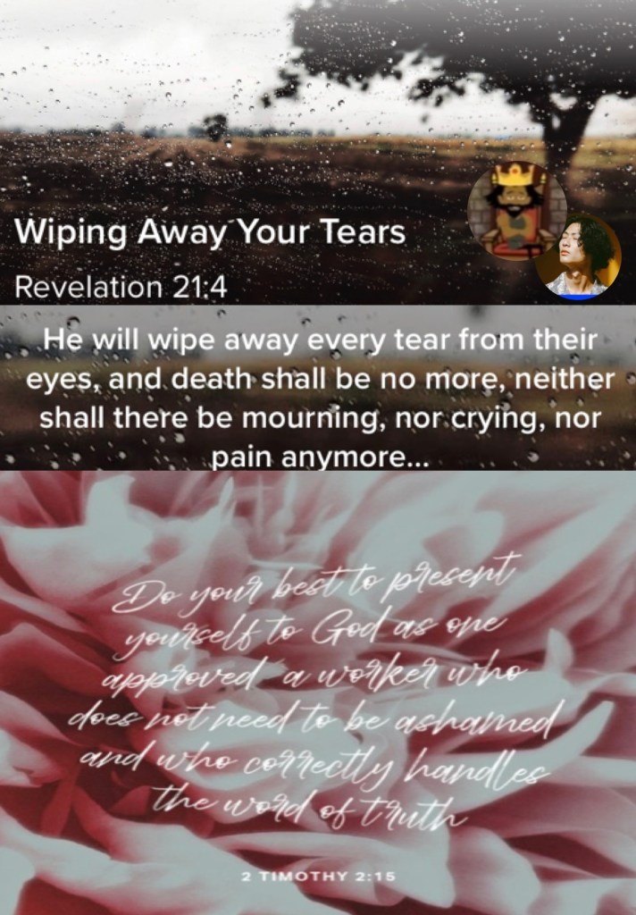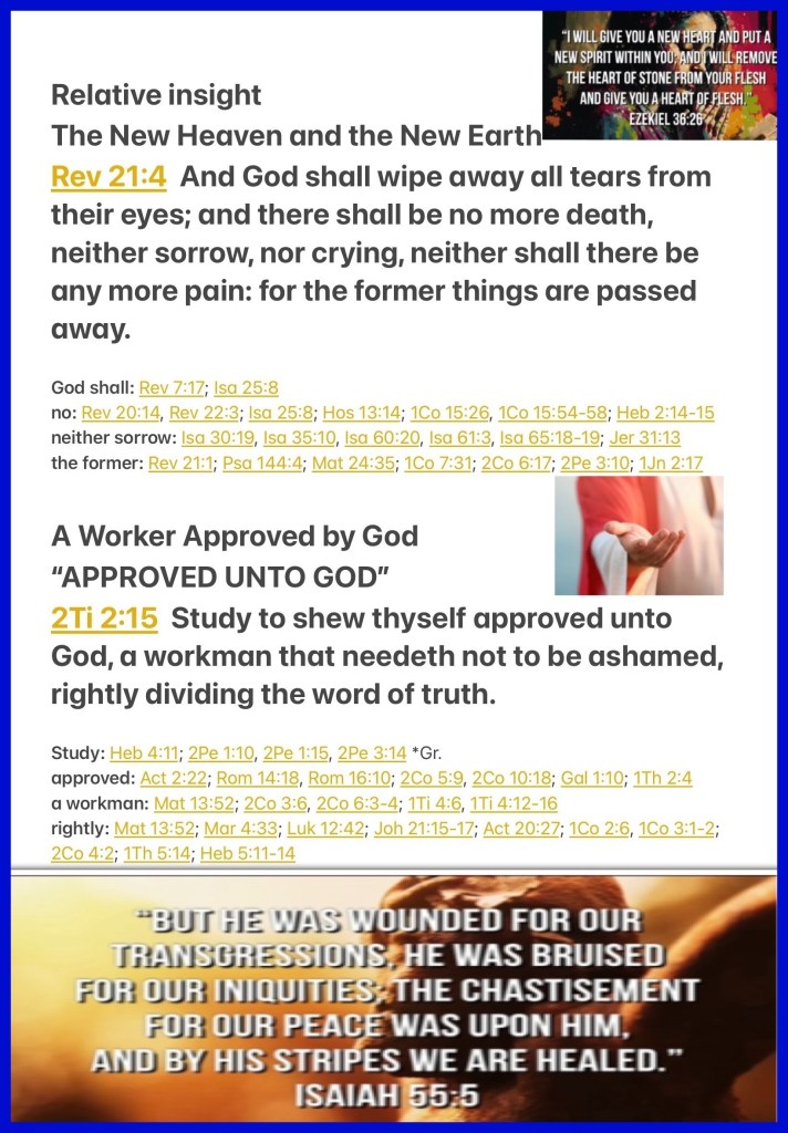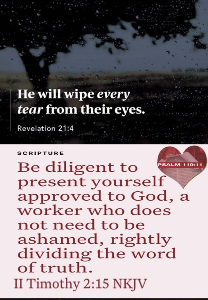“And God will wipe away every tear from their eyes; there shall be no more death, nor sorrow, nor crying. There shall be no more pain, for the former things have passed away.”” Revelation 21:4 “Be diligent to present yourself approved to God, a worker who does not need to be ashamed, rightly dividing the word of truth.” II Timothy 2:15