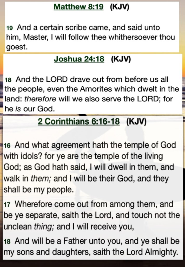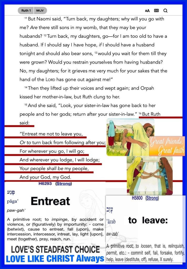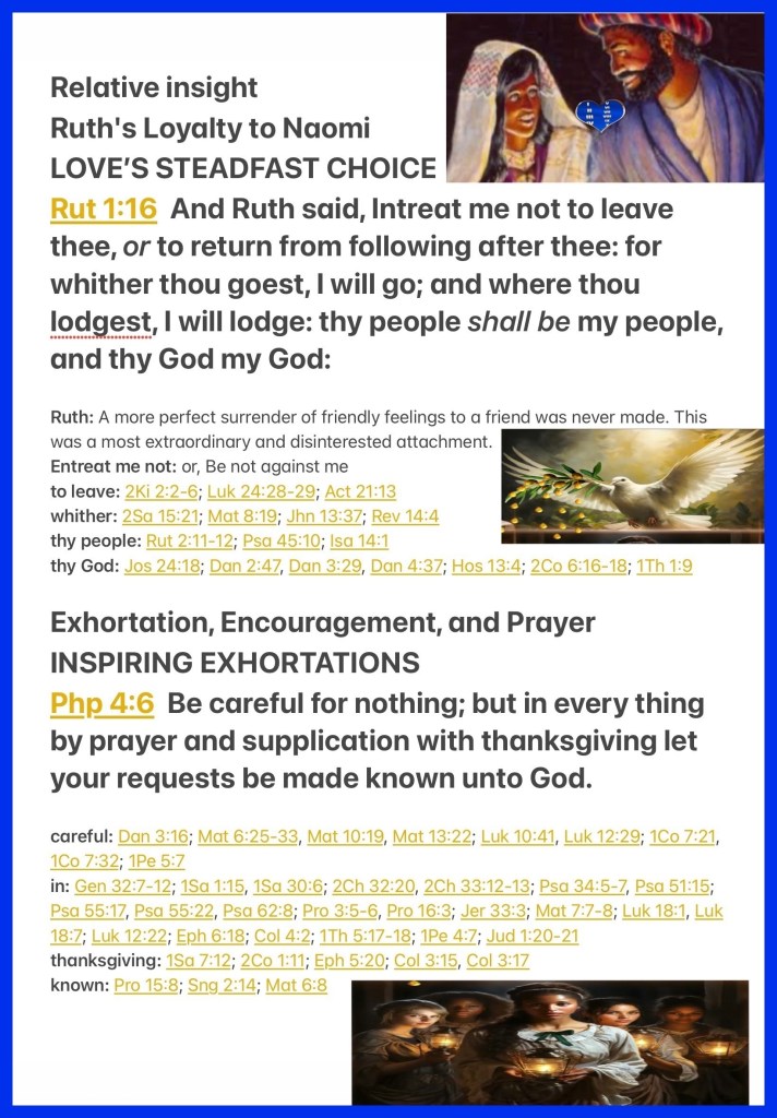 βBut Ruth said: βEntreat me not to leave you, Or to turn back from following after you; For wherever you go, I will go; And wherever you lodge, I will lodge; Your people shall be my people, And your God, my God.β Ruth 1:16 βBe anxious for nothing, but in everything by prayer and supplication, with thanksgiving, let your requests be made known to God;β Philippians 4:6