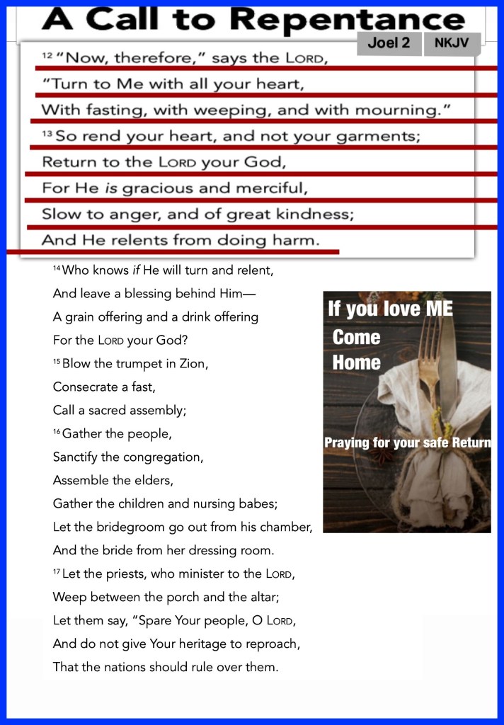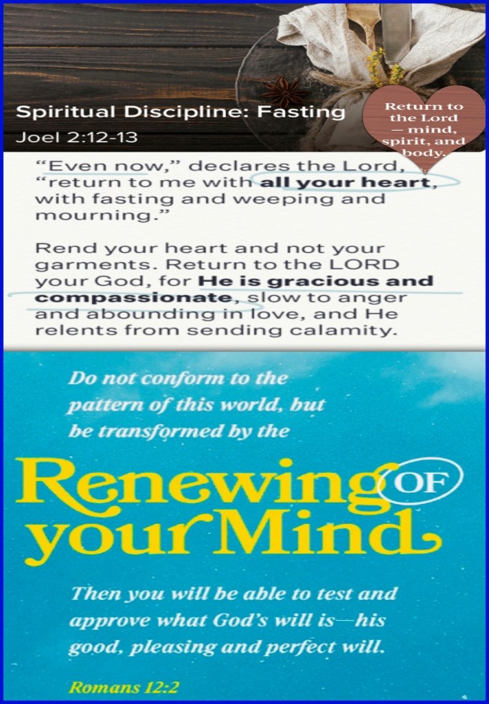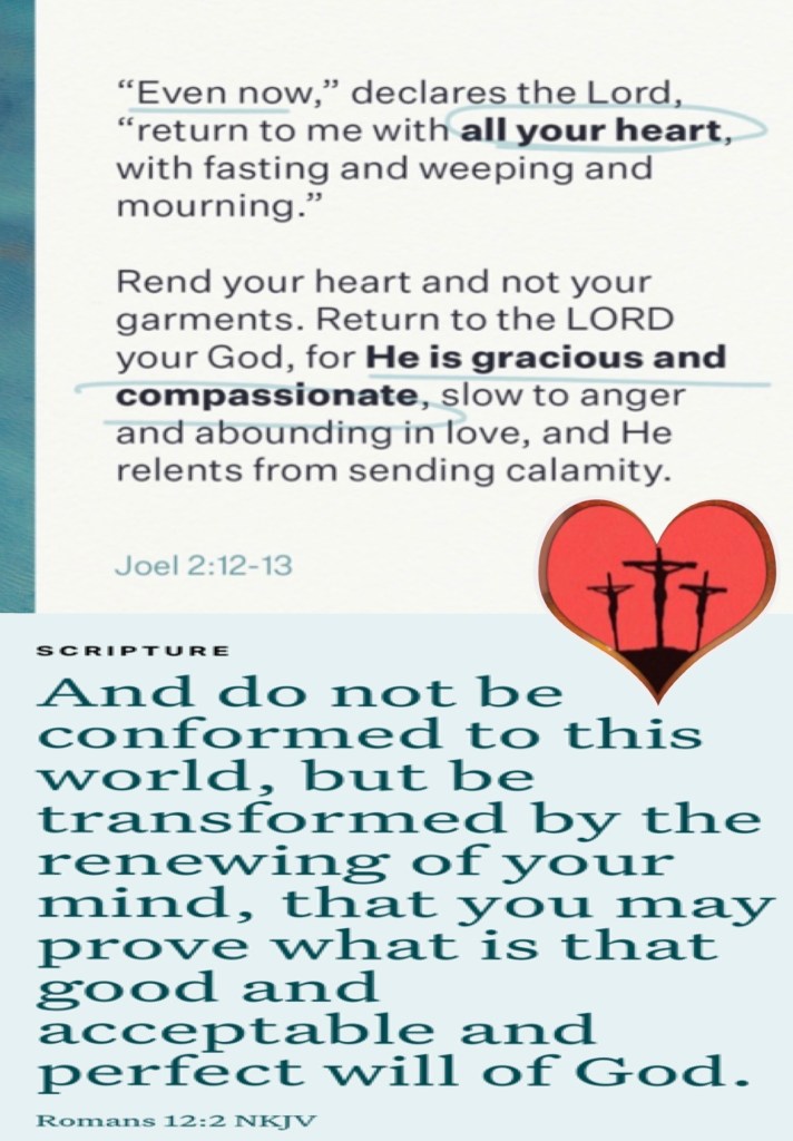 ββNow, therefore,β says the Lord, βTurn to Me with all your heart, With fasting, with weeping, and with mourning.β So rend your heart, and not your garments; Return to the Lord your God, For He is gracious and merciful, Slow to anger, and of great kindness; And He relents from doing harm.β Joel 2:12-13 βAnd do not be conformed to this world, but be transformed by the renewing of your mind, that you may prove what is that good and acceptable and perfect will of God.β Romans 12:2 NKJV