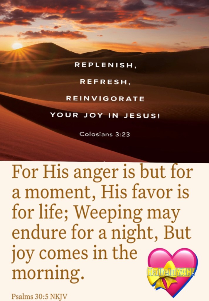 “And whatever you do, do it heartily, as to the Lord and not to men,” Colossians 3:23 “For His anger is but for a moment, His favor is for life; Weeping may endure for a night, But joy comes in the morning.” Psalms 30:5