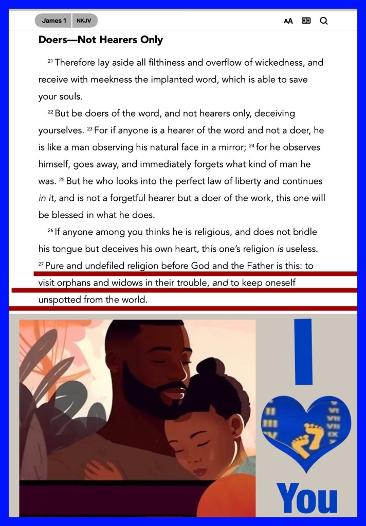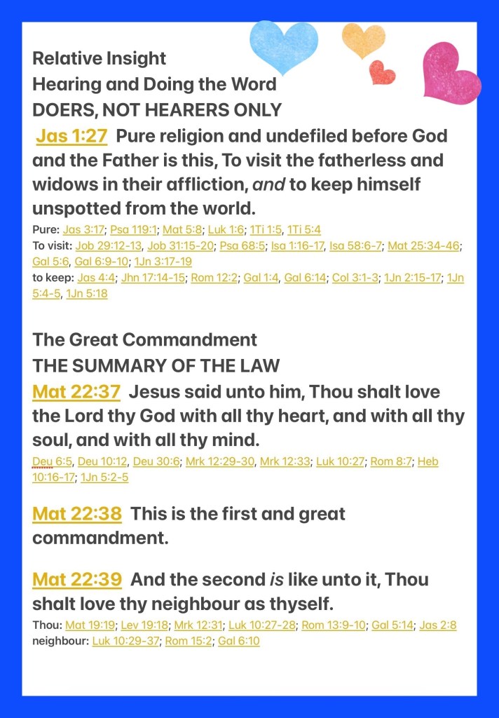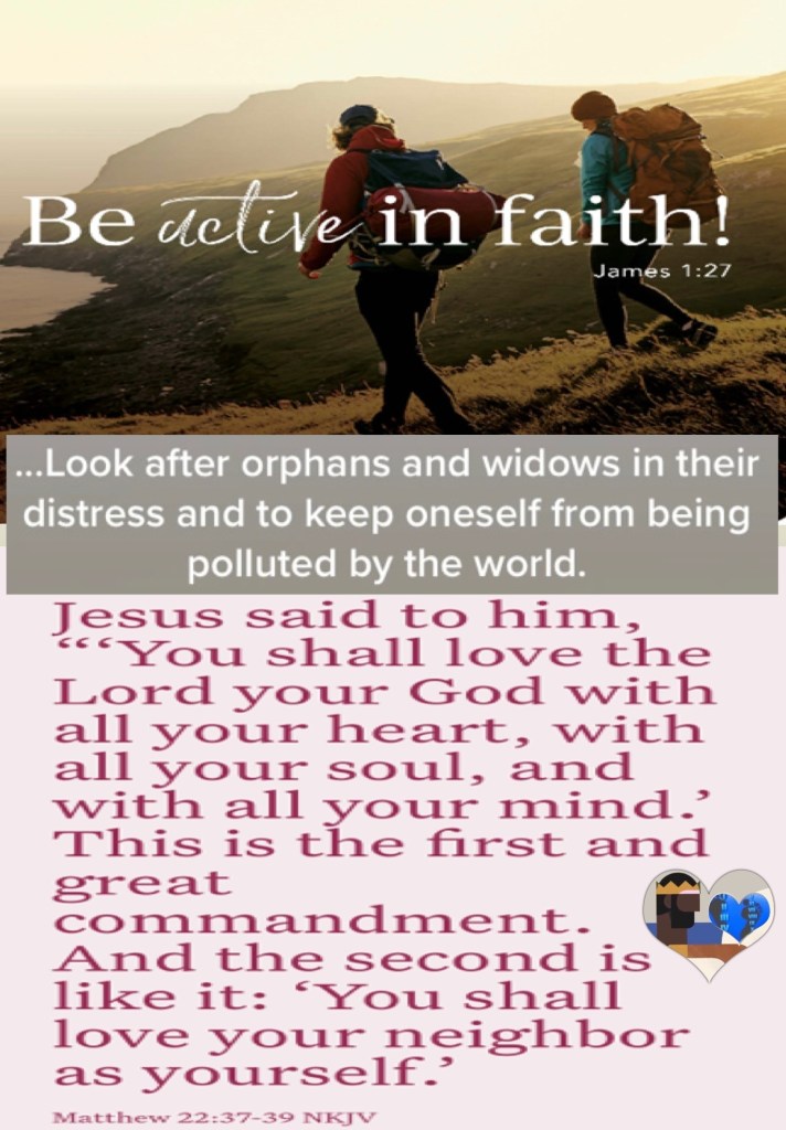 “Pure and undefiled religion before God and the Father is this: to visit orphans and widows in their trouble, and to keep oneself unspotted from the world.” James 1:27 “Jesus said to him, “‘You shall love the Lord your God with all your heart, with all your soul, and with all your mind.’ This is the first and great commandment. And the second is like it: ‘You shall love your neighbor as yourself.’” Matthew 22:37-39