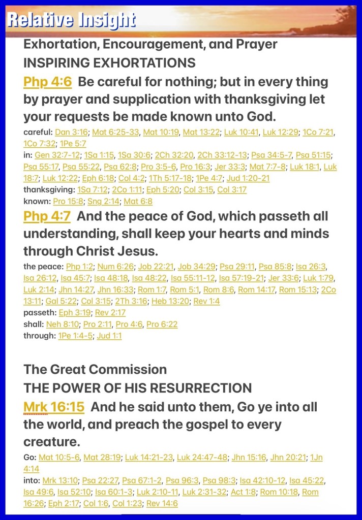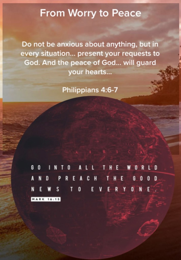 “Be anxious for nothing, but in everything by prayer and supplication, with thanksgiving, let your requests be made known to God; and the peace of God, which surpasses all understanding, will guard your hearts and minds through Christ Jesus.” Philippians 4:6-7 “And He said to them, “Go into all the world and preach the gospel to every creature.” Mark 16:15