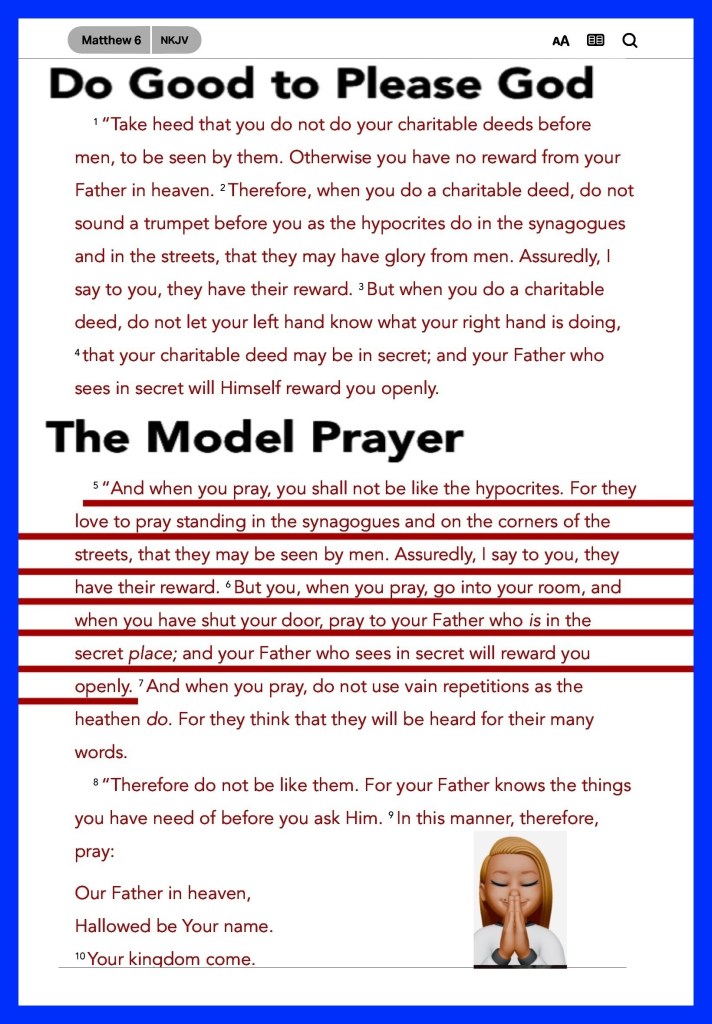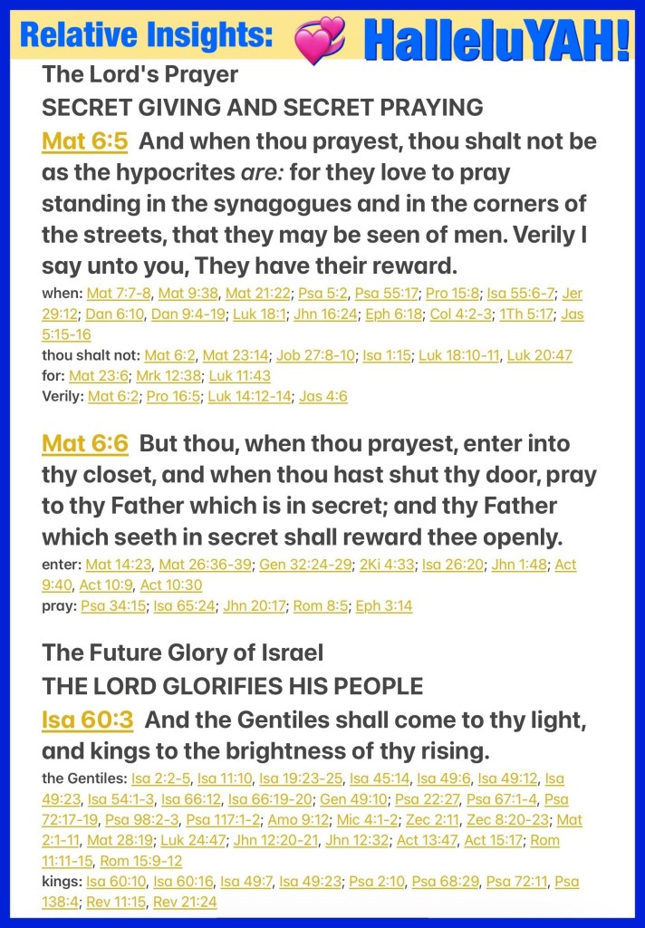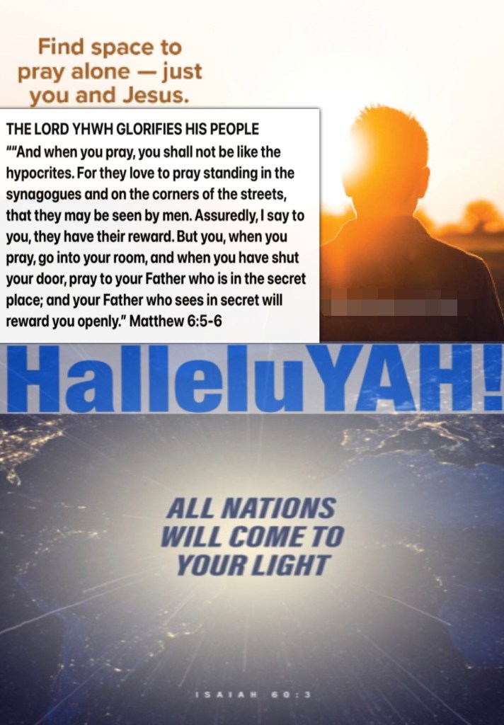 ““And when you pray, you shall not be like the hypocrites. For they love to pray standing in the synagogues and on the corners of the streets, that they may be seen by men. Assuredly, I say to you, they have their reward. But you, when you pray, go into your room, and when you have shut your door, pray to your Father who is in the secret place; and your Father who sees in secret will reward you openly.” Matthew 6:5-6 “The Gentiles shall come to your light, And kings to the brightness of your rising.” Isaiah 60:3