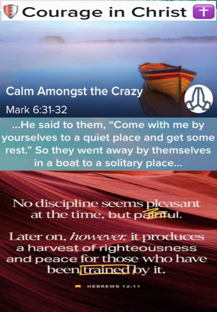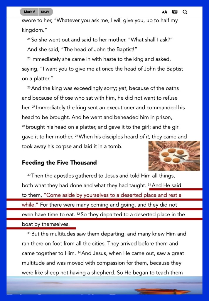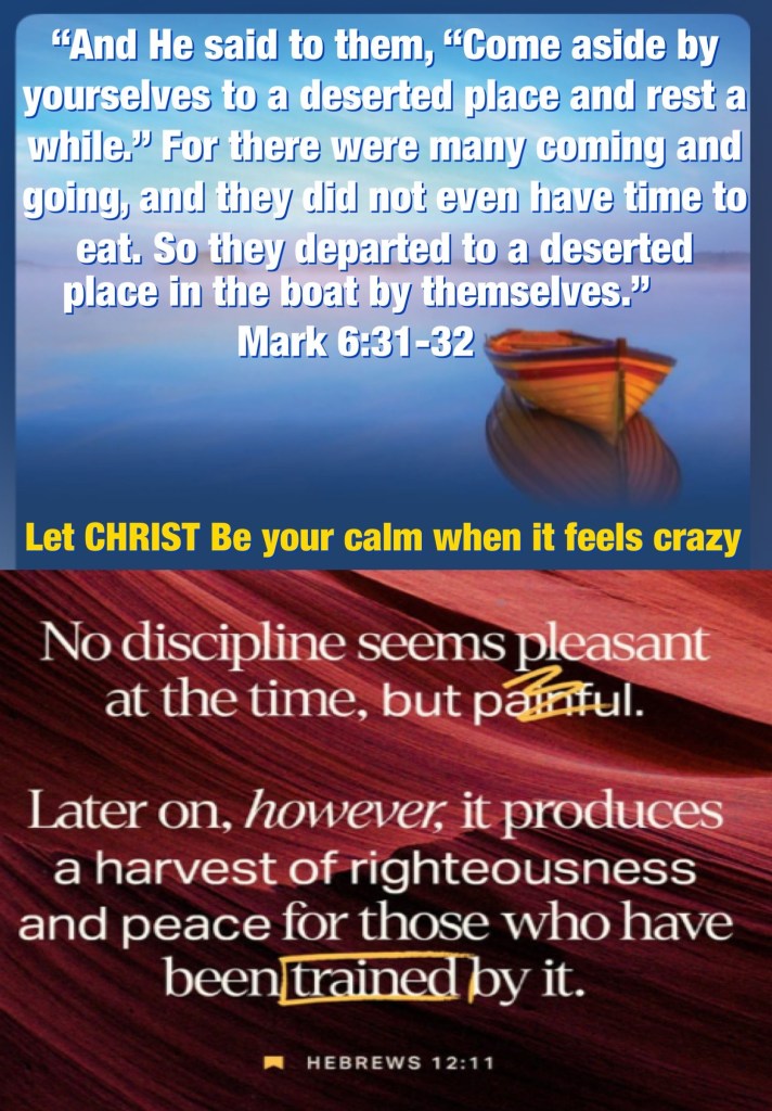 “And He said to them, “Come aside by yourselves to a deserted place and rest a while.” For there were many coming and going, and they did not even have time to eat. So they departed to a deserted place in the boat by themselves.” Mark 6:31-32 “Now no chastening seems to be joyful for the present, but painful; nevertheless, afterward it yields the peaceable fruit of righteousness to those who have been trained by it.” Hebrews 12:11