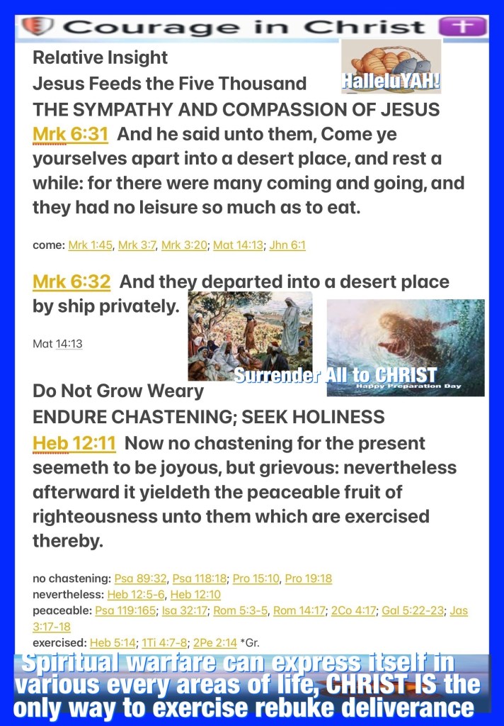 Happy Preparation Day BeLoved, it’s Training Day Time to Get Ready to Meet with our FATHER Psalms 118:18 The LORD hath chastened me sore: but he hath not given me over unto death. Isaiah 32:17 And the work of righteousness shall be peace; and the effect of righteousness quietness and assurance for ever. HalleluYAH! CHRIST GREAT ACTS OF COMPASSION / CHASTENING ARE ABUNDANT IN LOVE To Ready us for His Kingdom, we Need to Know Him Now Be Filled BeLoved. HalleluYAH!
