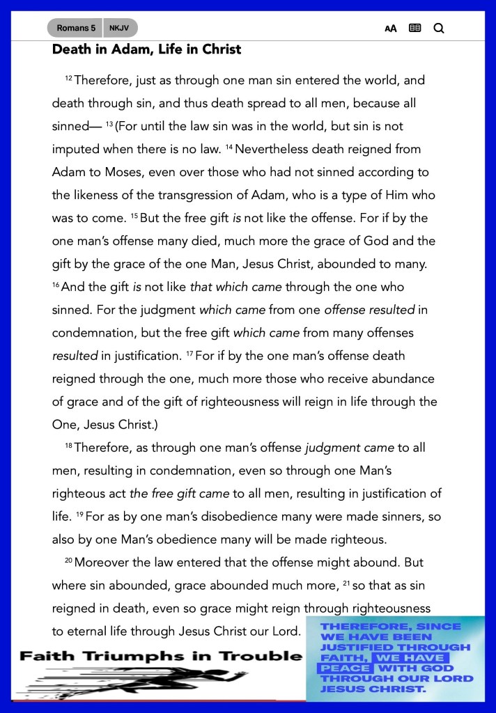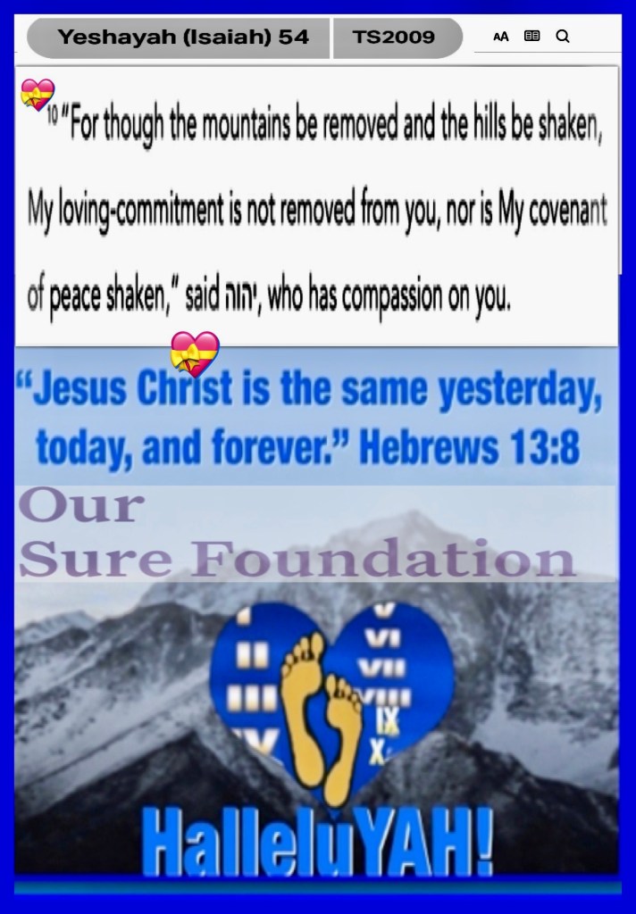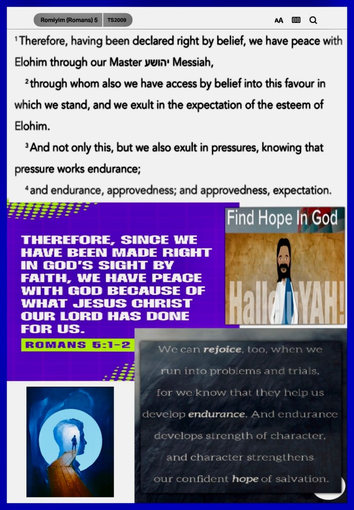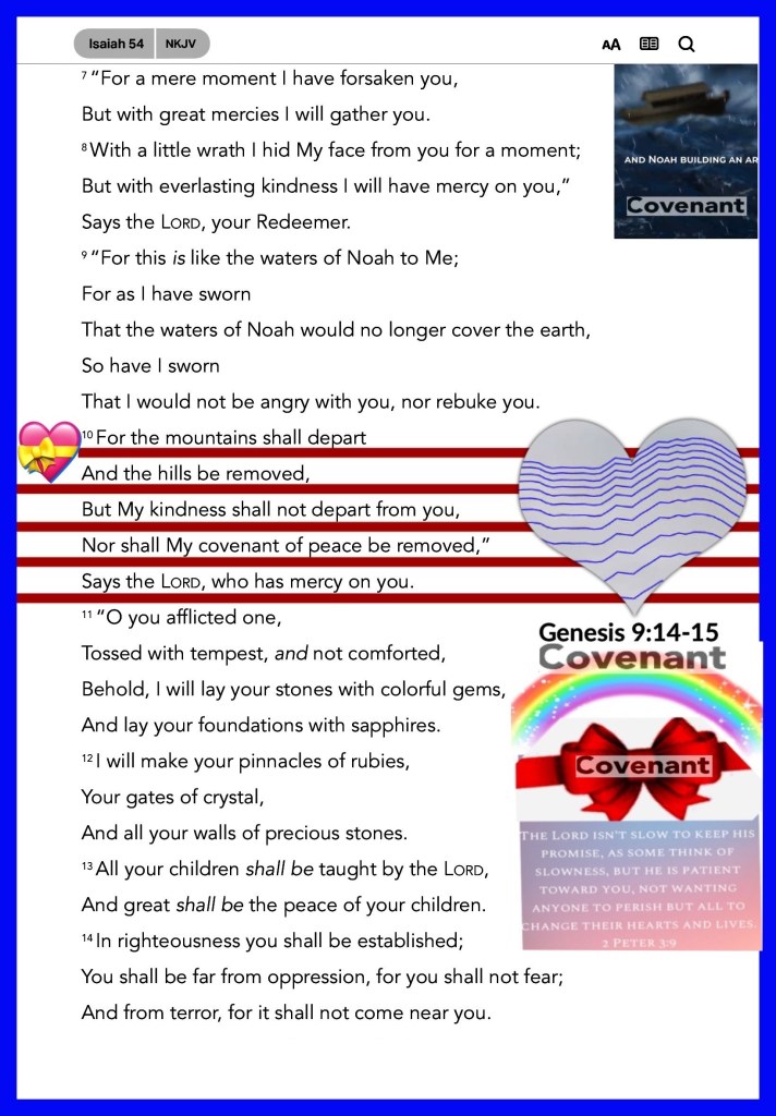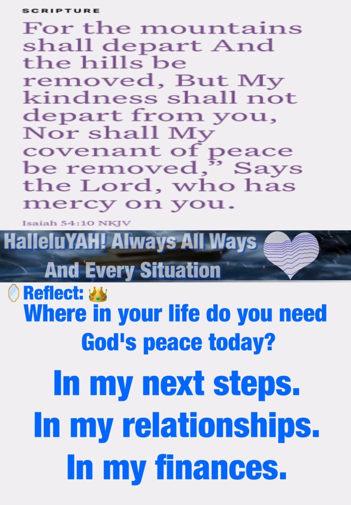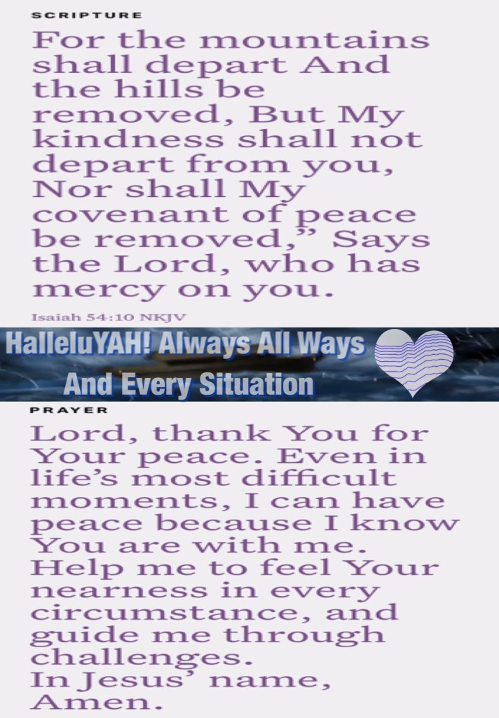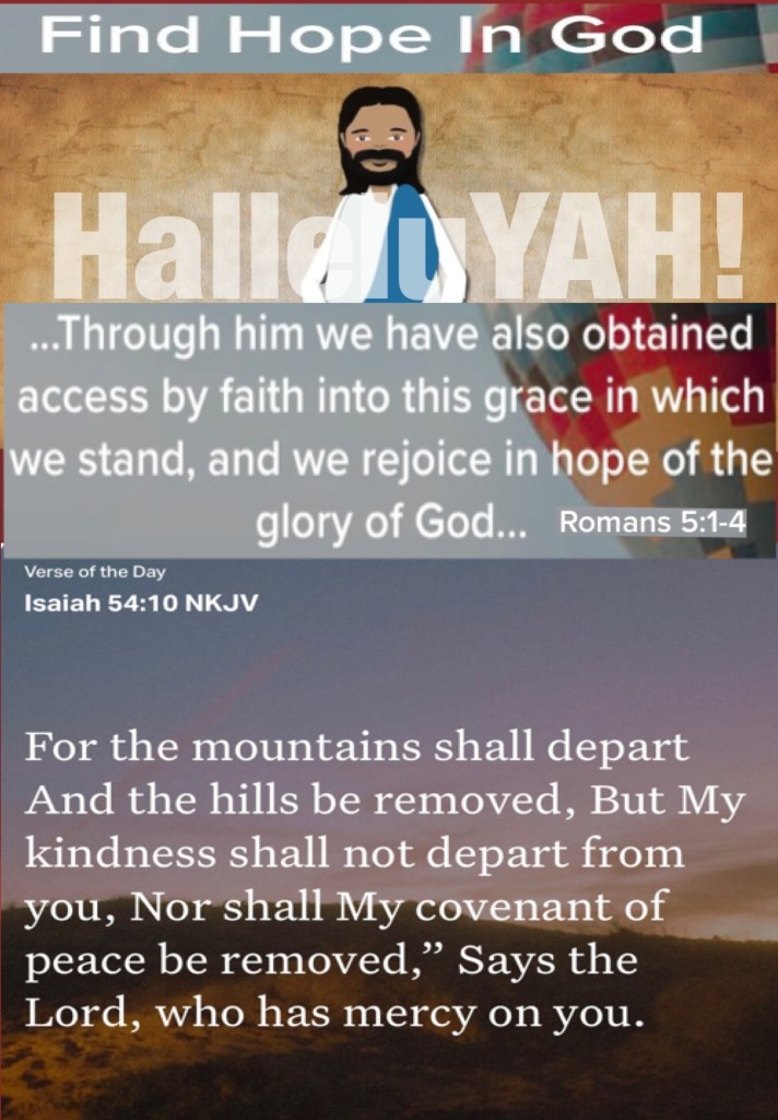 “Therefore, having been justified by faith, we have peace with God through our Lord Jesus Christ, through whom also we have access by faith into this grace in which we stand, and rejoice in hope of the glory of God. And not only that, but we also glory in tribulations, knowing that tribulation produces perseverance; and perseverance, character; and character, hope.” Romans 5:1-4 “For the mountains shall depart And the hills be removed, But My kindness shall not depart from you, Nor shall My covenant of peace be removed,” Says the Lord, who has mercy on you.” Isaiah 54:10