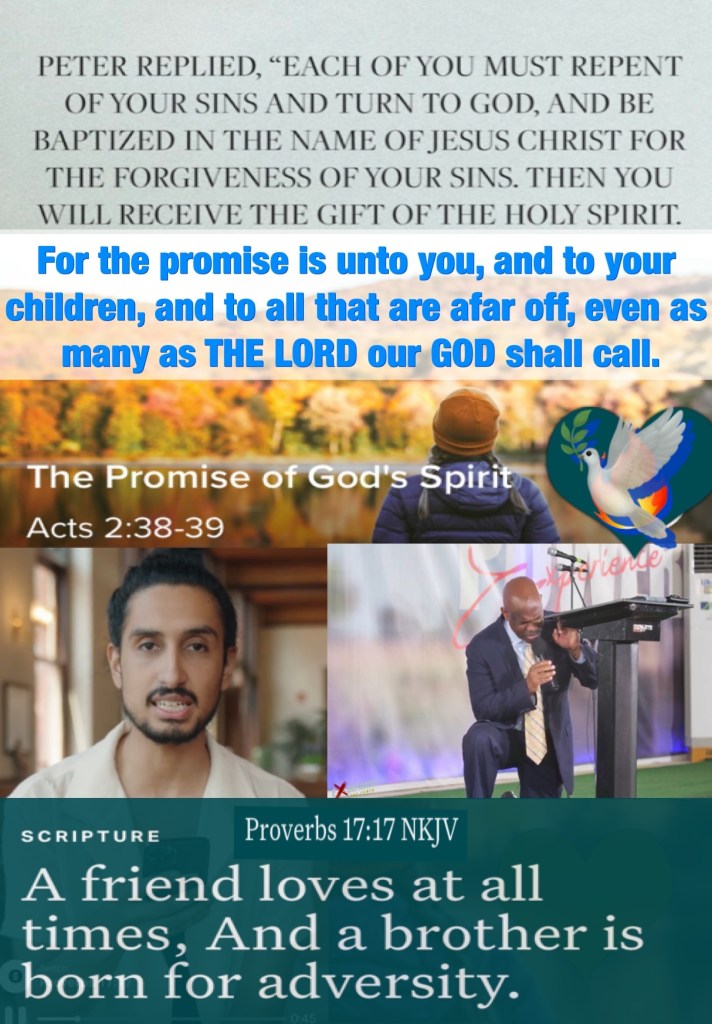 βThen Peter said to them, βRepent, and let every one of you be baptized in the name of Jesus Christ for the remission of sins; and you shall receive the gift of the Holy Spirit. For the promise is to you and to your children, and to all who are afar off, as many as the Lord our God will call.ββ Acts 2:38-39 βA friend loves at all times, And a brother is born for adversity.β Proverbs 17:17