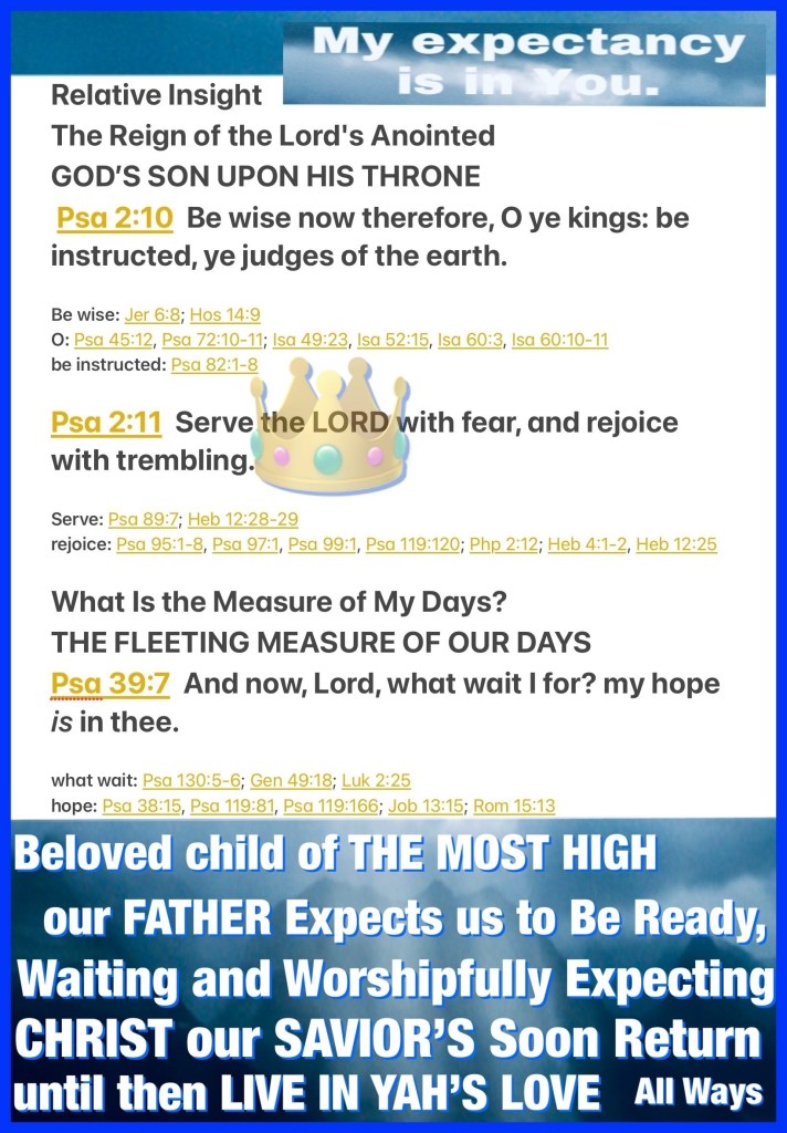 What Is the Measure of My Days without a πΌ Hopeful HalleluYAH! πππ½to Serve π΅ Rejoice πΆ in our LORD YAHβS Finished Work and The Work Heβs Done in us? Today our HEAVENLY FATHER Encourages us from The Book of Psalms and I Thank Him!may this lesson bless your soul, lift you up and remind you that you are LOVED. Have a wonderful day (no matter what) and a week so filled with blessings that you walk with a Song in your heart and Uproarious Praise! Serve YAH by sharing in the cause of CHRIST: serving others, however THE HOLY SPIRIT Leads and All The Glory will Go To GOD, actively Rejoice in His WORD Itβs for your Good; HalleluYAH! BeLoved Always