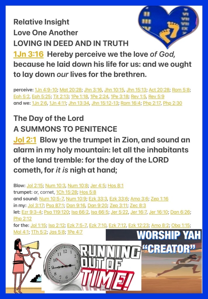 “By this we know love, because He laid down His life for us. And we also ought to lay down our lives for the brethren.” I John 3:16 “Blow the trumpet in Zion, And sound an alarm in My holy mountain! Let all the inhabitants of the land tremble; For the day of the Lord is coming, For it is at hand:” Joel 2:1