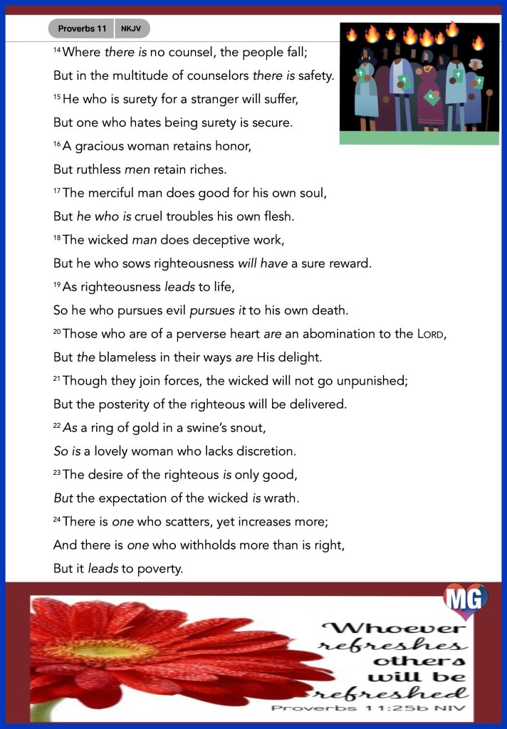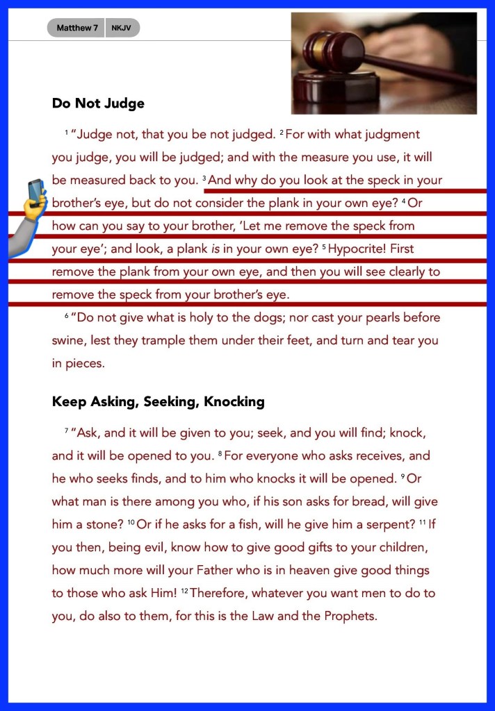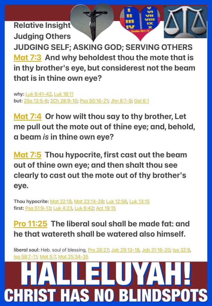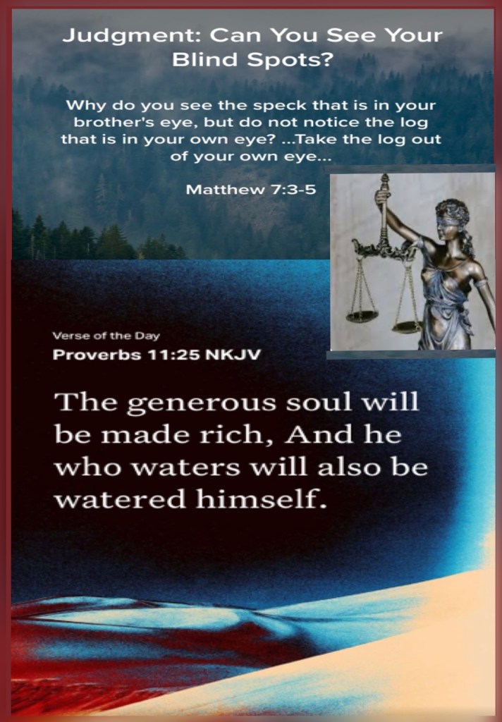 “And why do you look at the speck in your brother’s eye, but do not consider the plank in your own eye? Or how can you say to your brother, ‘Let me remove the speck from your eye’; and look, a plank is in your own eye? Hypocrite! First remove the plank from your own eye, and then you will see clearly to remove the speck from your brother’s eye.” Matthew 7:3-5 “The generous soul will be made rich, And he who waters will also be watered himself.” Proverbs 11:25
