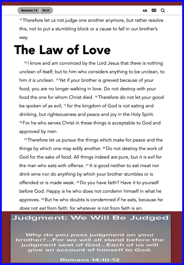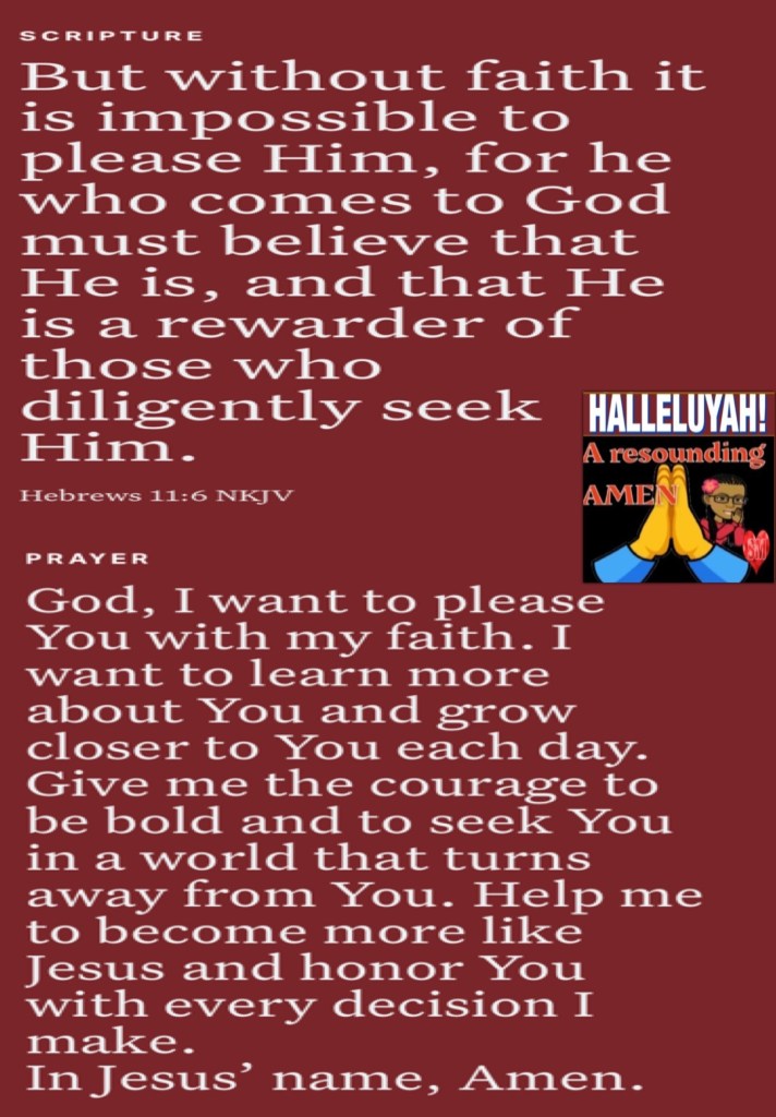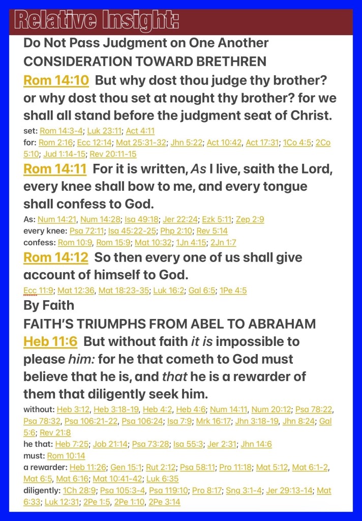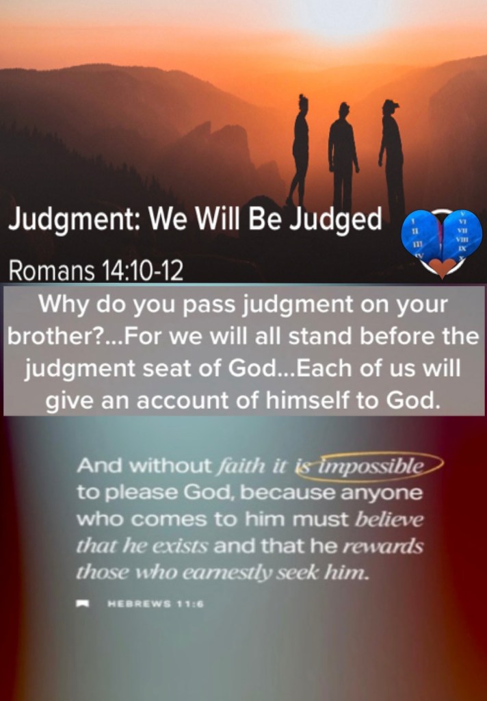 “But why do you judge your brother? Or why do you show contempt for your brother? For we shall all stand before the judgment seat of Christ. For it is written: “As I live, says the Lord, Every knee shall bow to Me, And every tongue shall confess to God.” So then each of us shall give account of himself to God.” Romans 14:10-12 “But without faith it is impossible to please Him, for he who comes to God must believe that He is, and that He is a rewarder of those who diligently seek Him.” Hebrews 11:6