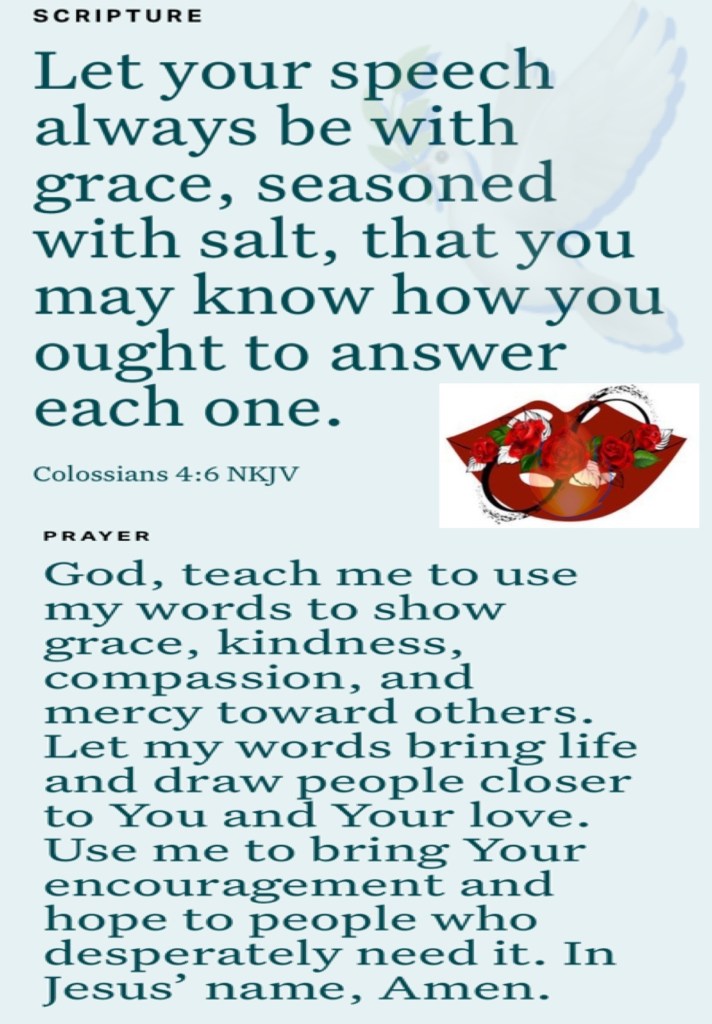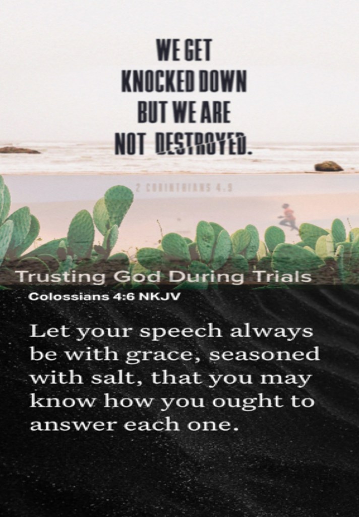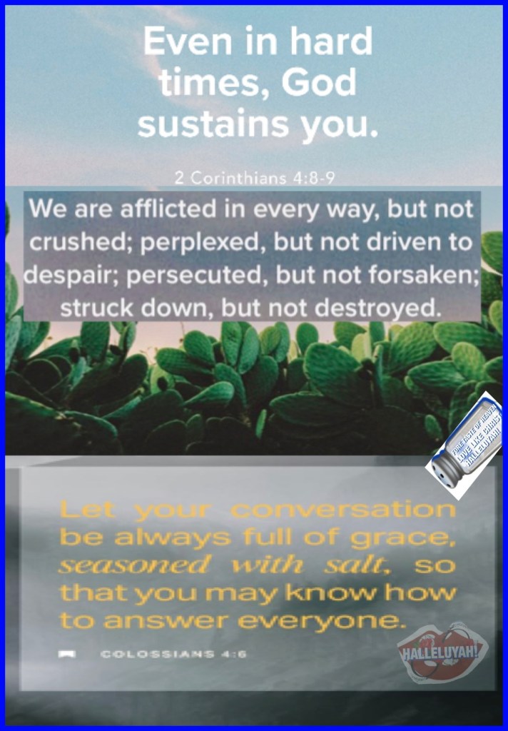 “We are hard-pressed on every side, yet not crushed; we are perplexed, but not in despair; persecuted, but not forsaken; struck down, but not destroyed—“ II Corinthians 4:8-9 “Let your speech always be with grace, seasoned with salt, that you may know how you ought to answer each one.”Colossians 4:6
