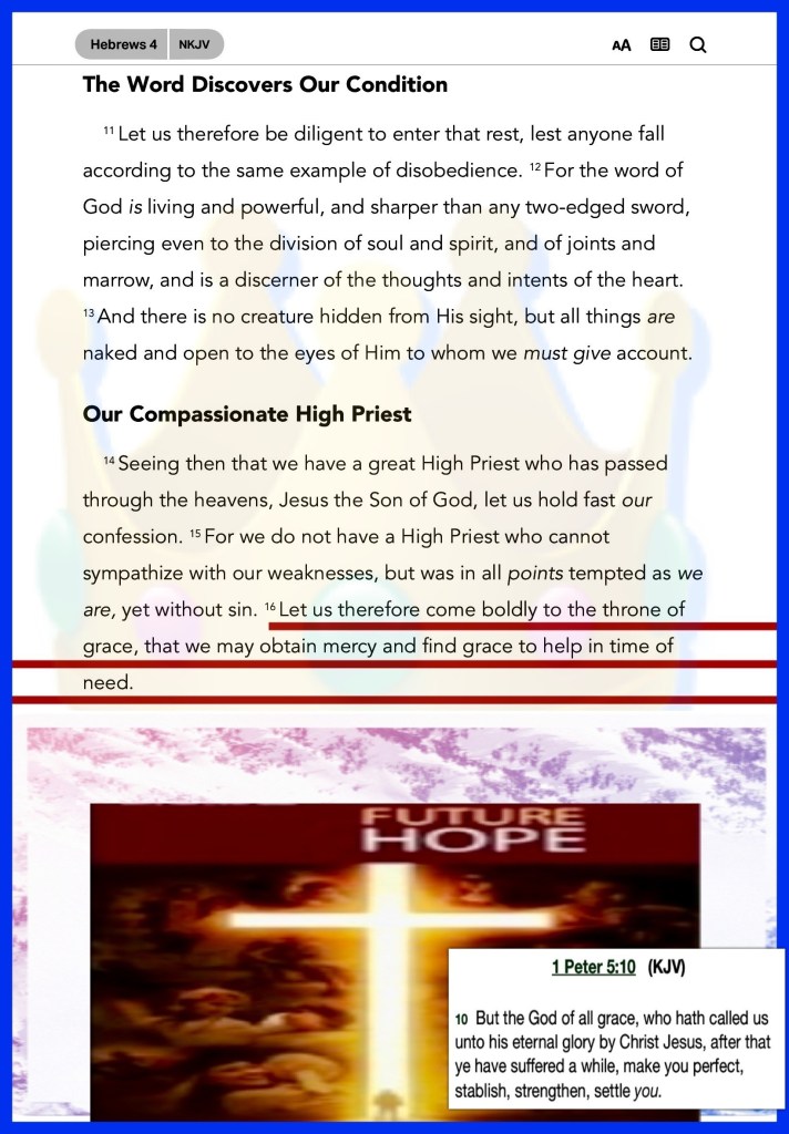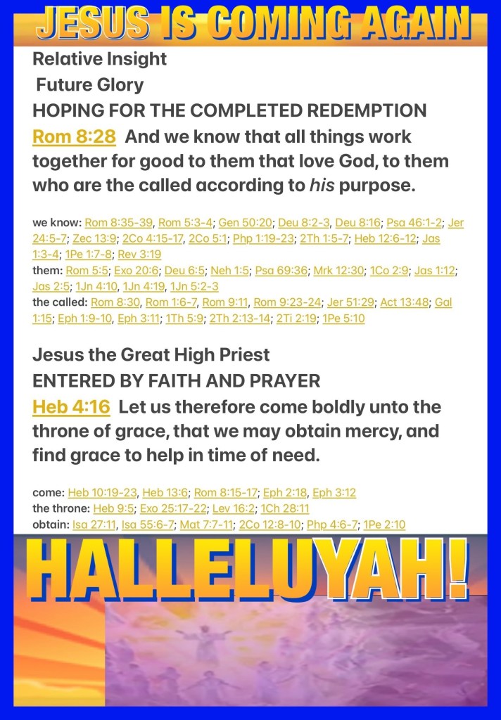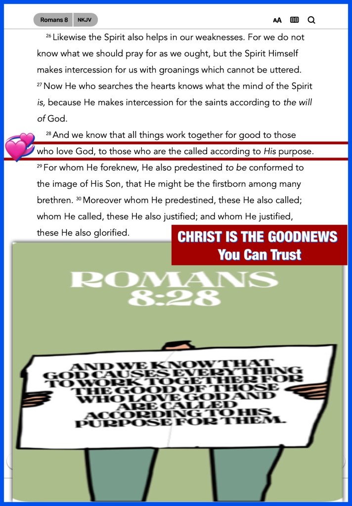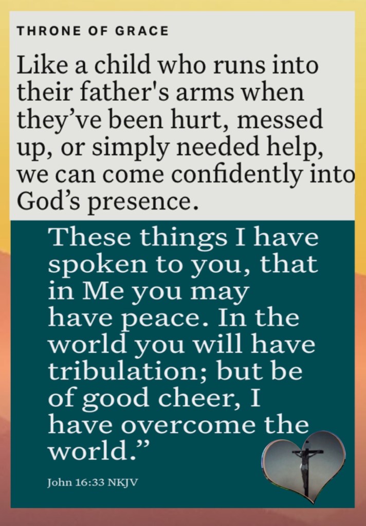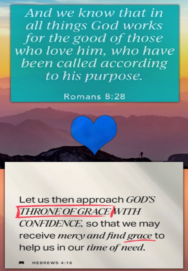 “And we know that all things work together for good to those who love God, to those who are the called according to His purpose.” Romans 8:28 “Let us therefore come boldly to the throne of grace, that we may obtain mercy and find grace to help in time of need.” Hebrews 4:16