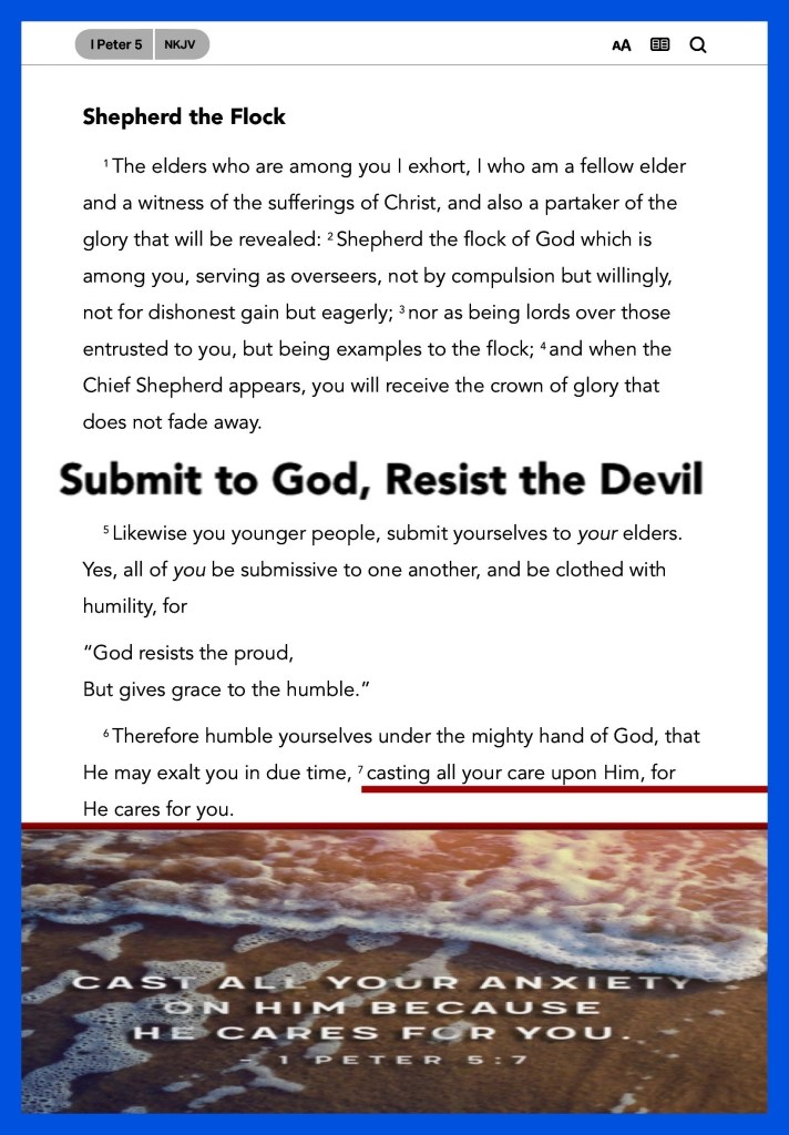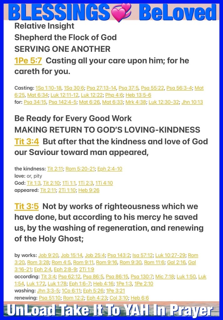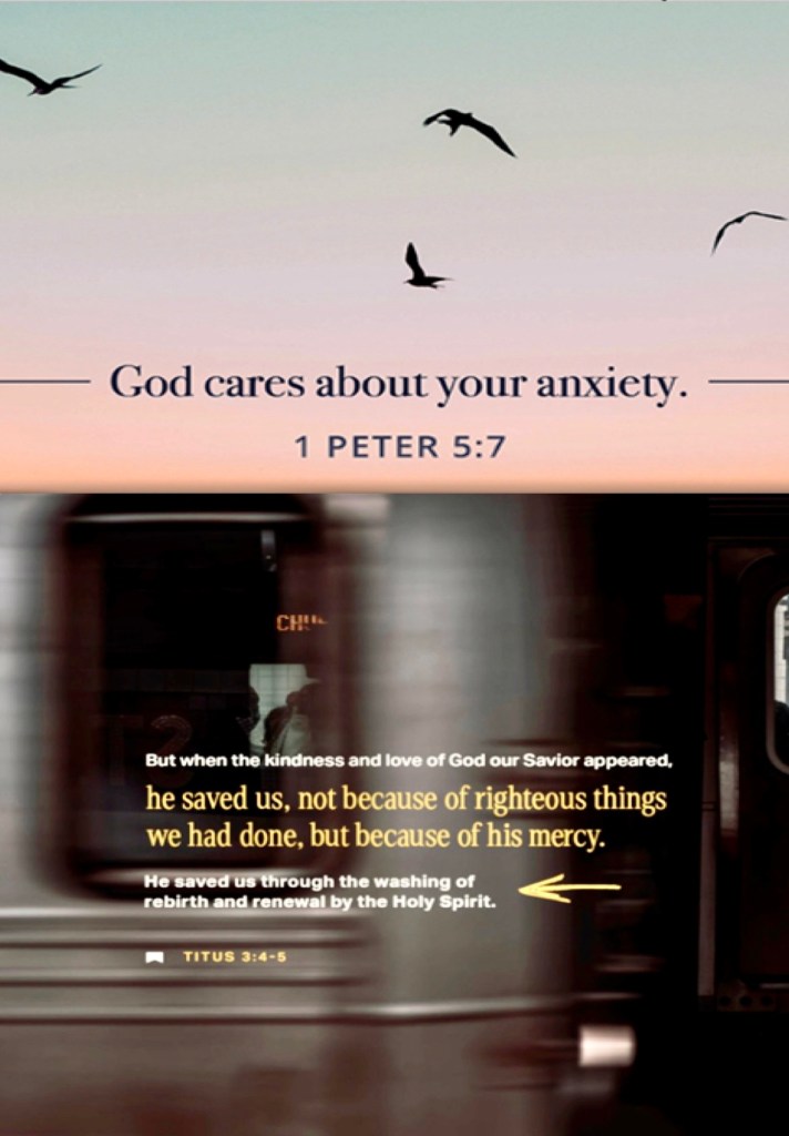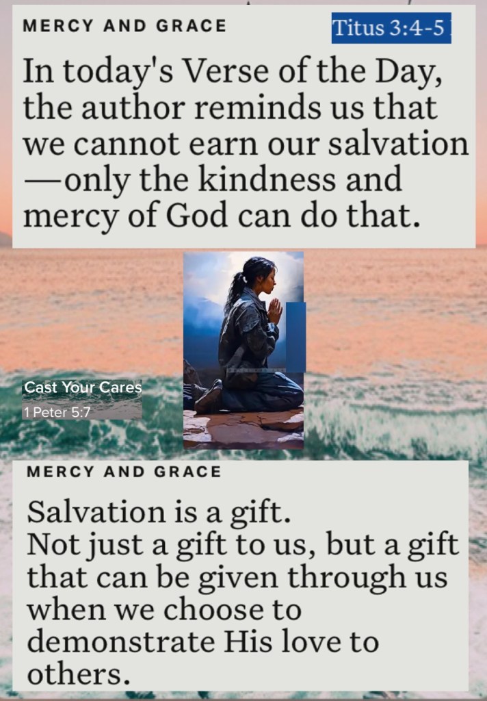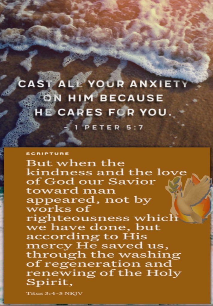 “casting all your care upon Him, for He cares for you.” I Peter 5:7 “But when the kindness and the love of God our Savior toward man appeared, not by works of righteousness which we have done, but according to His mercy He saved us, through the washing of regeneration and renewing of the Holy Spirit,” Titus 3:4-5