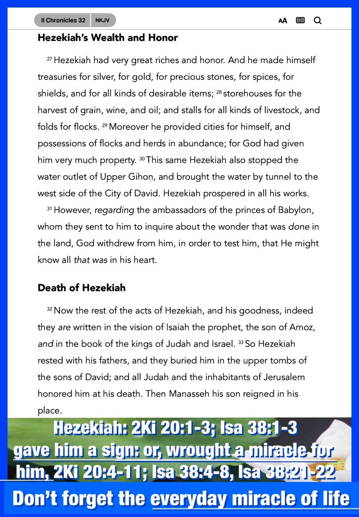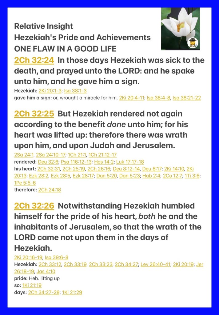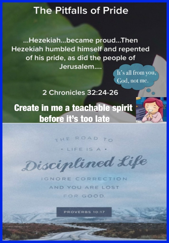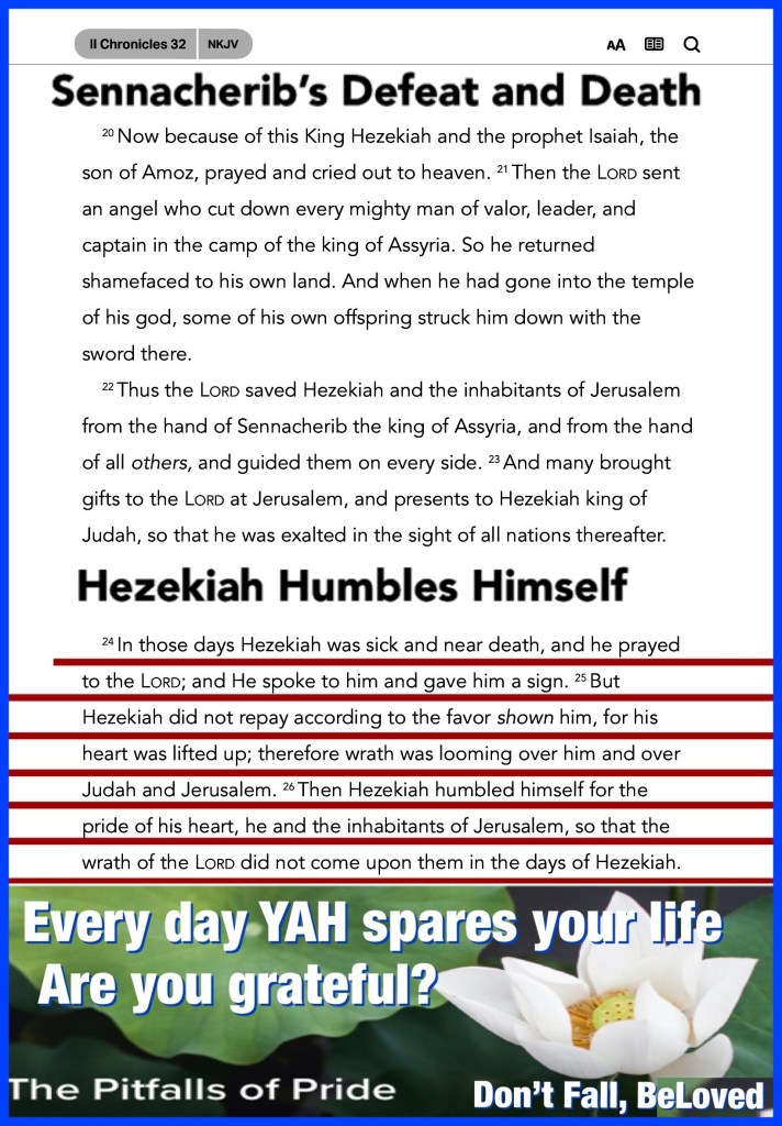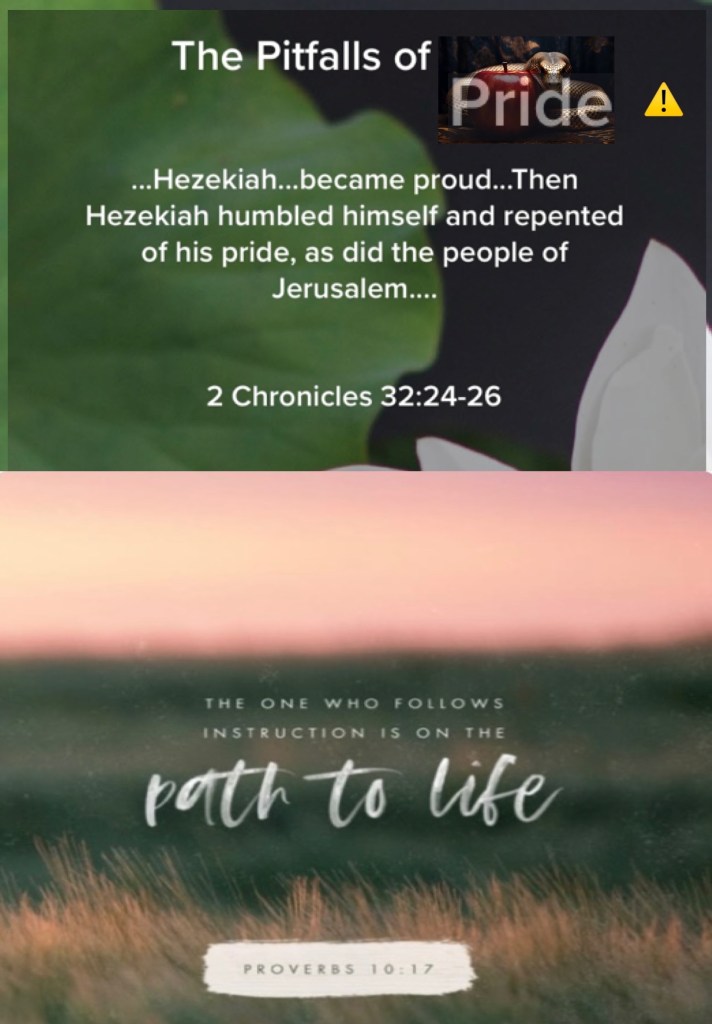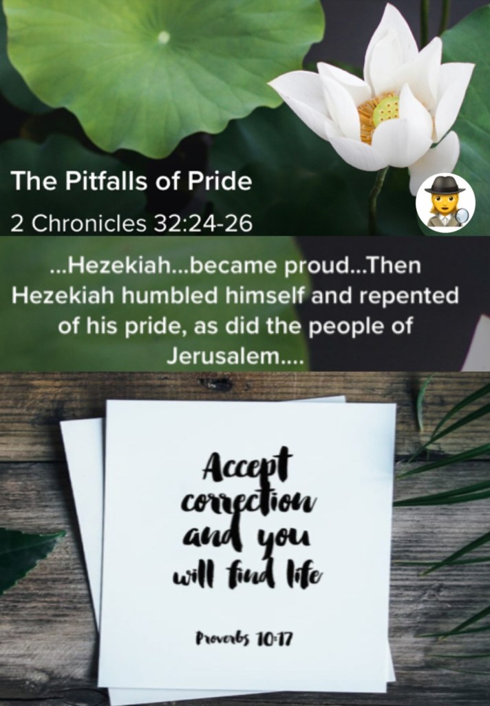 “In those days Hezekiah was sick and near death, and he prayed to the Lord; and He spoke to him and gave him a sign. But Hezekiah did not repay according to the favor shown him, for his heart was lifted up; therefore wrath was looming over him and over Judah and Jerusalem. Then Hezekiah humbled himself for the pride of his heart, he and the inhabitants of Jerusalem, so that the wrath of the Lord did not come upon them in the days of Hezekiah.” II Chronicles 32:24-26 “He who keeps instruction is in the way of life, But he who refuses correction goes astray.” Proverbs 10:17