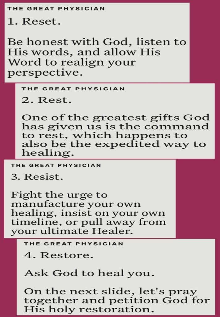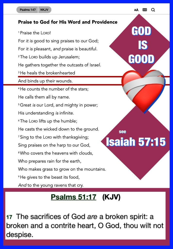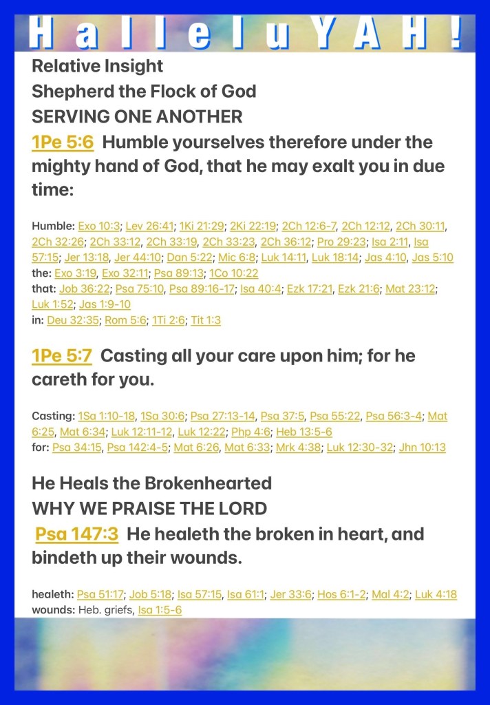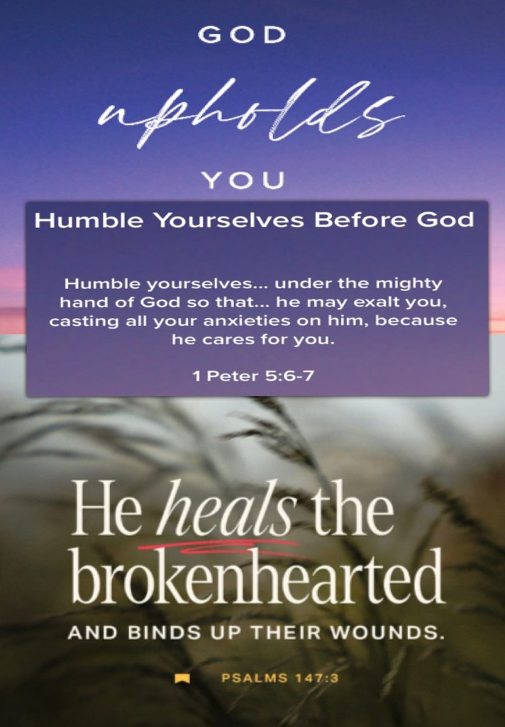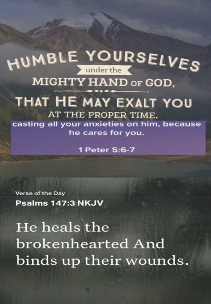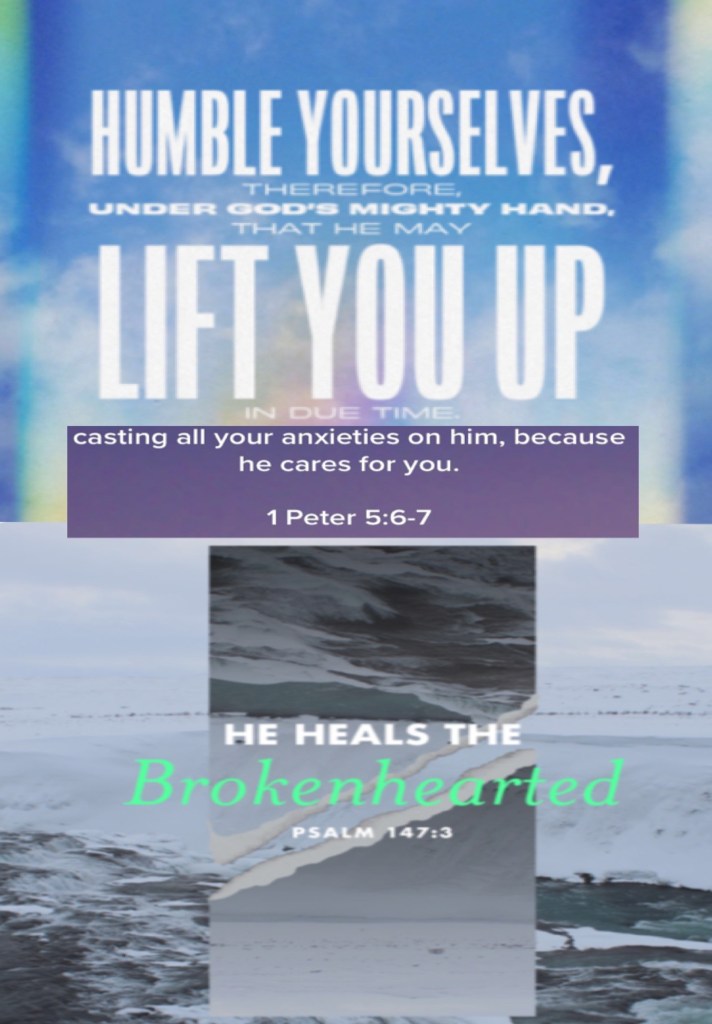βTherefore humble yourselves under the mighty hand of God, that He may exalt you in due time, casting all your care upon Him, for He cares for you.β I Peter 5:6-7 βHe heals the brokenhearted And binds up their wounds.β Psalms 147:3