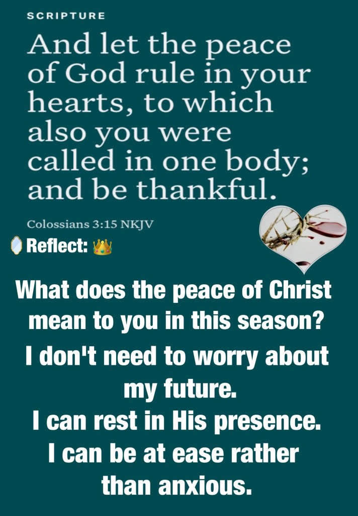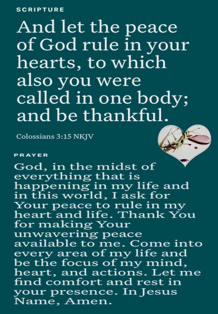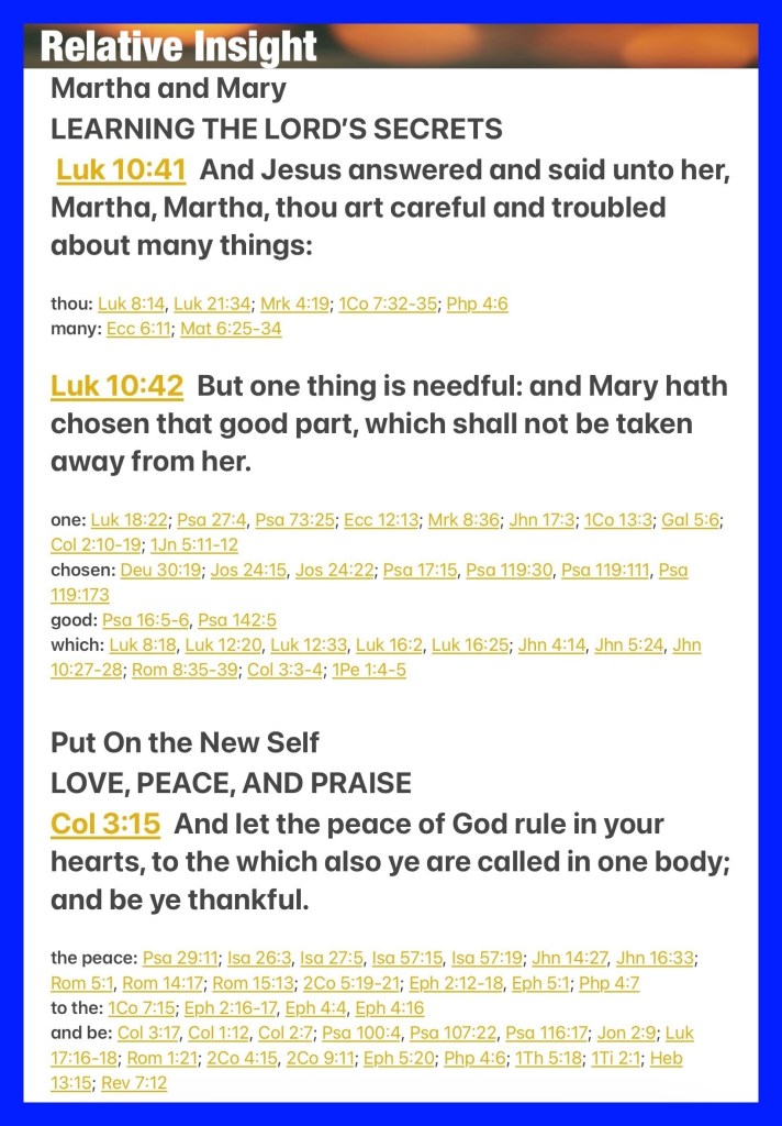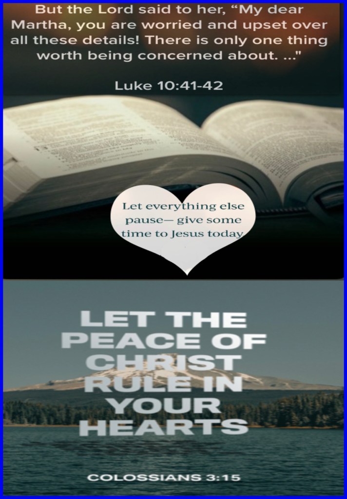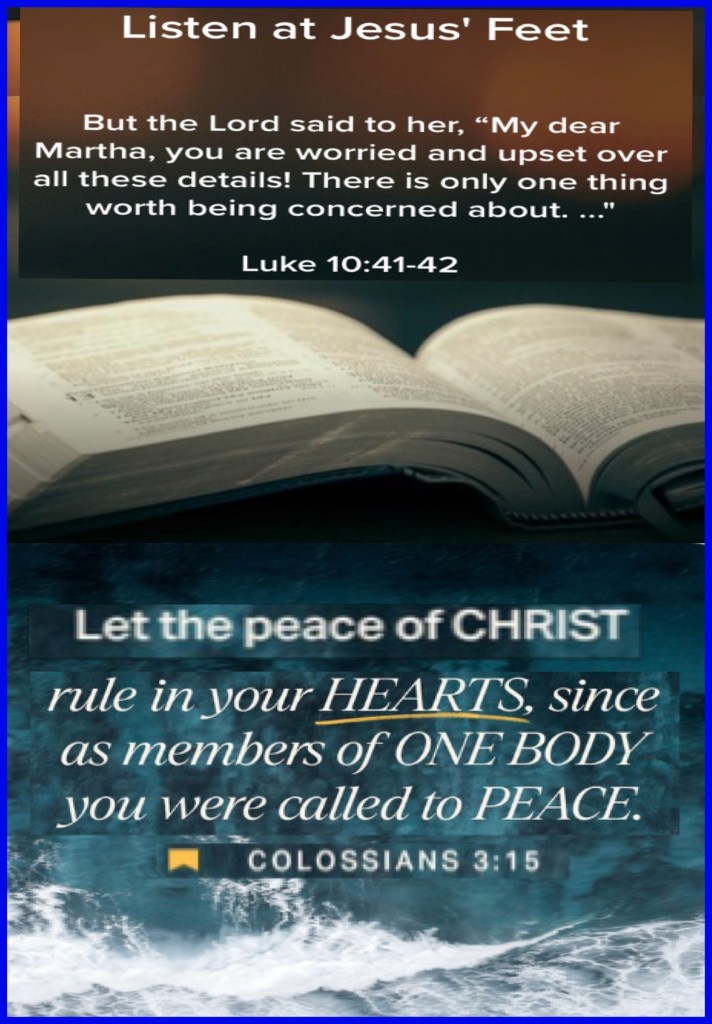 “And Jesus answered and said to her, “Martha, Martha, you are worried and troubled about many things. But one thing is needed, and Mary has chosen that good part, which will not be taken away from her.”” Luke 10:41-42 “And let the peace of God rule in your hearts, to which also you were called in one body; and be thankful.” Colossians 3:15