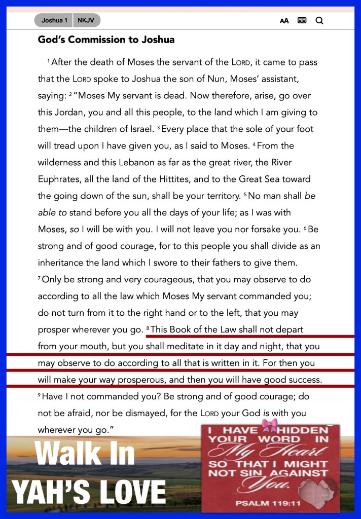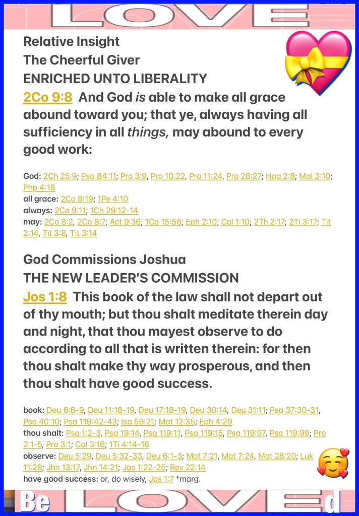 “And God is able to make all grace abound toward you, that you, always having all sufficiency in all things, may have an abundance for every good work.” II Corinthians 9:8 “This Book of the Law shall not depart from your mouth, but you shall meditate in it day and night, that you may observe to do according to all that is written in it. For then you will make your way prosperous, and then you will have good success.” Joshua 1:8