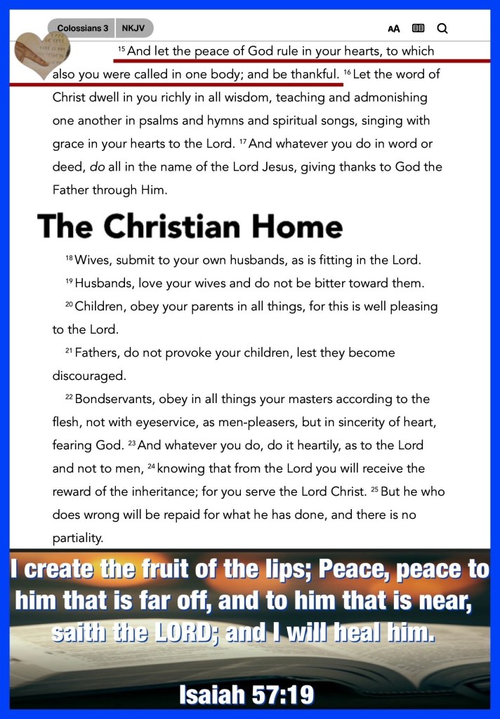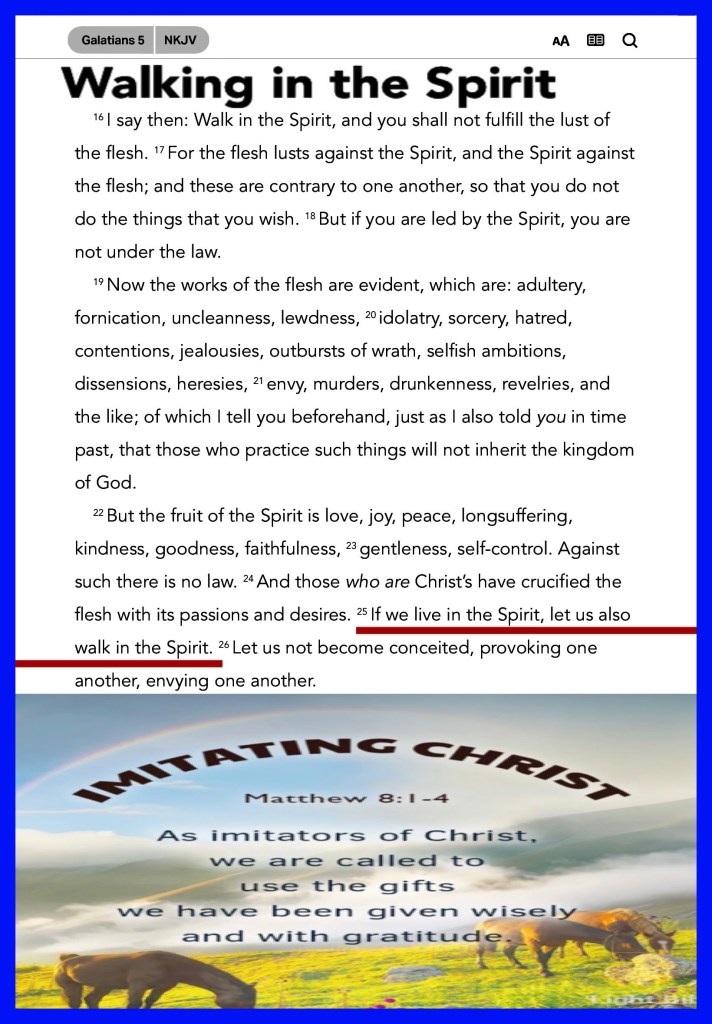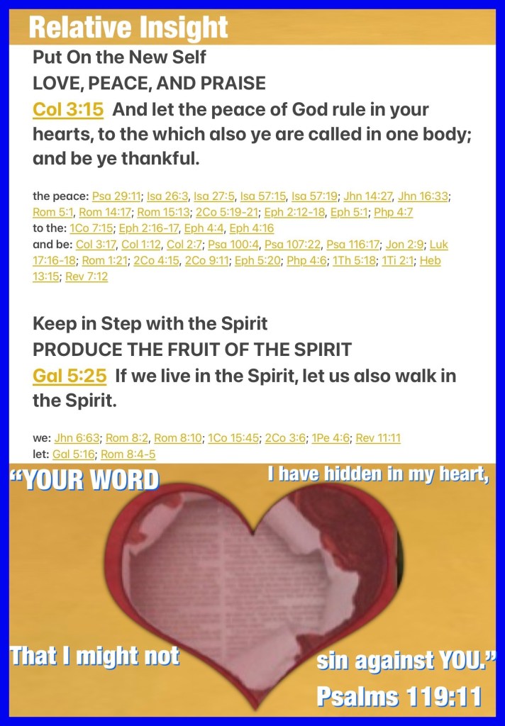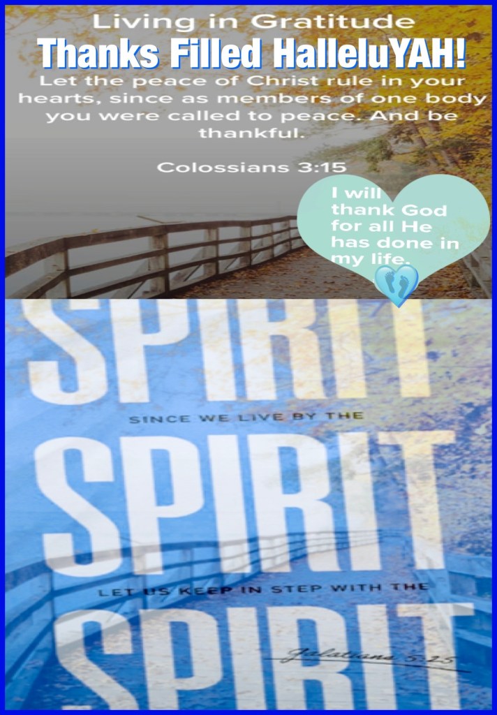 “And let the peace of God rule in your hearts, to which also you were called in one body; and be thankful.” Colossians 3:15 “If we live in the Spirit, let us also walk in the Spirit.” Galatians 5:25