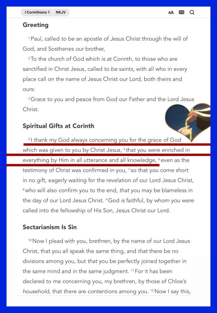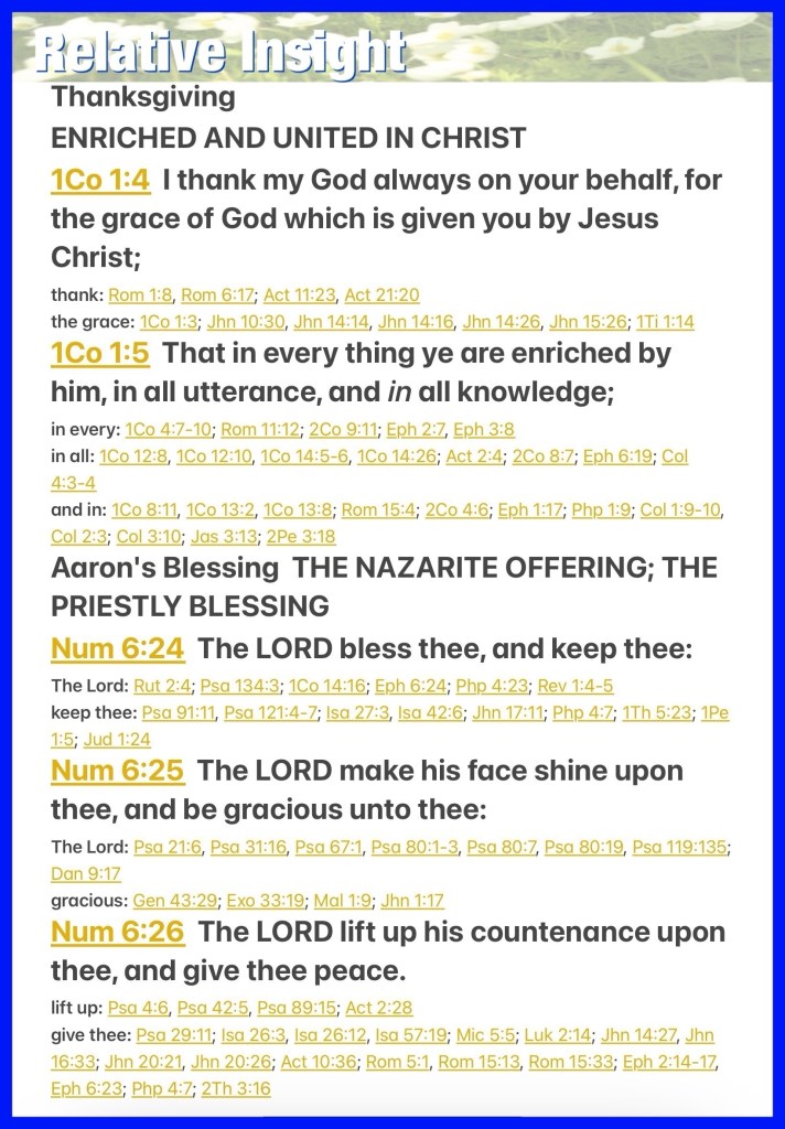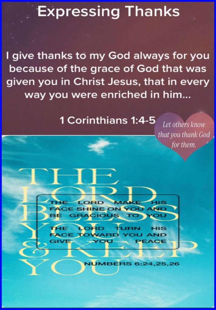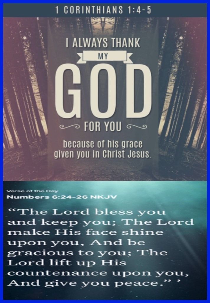 “I thank my God always concerning you for the grace of God which was given to you by Christ Jesus, that you were enriched in everything by Him in all utterance and all knowledge,” I Corinthians 1:4-5 ““The Lord bless you and keep you; The Lord make His face shine upon you, And be gracious to you; The Lord lift up His countenance upon you, And give you peace.” ’” Numbers 6:24-26