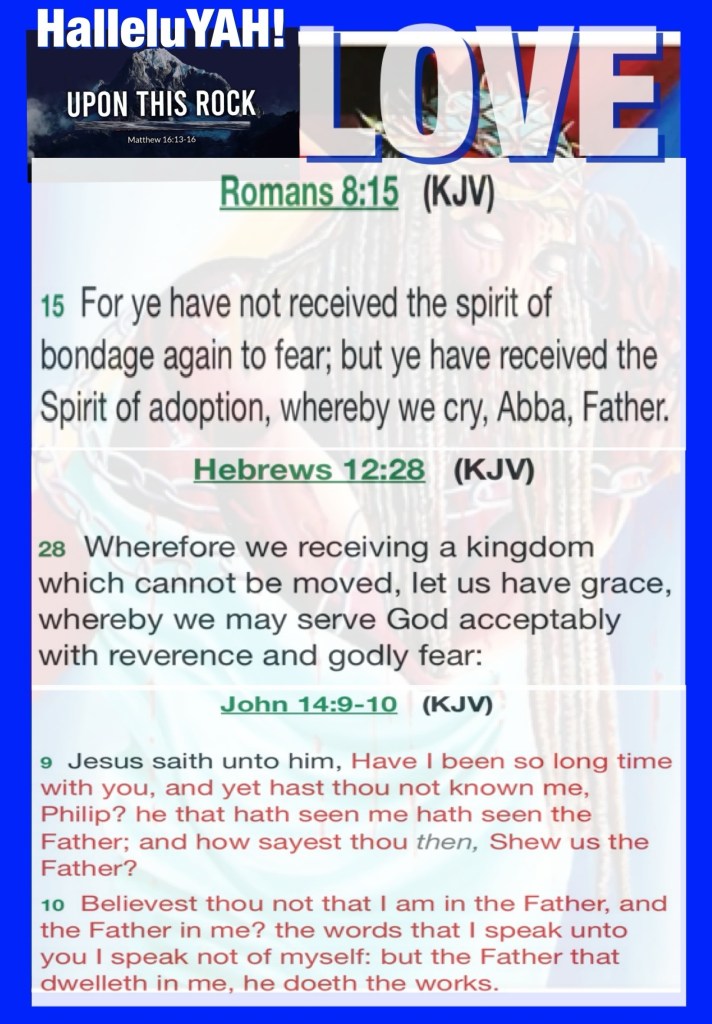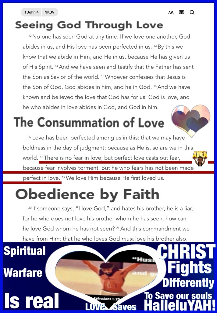 👑YHWH GOD Is LOVE, Speak LOVE, HalleluYAH! May we model the behavior and character of our LORD SAVIOR CHRIST JESUS KING Of Kings; use His WORD to Create the atmosphere of Love in all we do and thereby Honor our Heavenly FATHER CREATOR GOD. 👑Romans 12:14 Bless them which persecute you: bless, and curse not. 👑Luke 1:74-75 That he would grant unto us, that we being delivered out of the hand of our enemies might serve him without fear, In holiness and righteousness before him, all the days of our life. 1Jn 4:13 Hereby know we that we dwell in him, and he in us, because he hath given us of his Spirit.